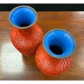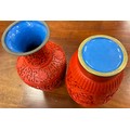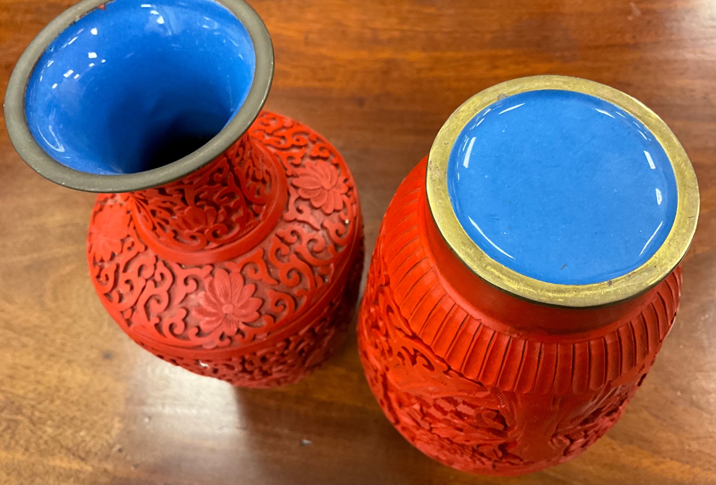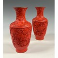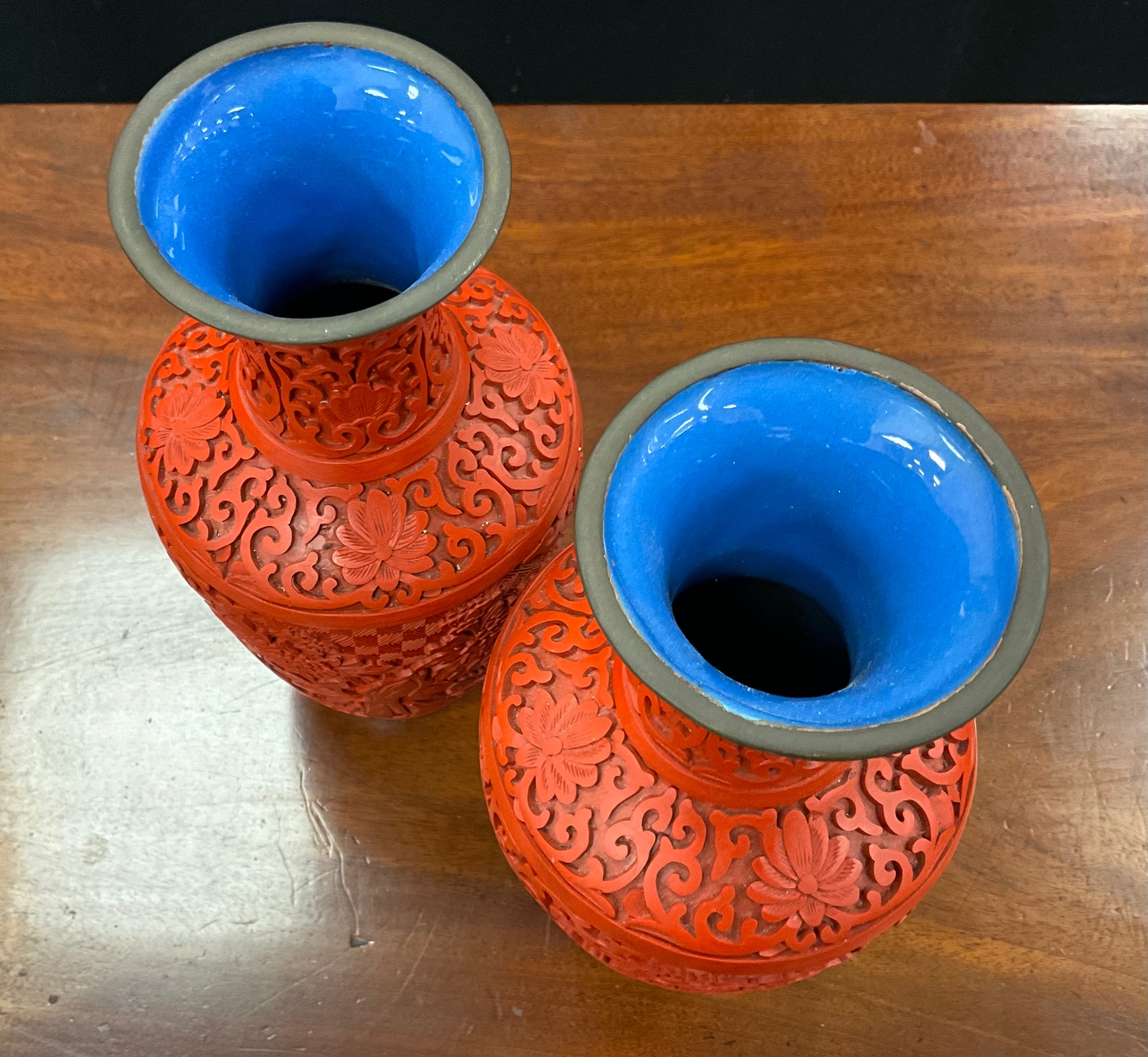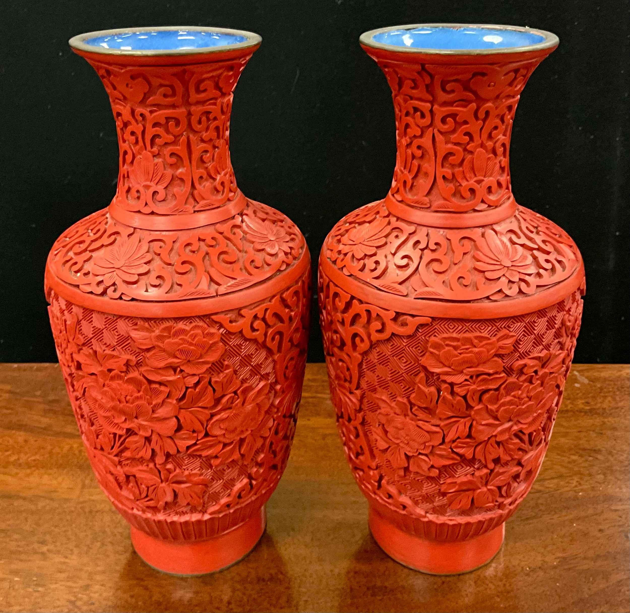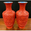A pair of Chinese cinnabar lacquer baluster vases, carved with chrysanthemums on scrolling ruyi, enamel glazed interiors in mid blue, 24cm high overall (2).