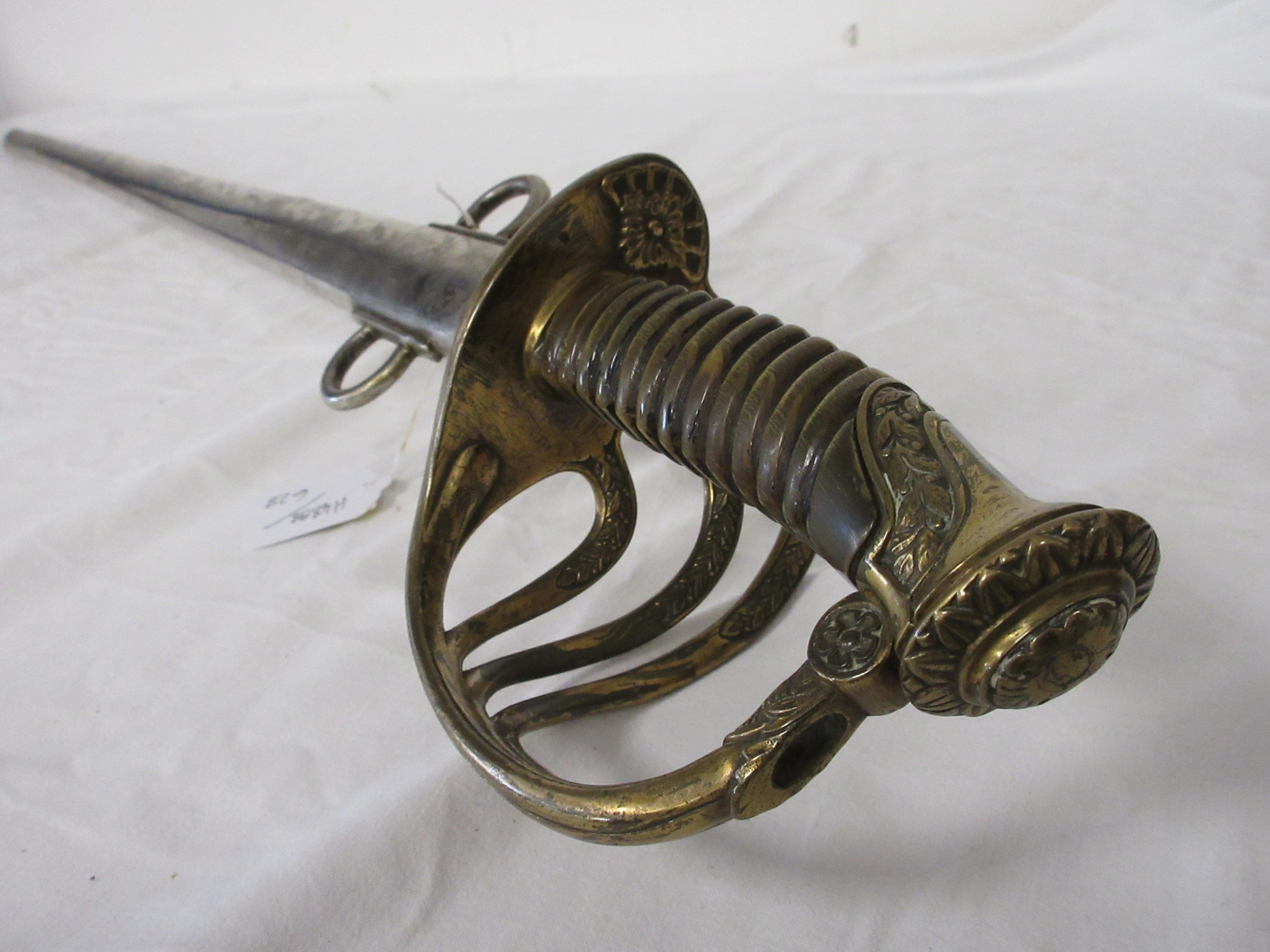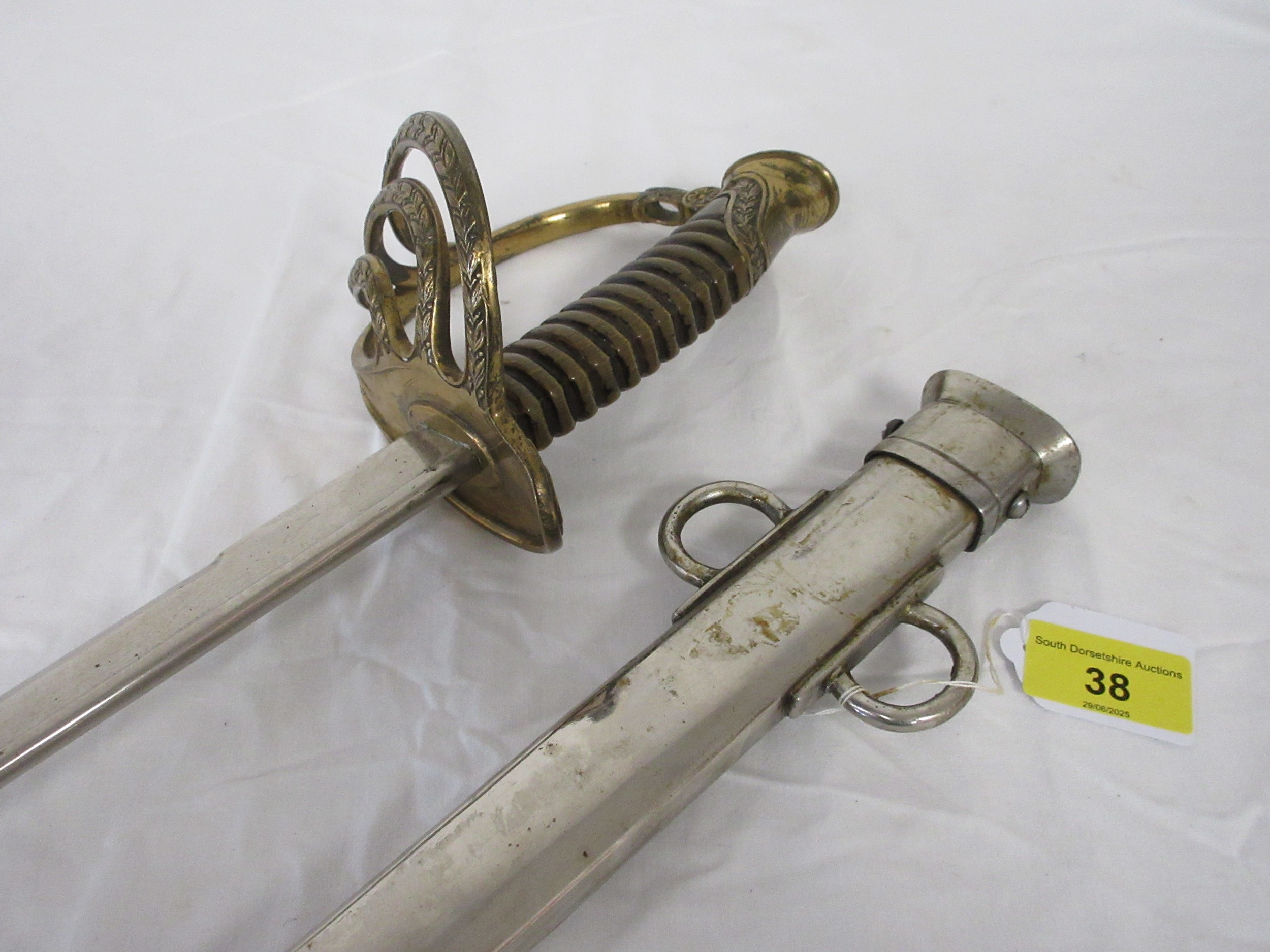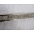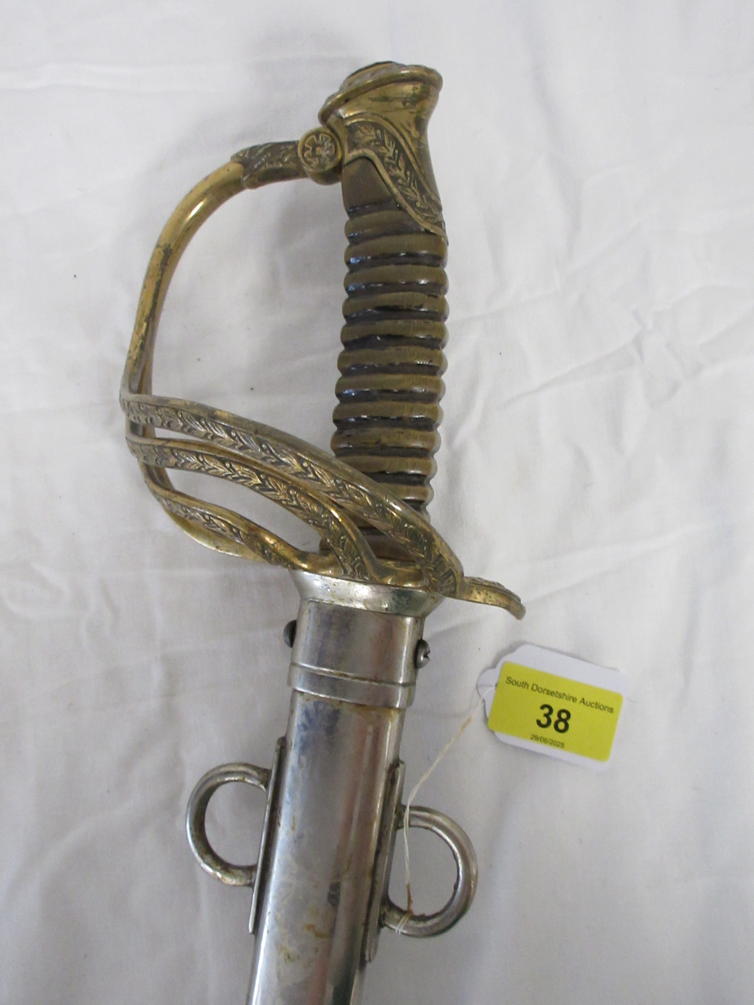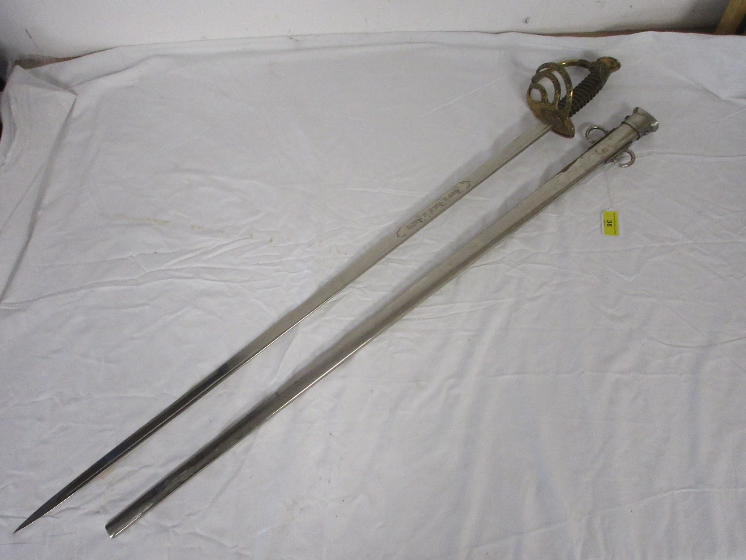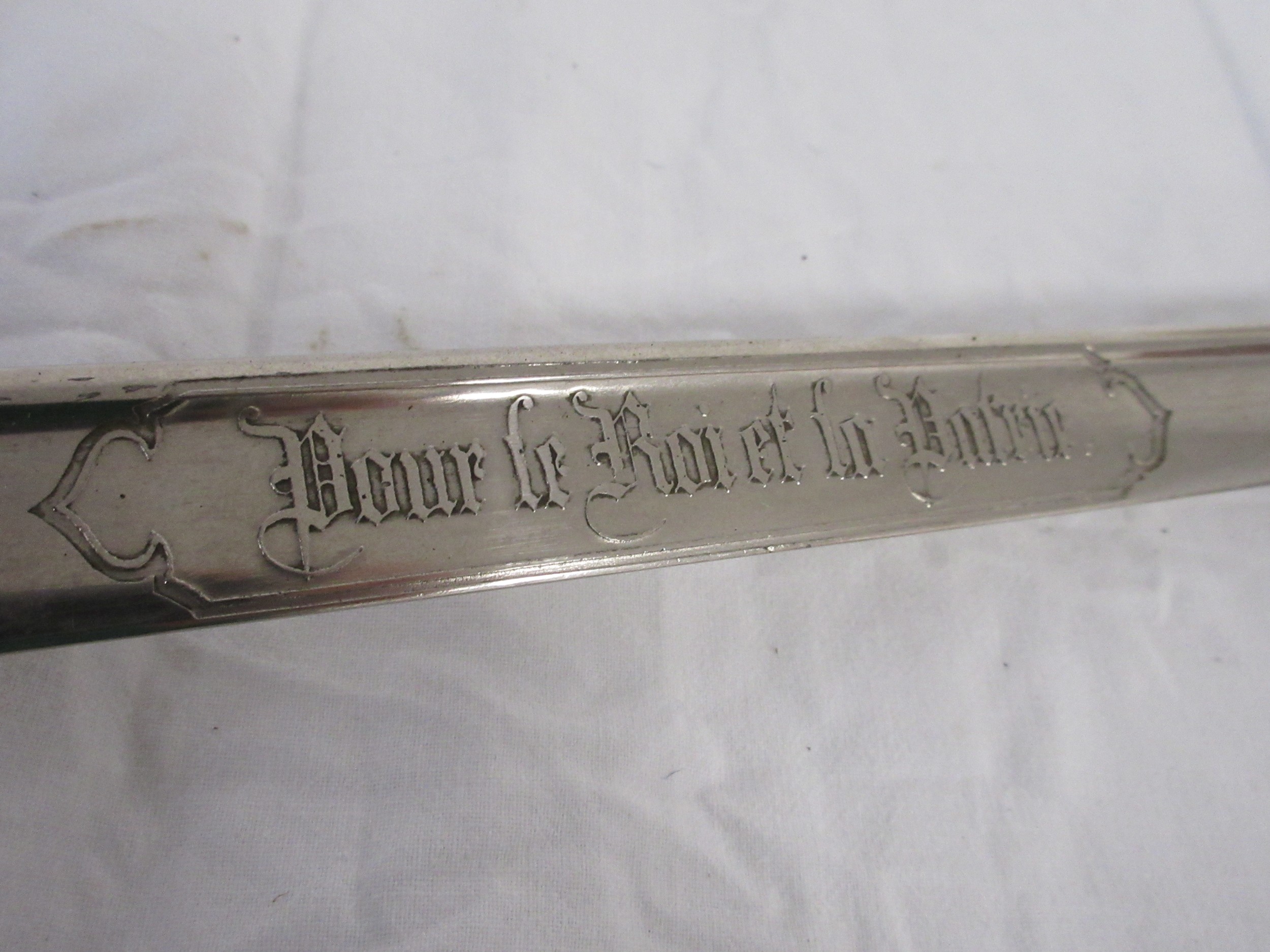 A 19th century French Army Officers sword etched to the blade Pour le Roi et La Patrie (For the King and the Fatherland) in its steel scabbard. Having a 89.5cms straight blade