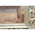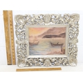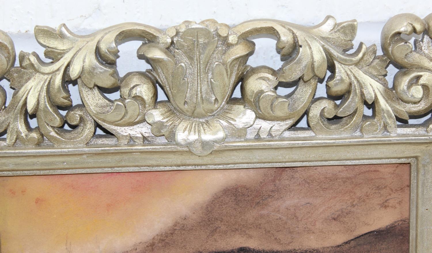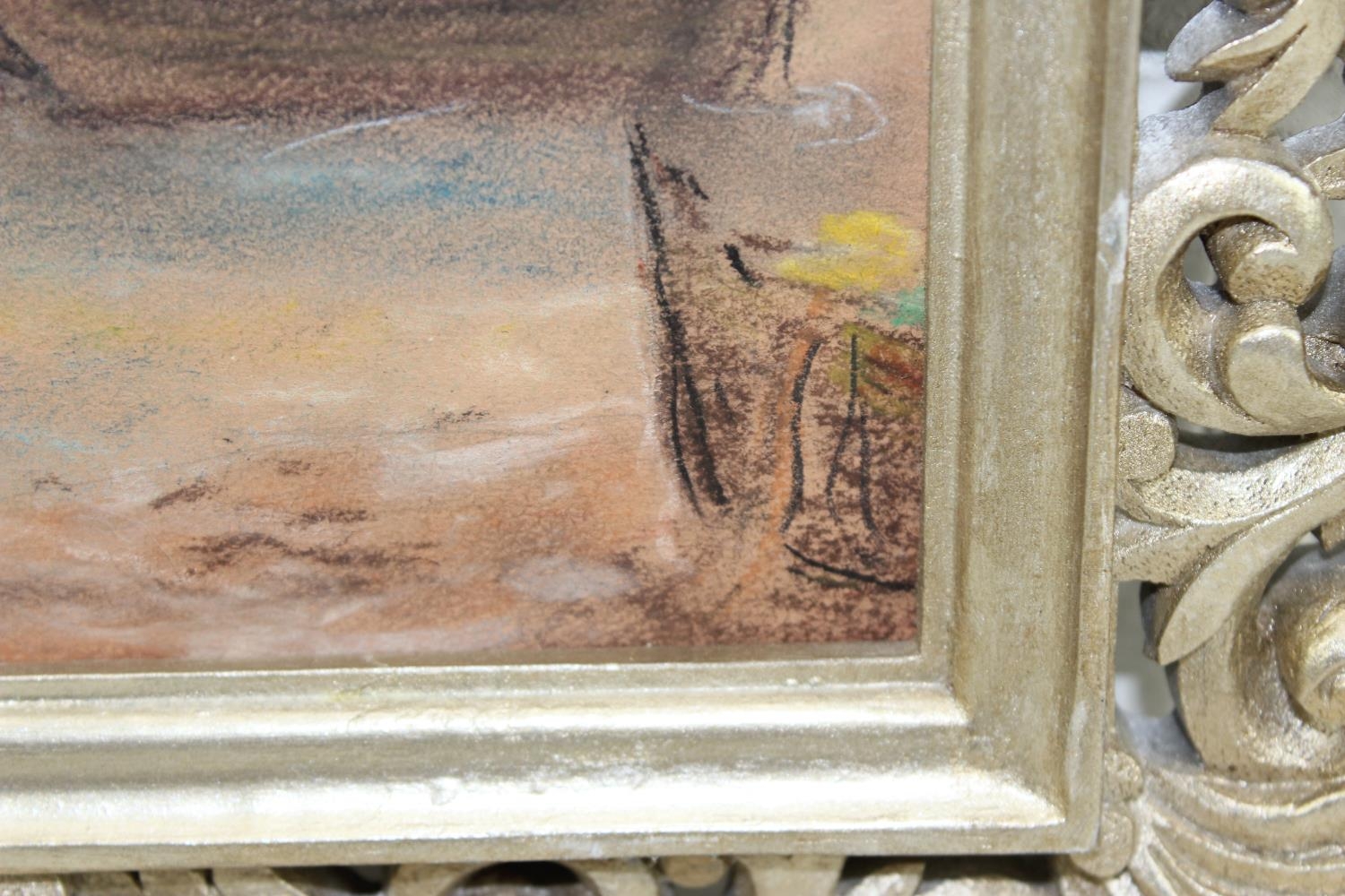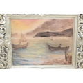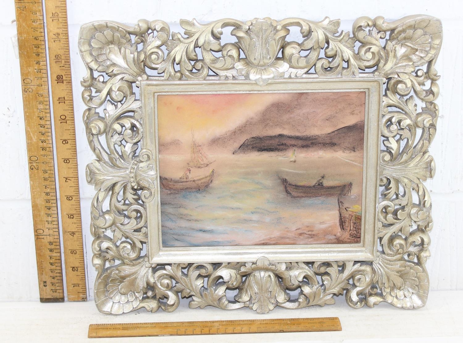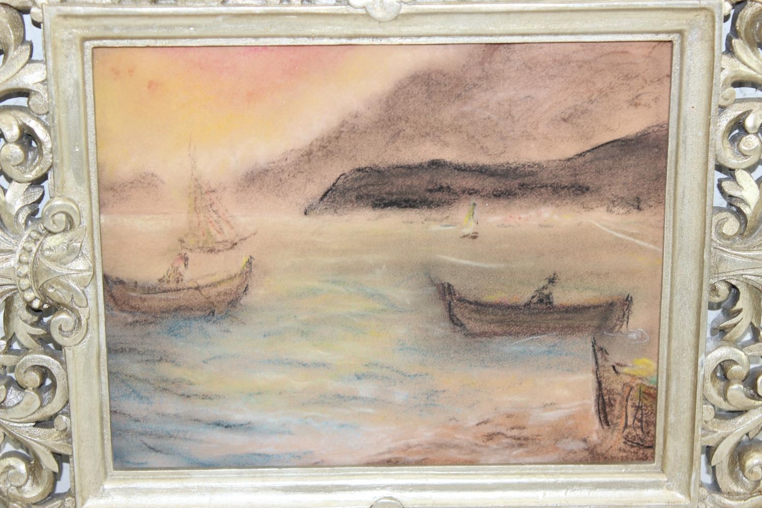 Vintage pastel of boats at sunset, unsigned in impressive frame