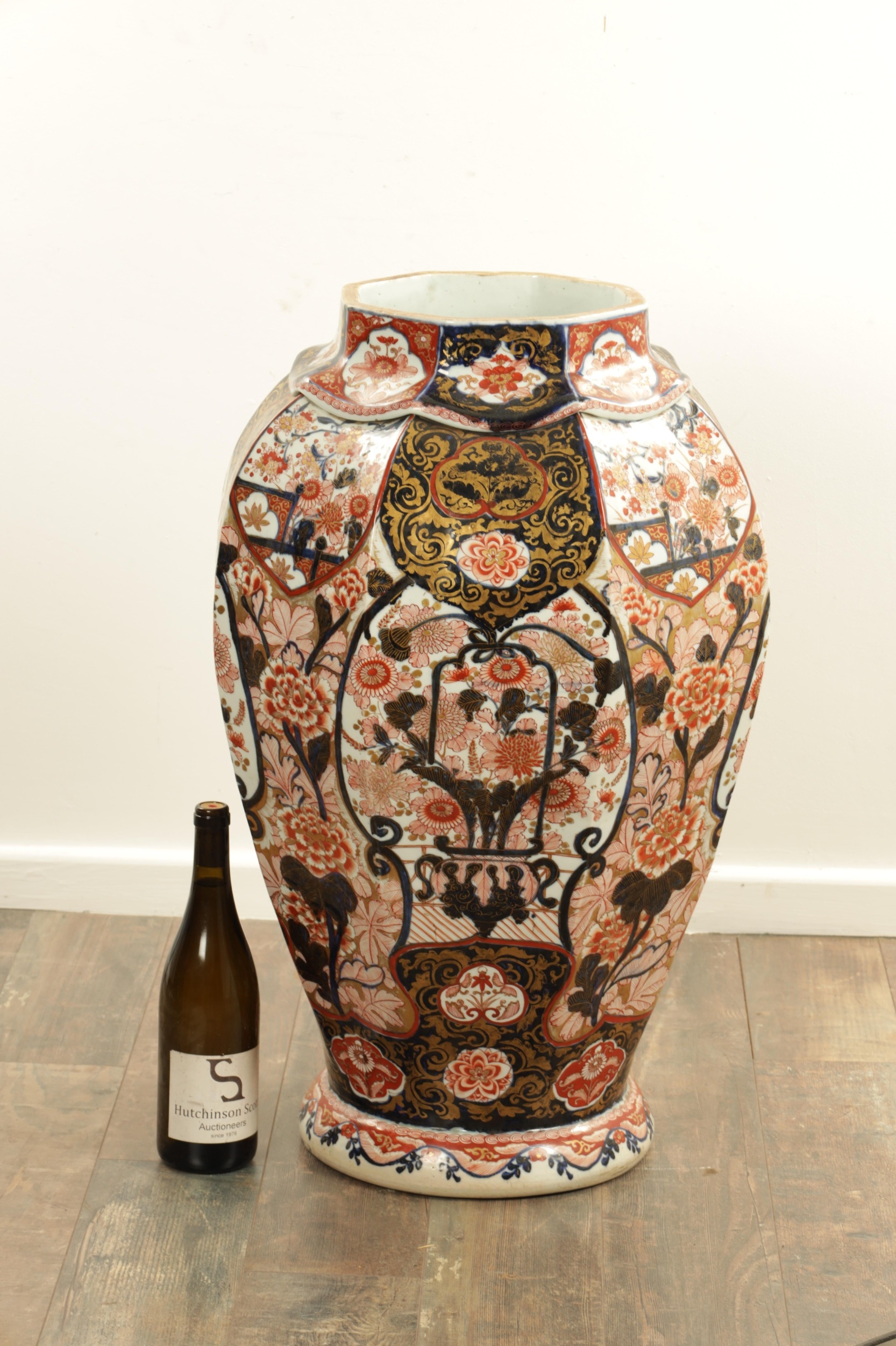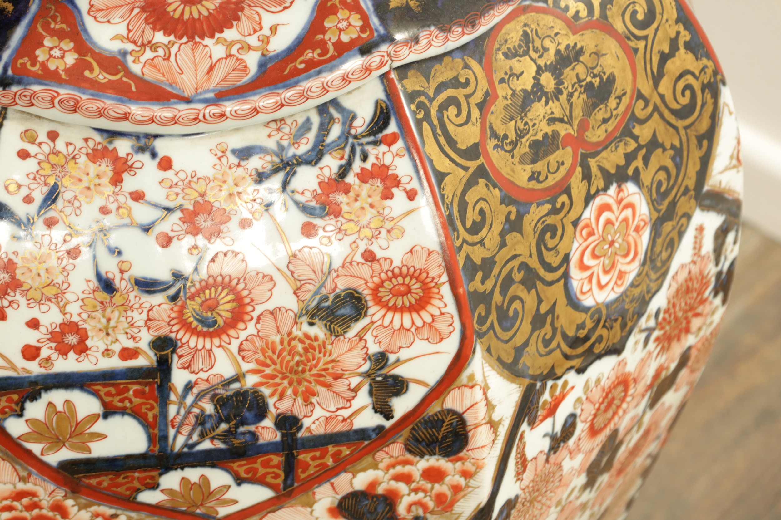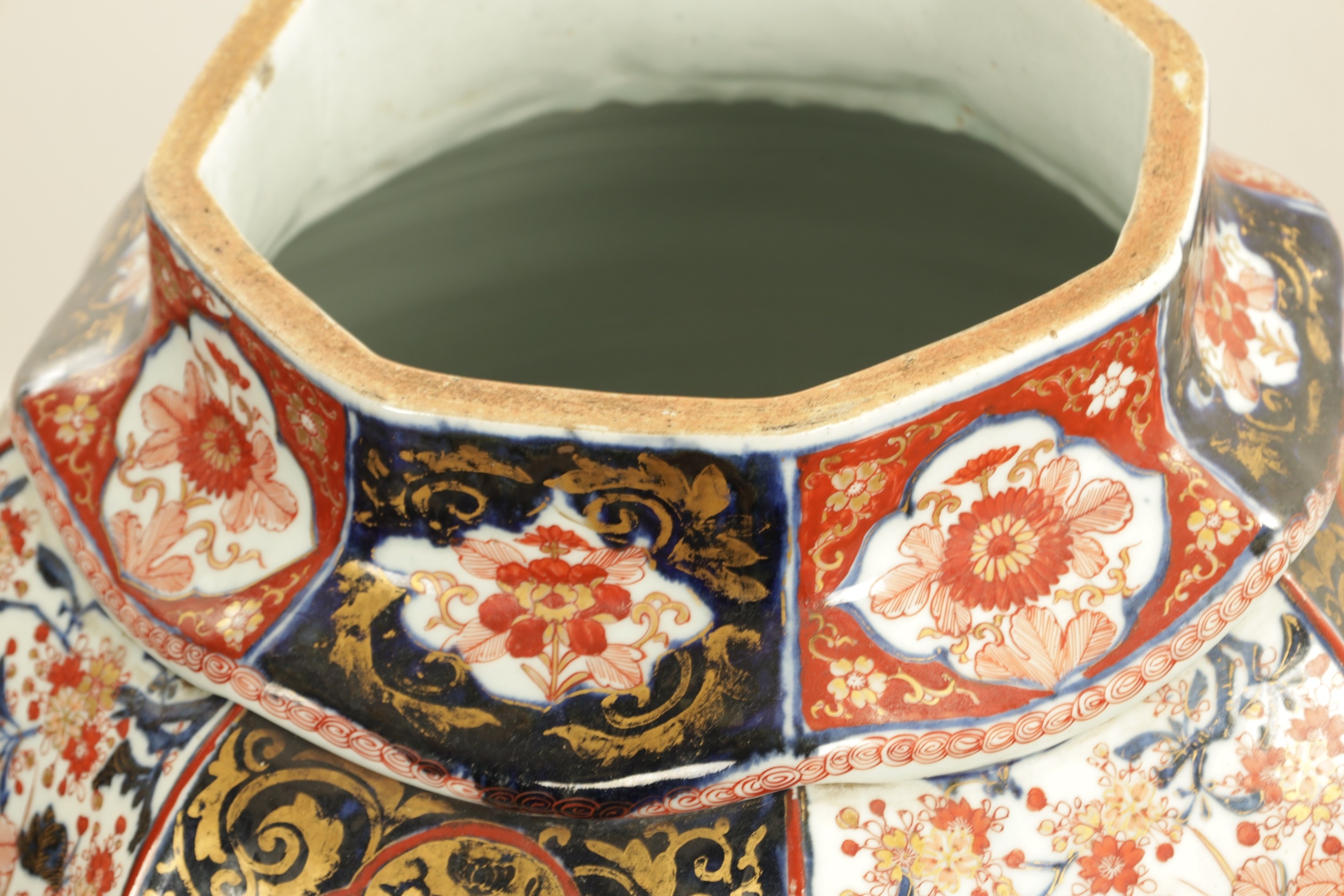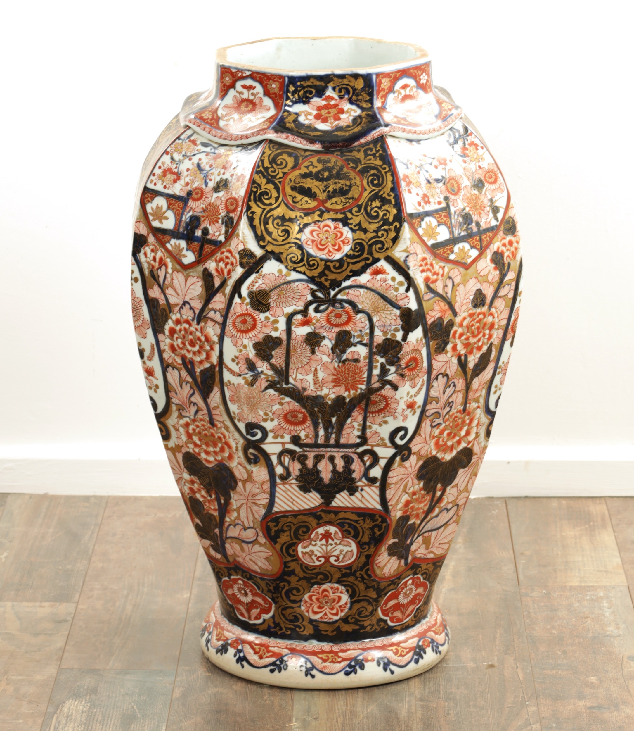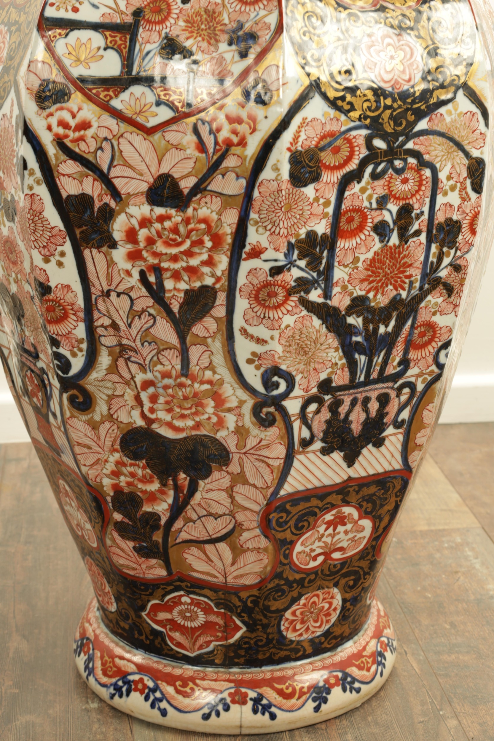 AN IMPRESSIVE 17TH/18TH CENTURY JAPANESE IMARI OCTAGONAL PANELLED HALL VASE the shouldered slender ovoid body richly decorated with detailed blooming chrysanthemum and floral panels highlighted in gilding beneath a scalloped applied neckband; on a rounded foot. (71cm high)