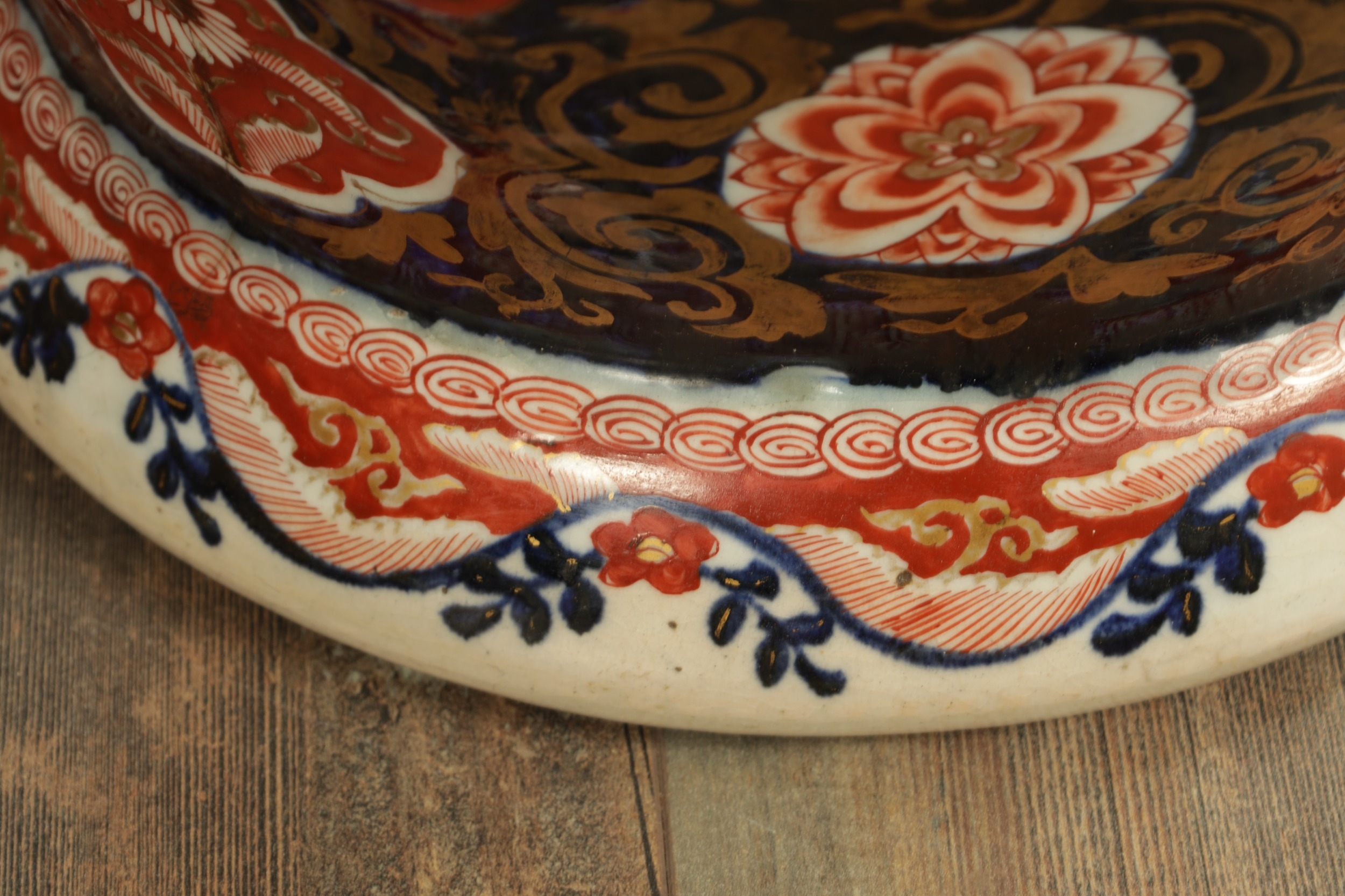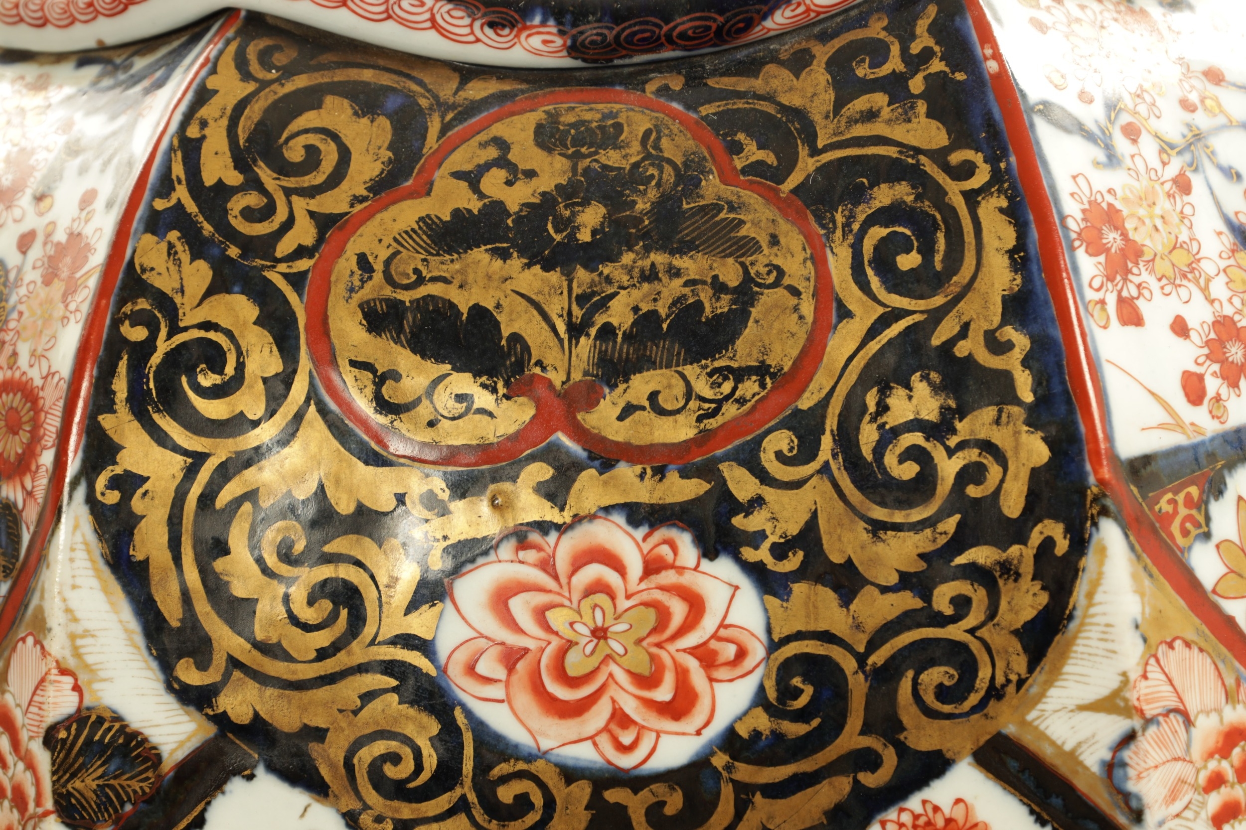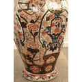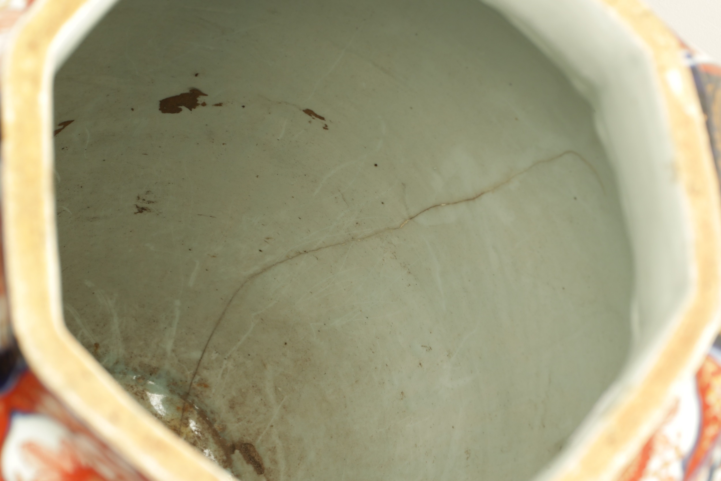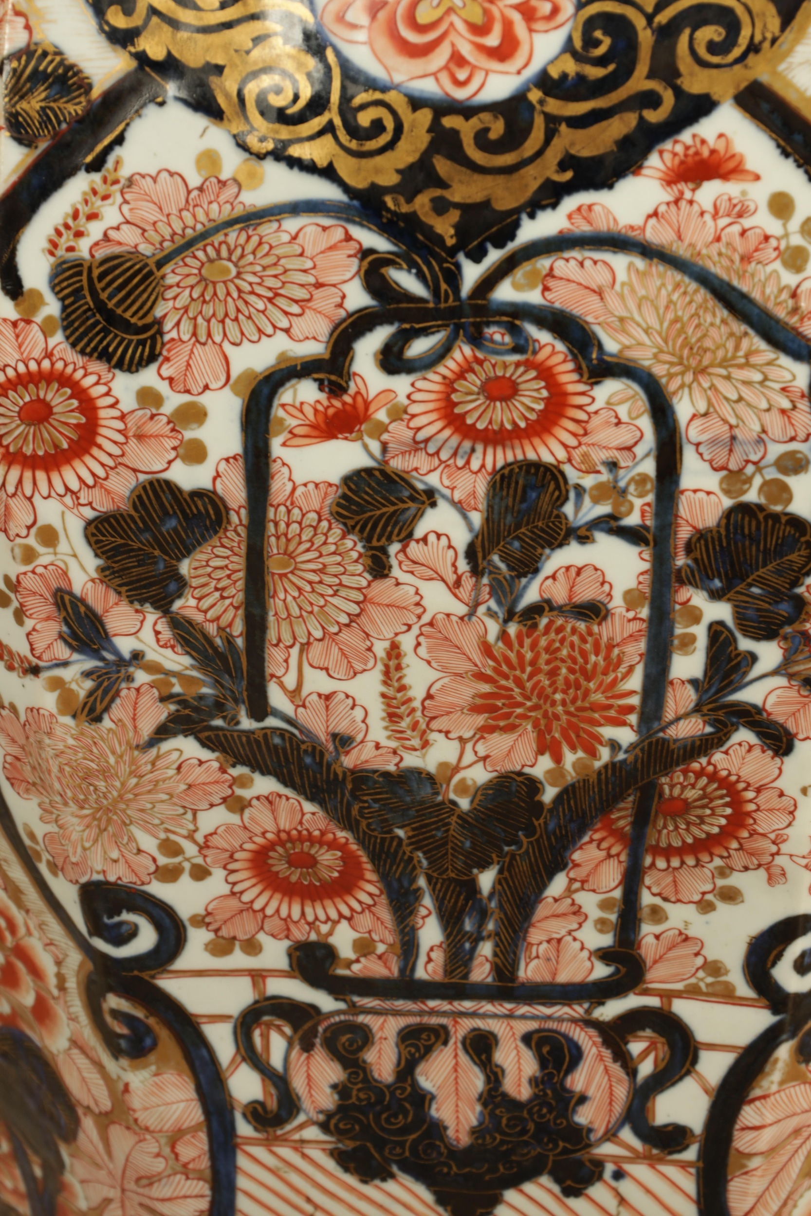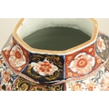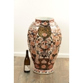 AN IMPRESSIVE 17TH/18TH CENTURY JAPANESE IMARI OCTAGONAL PANELLED HALL VASE the shouldered slender ovoid body richly decorated with detailed blooming chrysanthemum and floral panels highlighted in gilding beneath a scalloped applied neckband; on a rounded foot. (71cm high)