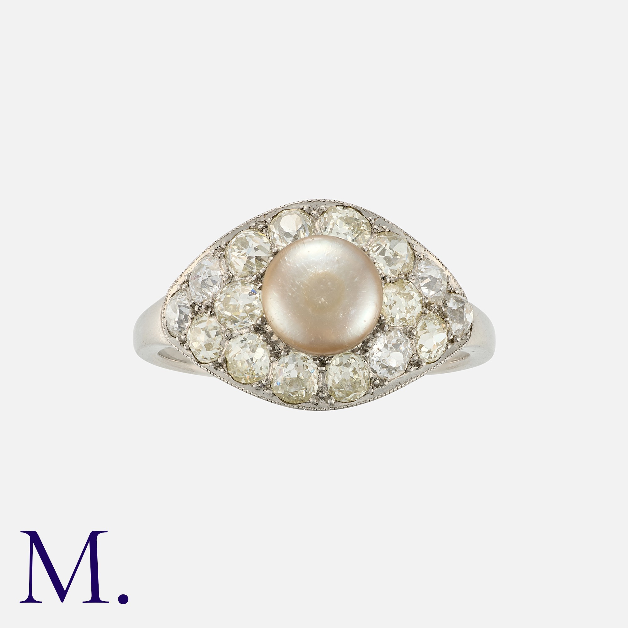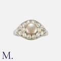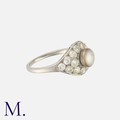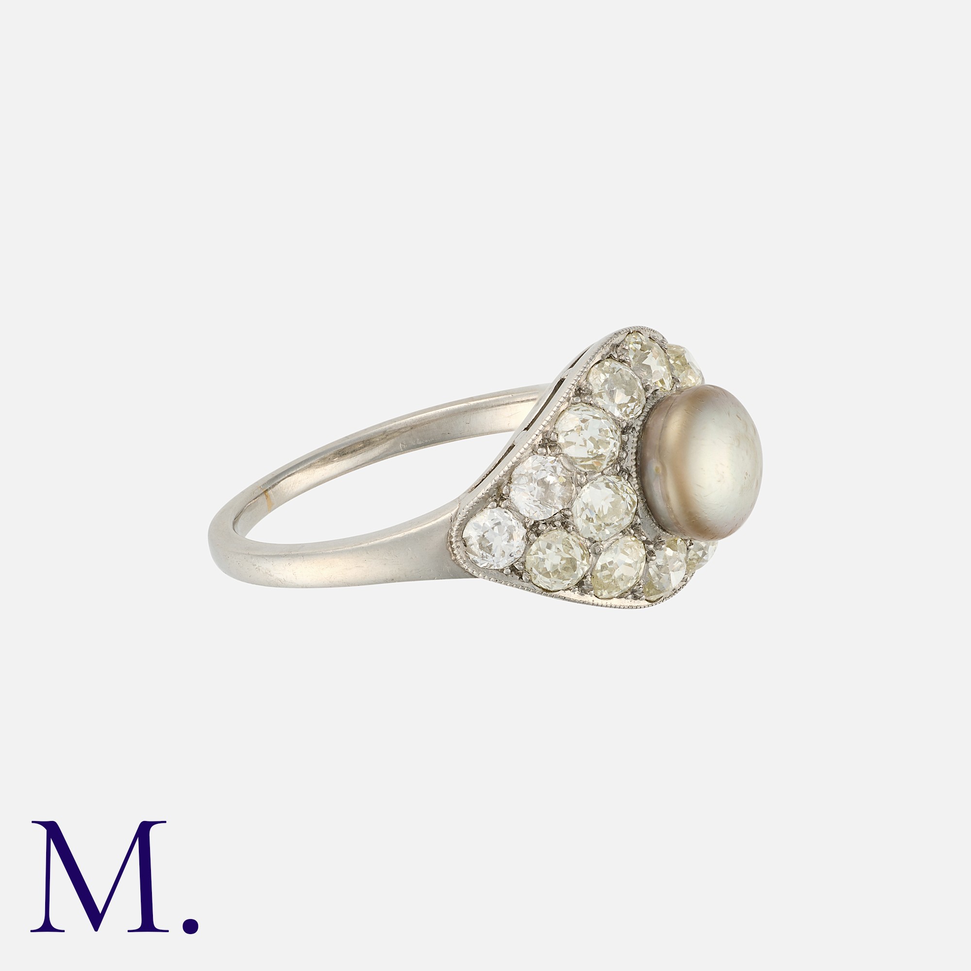An Art Deco Pearl and Diamond Ring in platinum, set with a button shaped grey pearl measuring approximately 6.9mm, within a border of old cut diamonds totalling approximately 1.50 carats. Unmarked, tests indicate platinum.