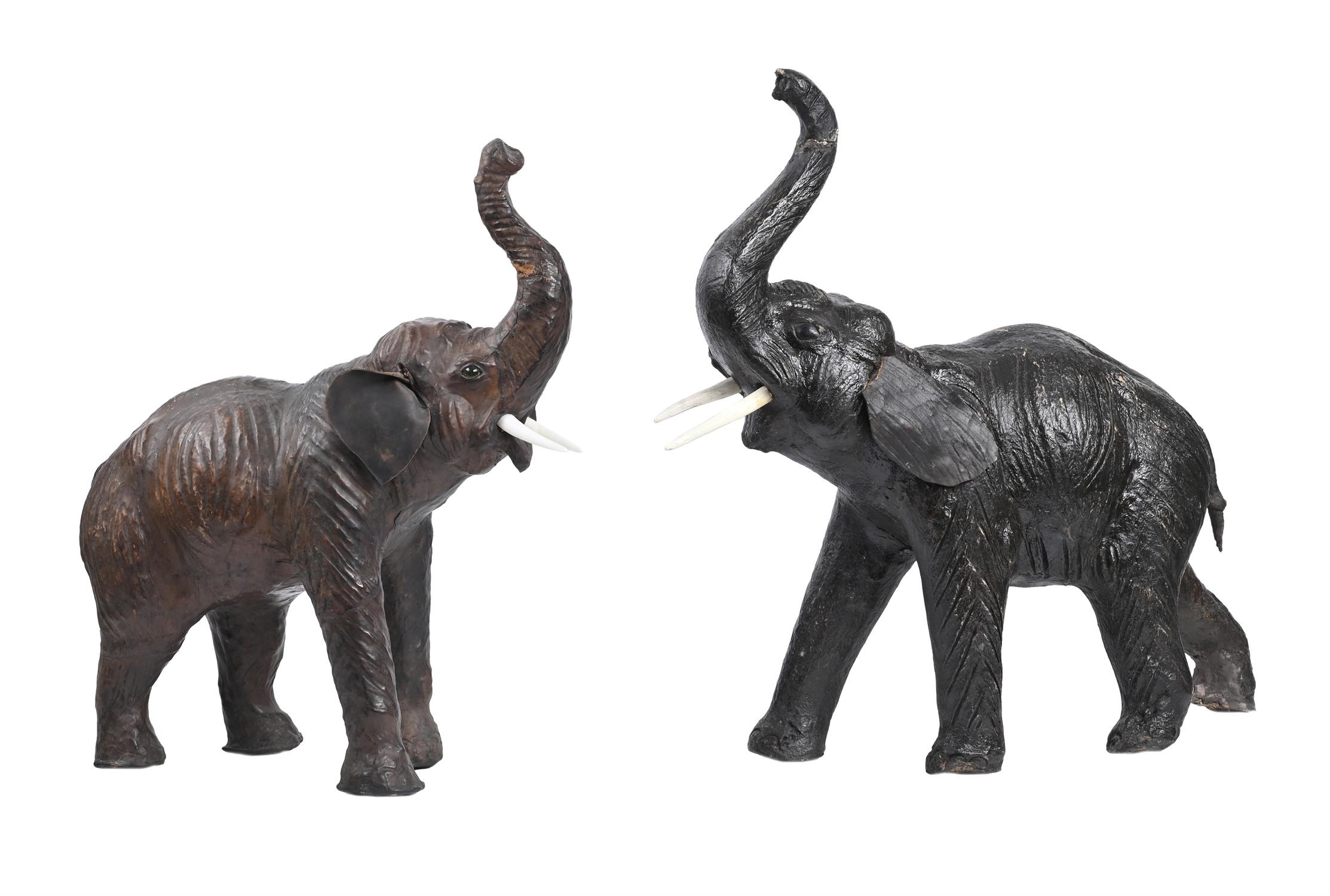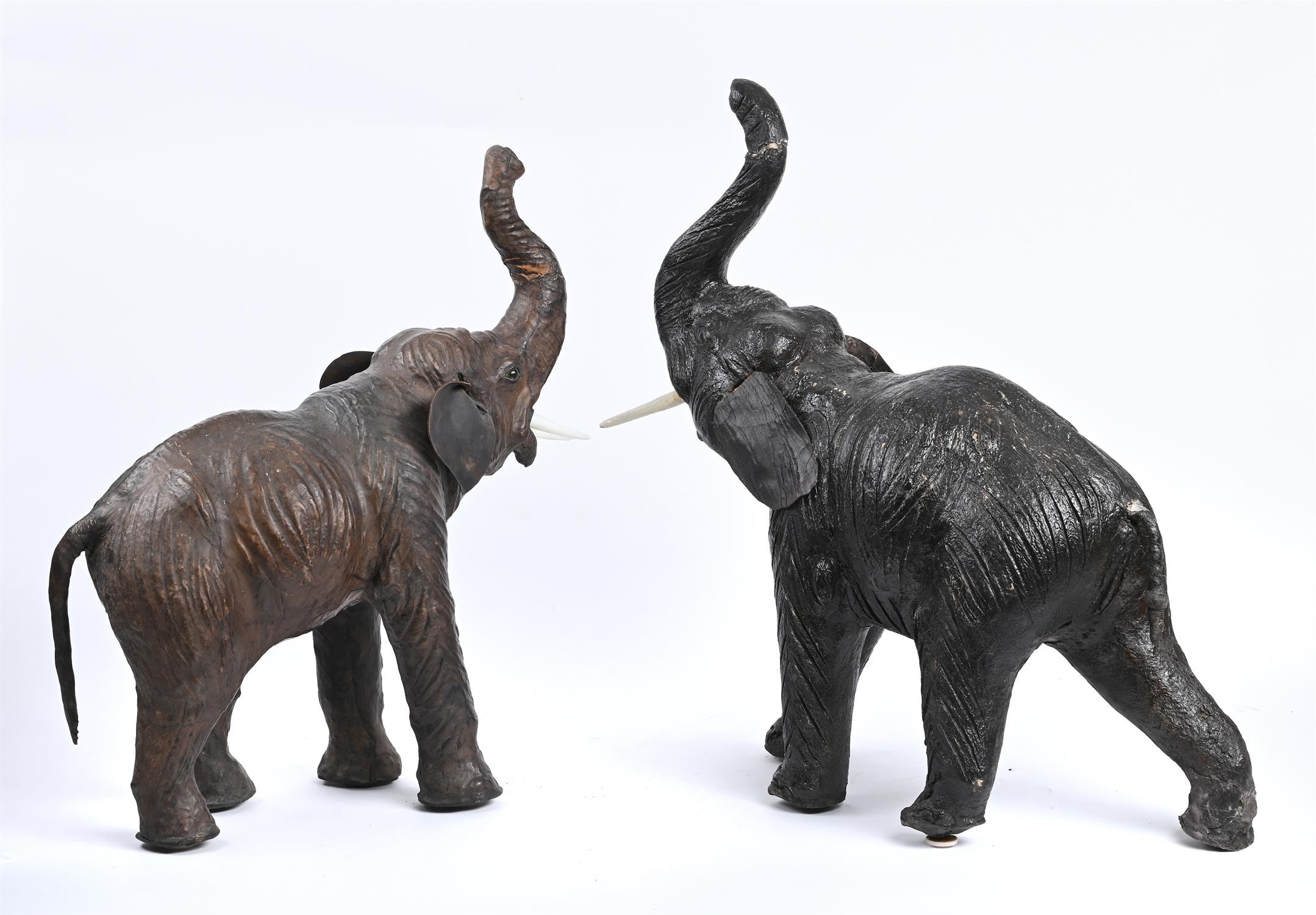 ATTRIBUTED TO OMERSA FOR LIBERTY, A LEATHER ELEPHANT FOOTSTOOL FIRST HALF 20TH CENTURY With glass eyes and simulated tusks 61cm highTOGETHER WITH ANOTHER, SIMILAR EXAMPLE