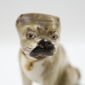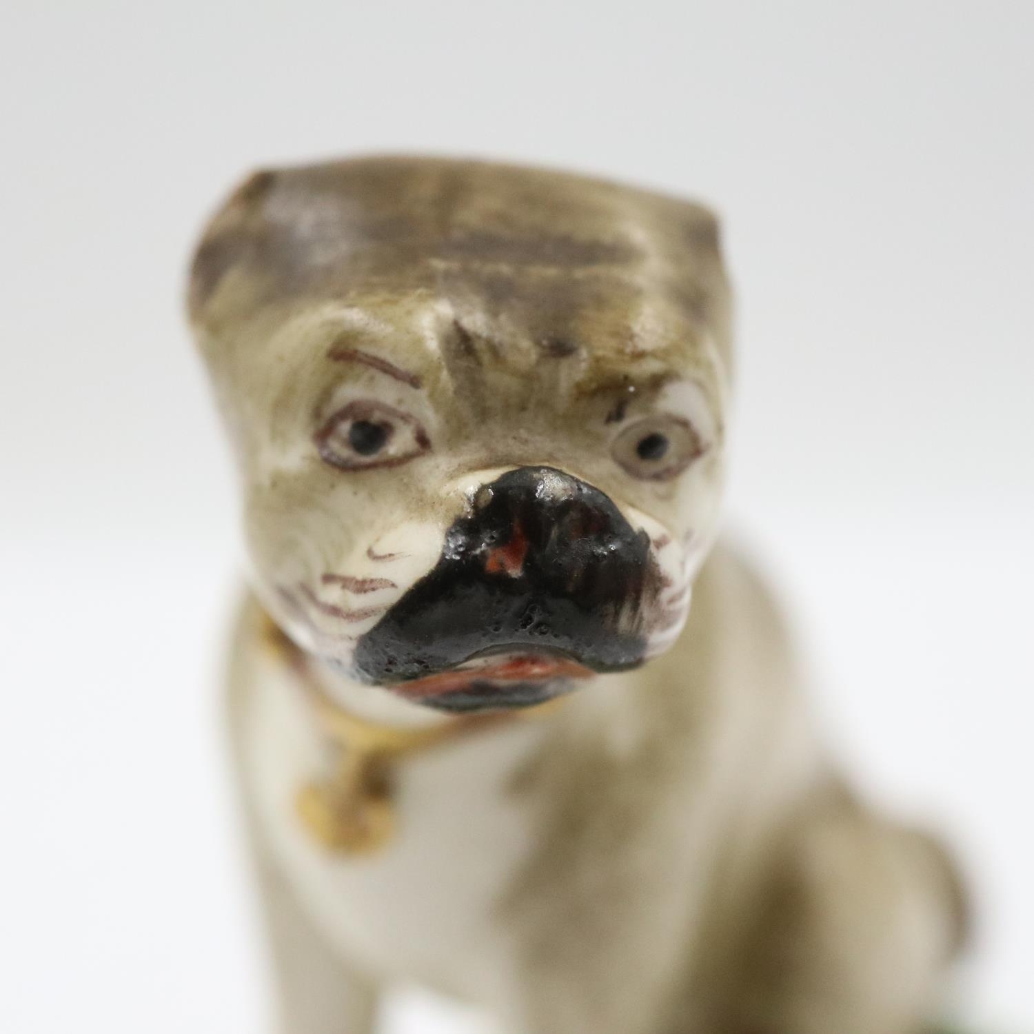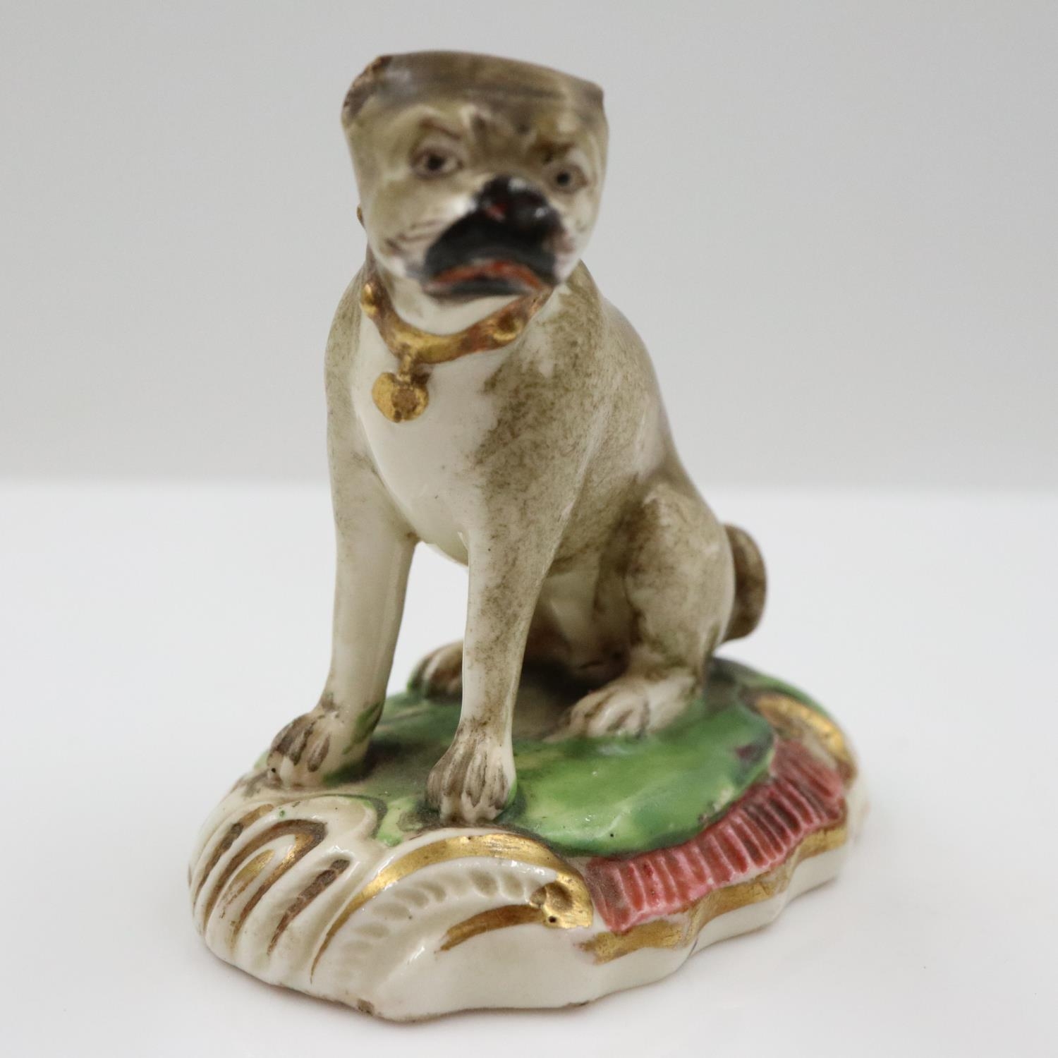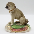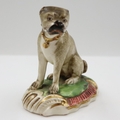 Duesbury Derby model of a seated pug dog on scrolled moulded base, unmarked , c. 1790-95 Derby porcelain 1750/1848, H: 55 mm. UK P&P Group 1 (£18+VAT for the first lot and £2+VAT for subsequent lots)
