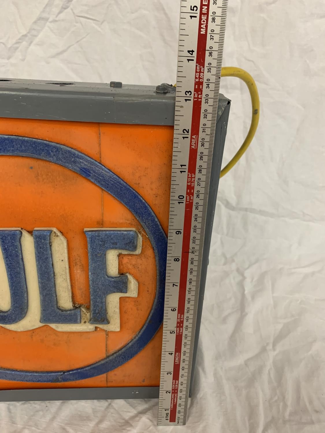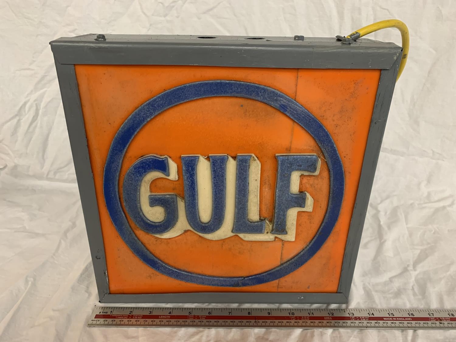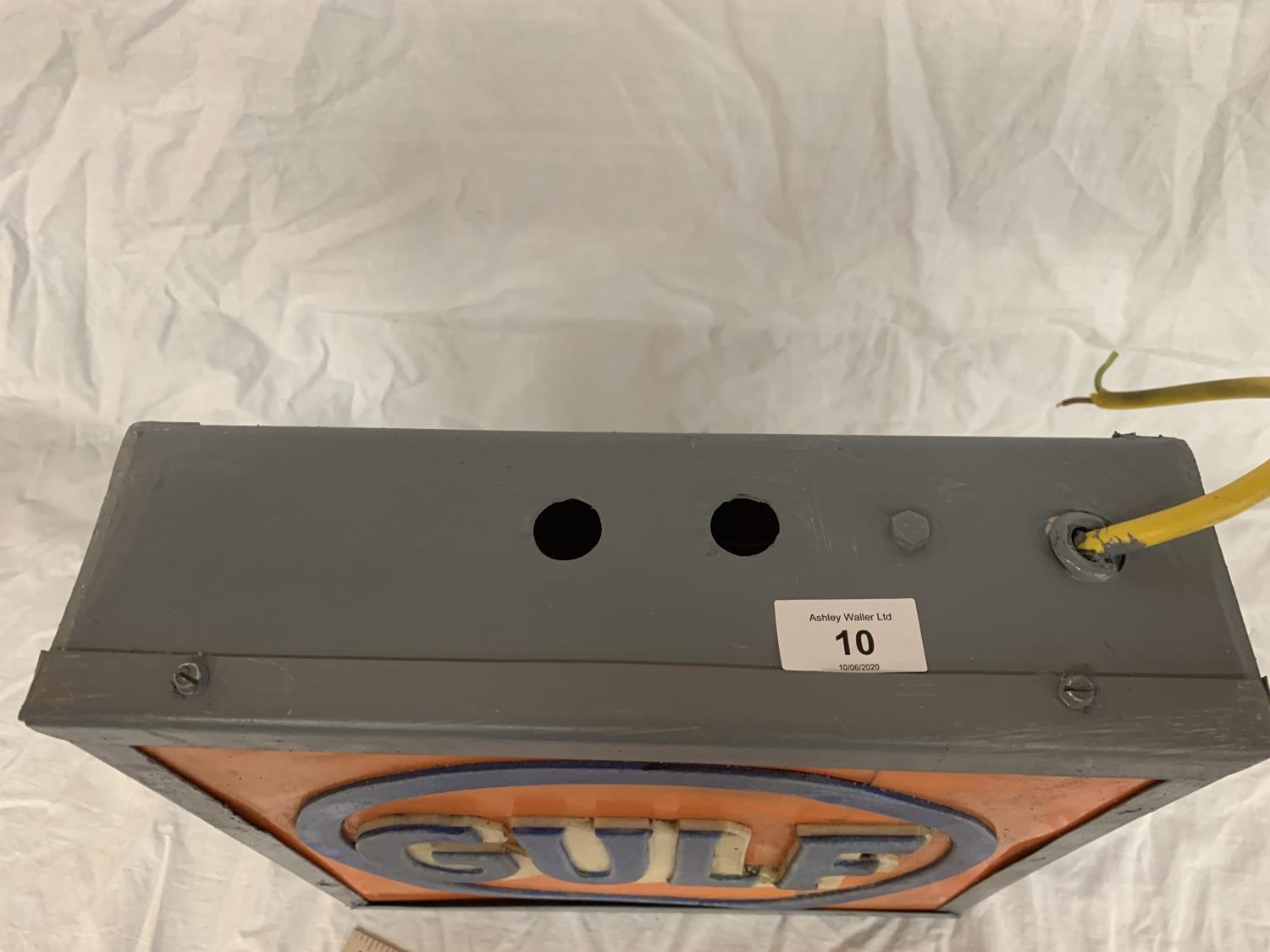 A 'GULF' ILLUMINATED LIGHT BOX SIGN 13 INCHES X 13 INCHES