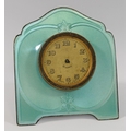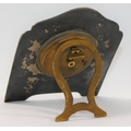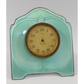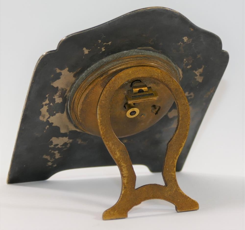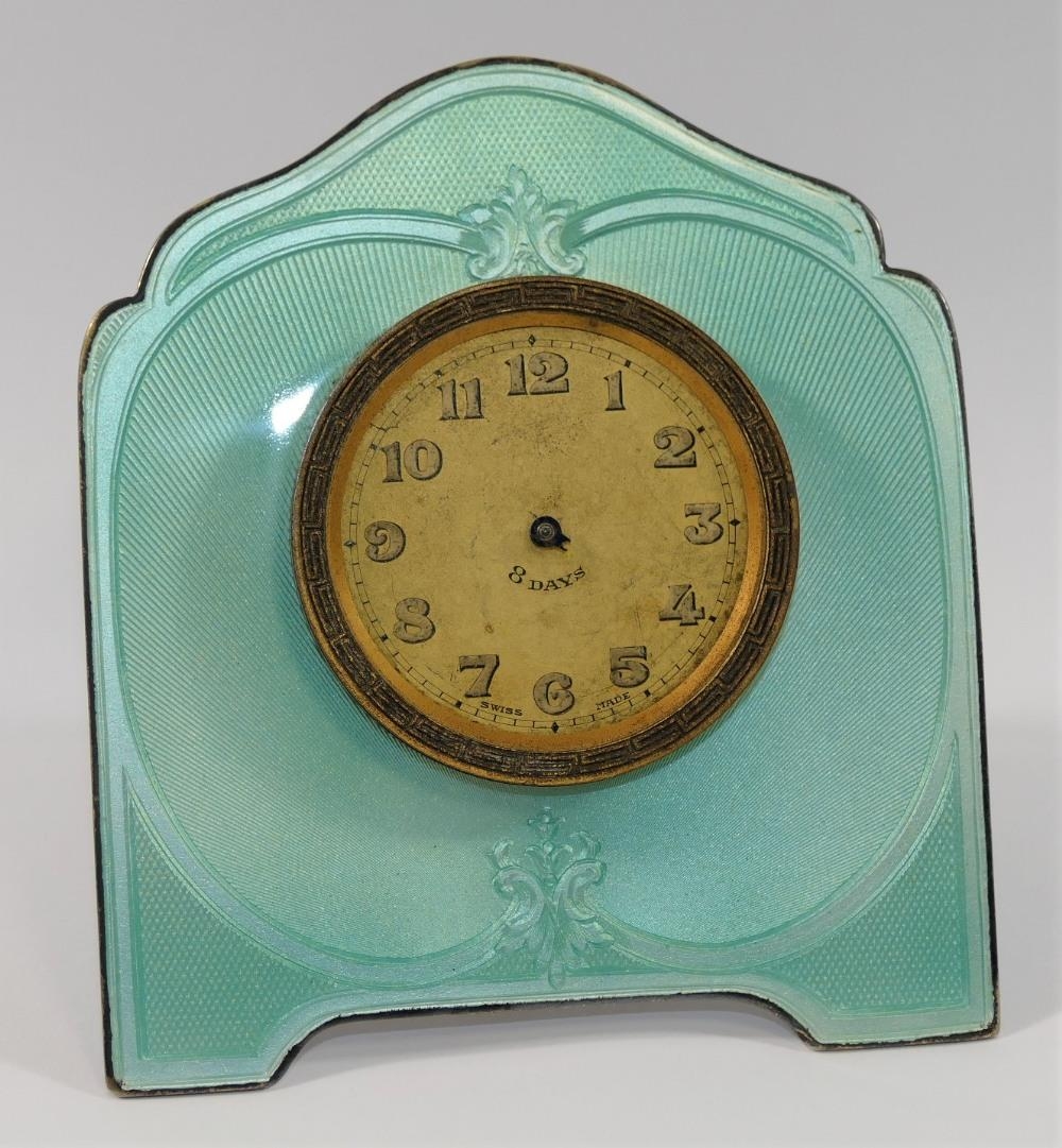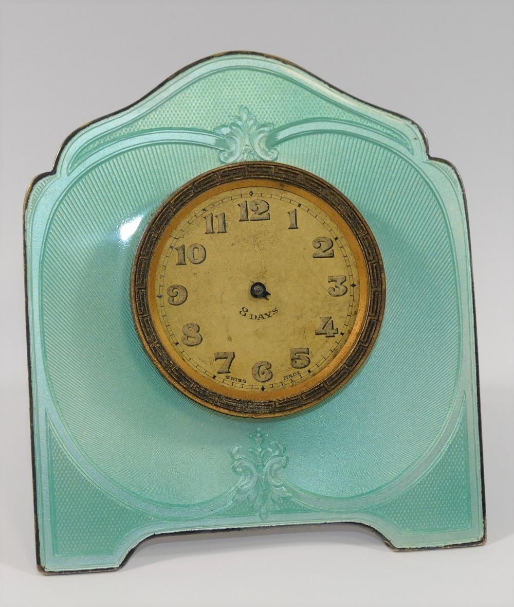 A silver coloured metal and guilloche enamelled easel backed clock, the face with Arabic numerals and gilt brass Greek key surround, hands and glass lacking, 10.25cm high