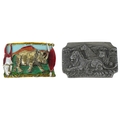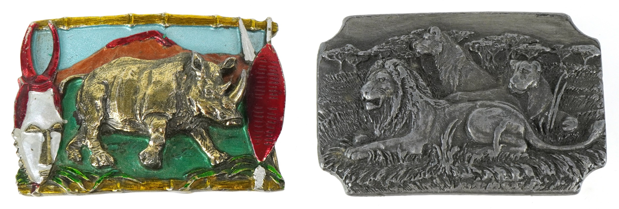 Two vintage American cast metal belt buckles including an enamelled rhinoceros example, the largest 8cm wide.