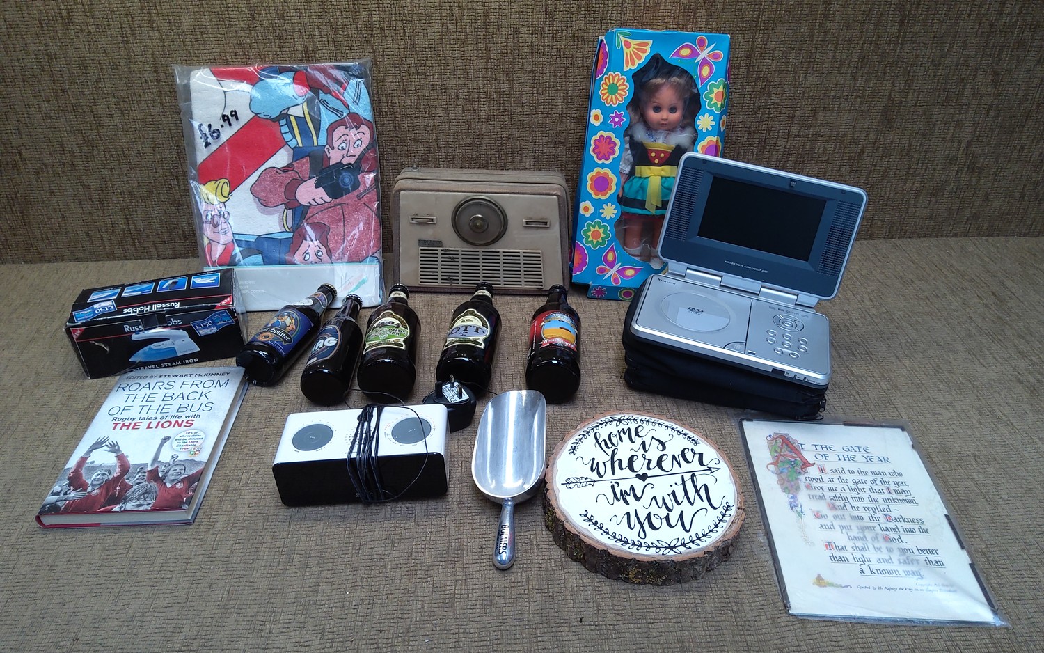 Items including Vintage Fidelity wireless, vintage boxed doll, and mixed vintage beer's