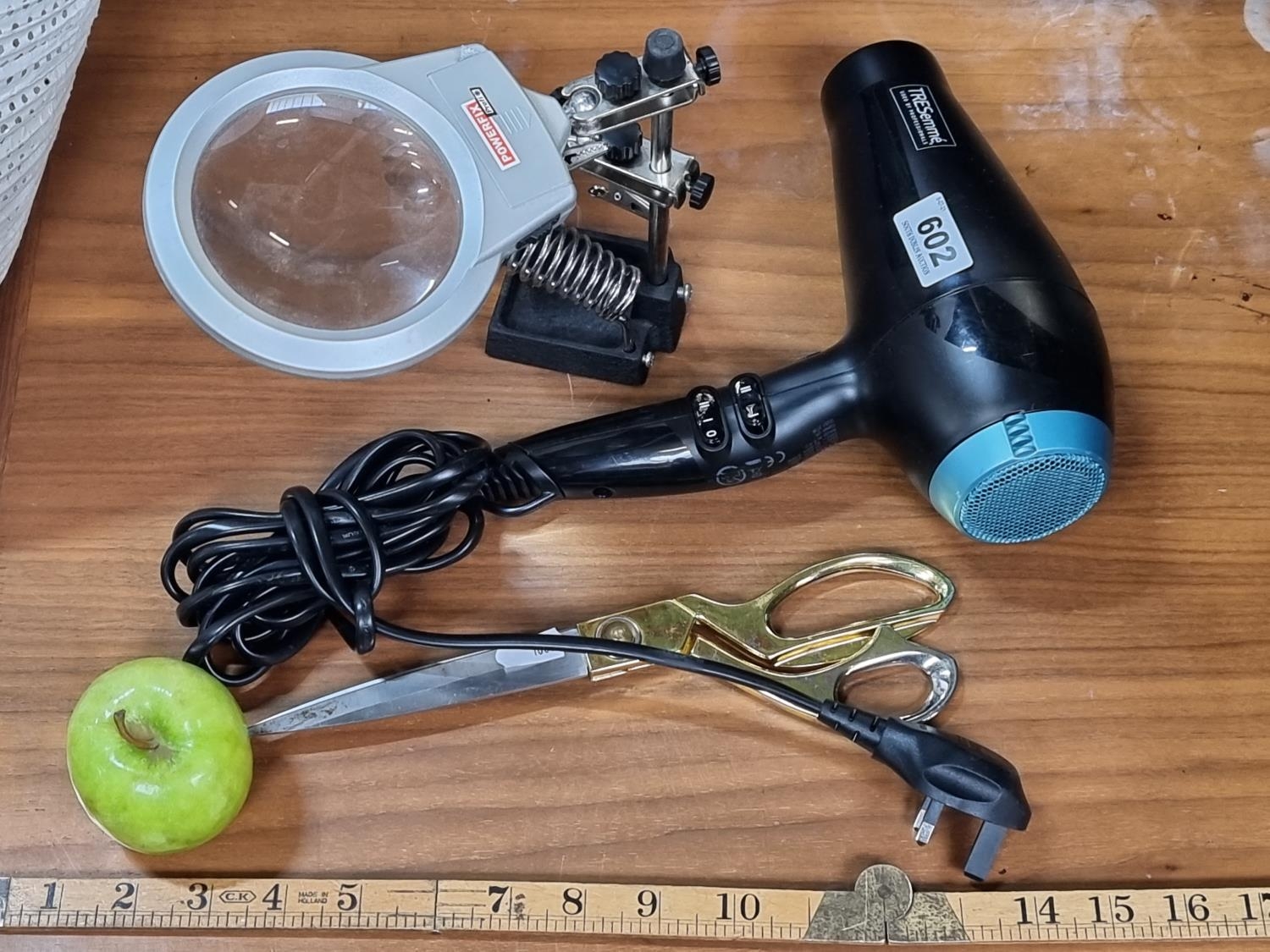 A miscellaneous lot including a Tresemmé Hair dryer and a Power Fix Magnifying Glass and a pair of long seamstress scissors.