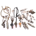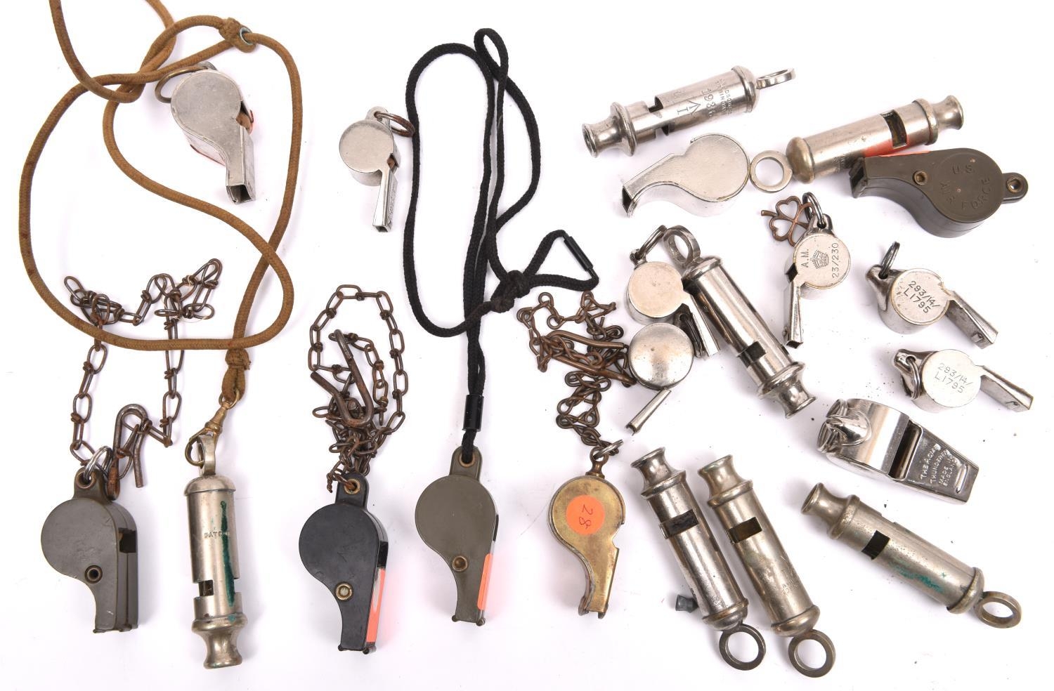 21 various whistles, mostly WWII military: 3 Air Ministry marked dinghy whistles; 7 “Metropolitan” type with broad arrow over 1940 (2), 1941 and 1944, broad arrow over I and broad arrow of “I” and “1936”; 3 US Military marked; 4 US plastic (Navy, Army (2) and Air Force); and 4 others. Average GC £50-80