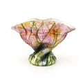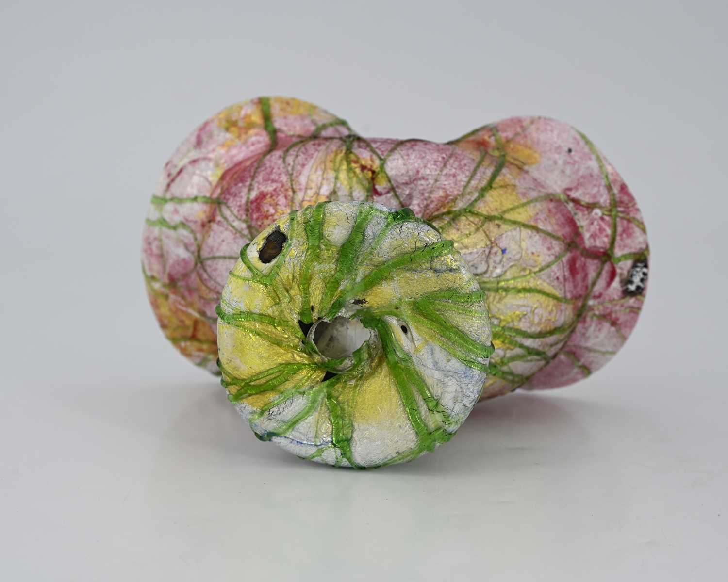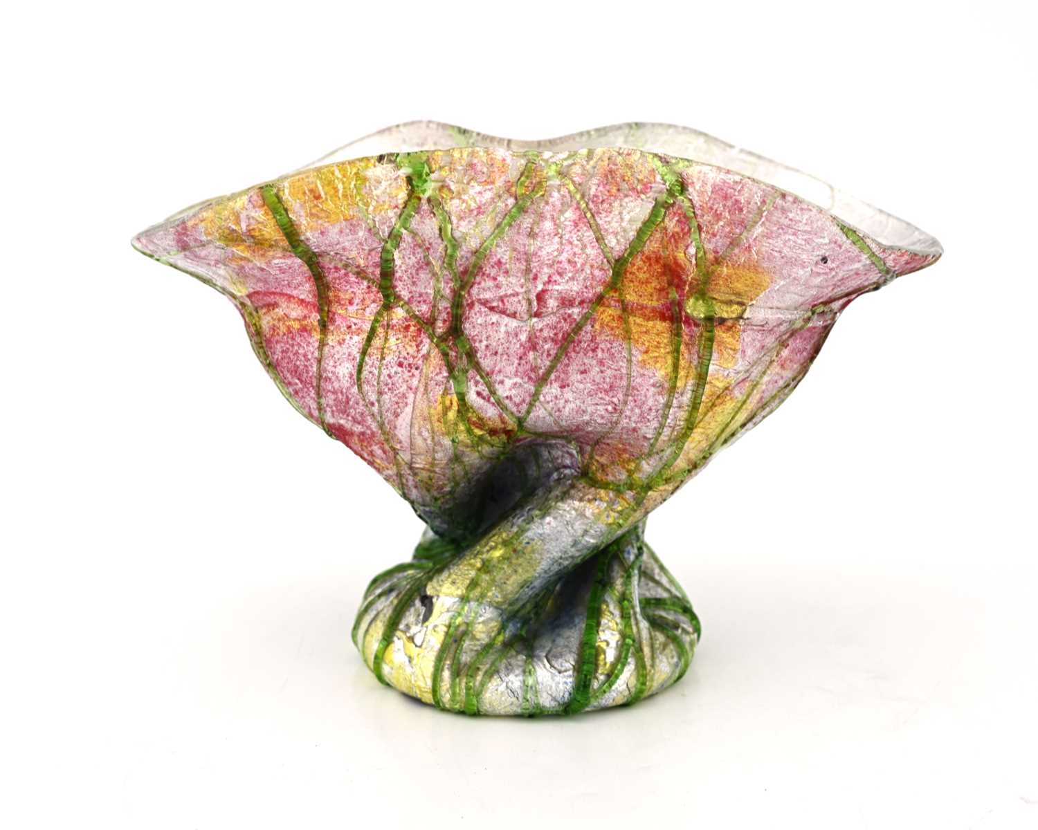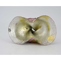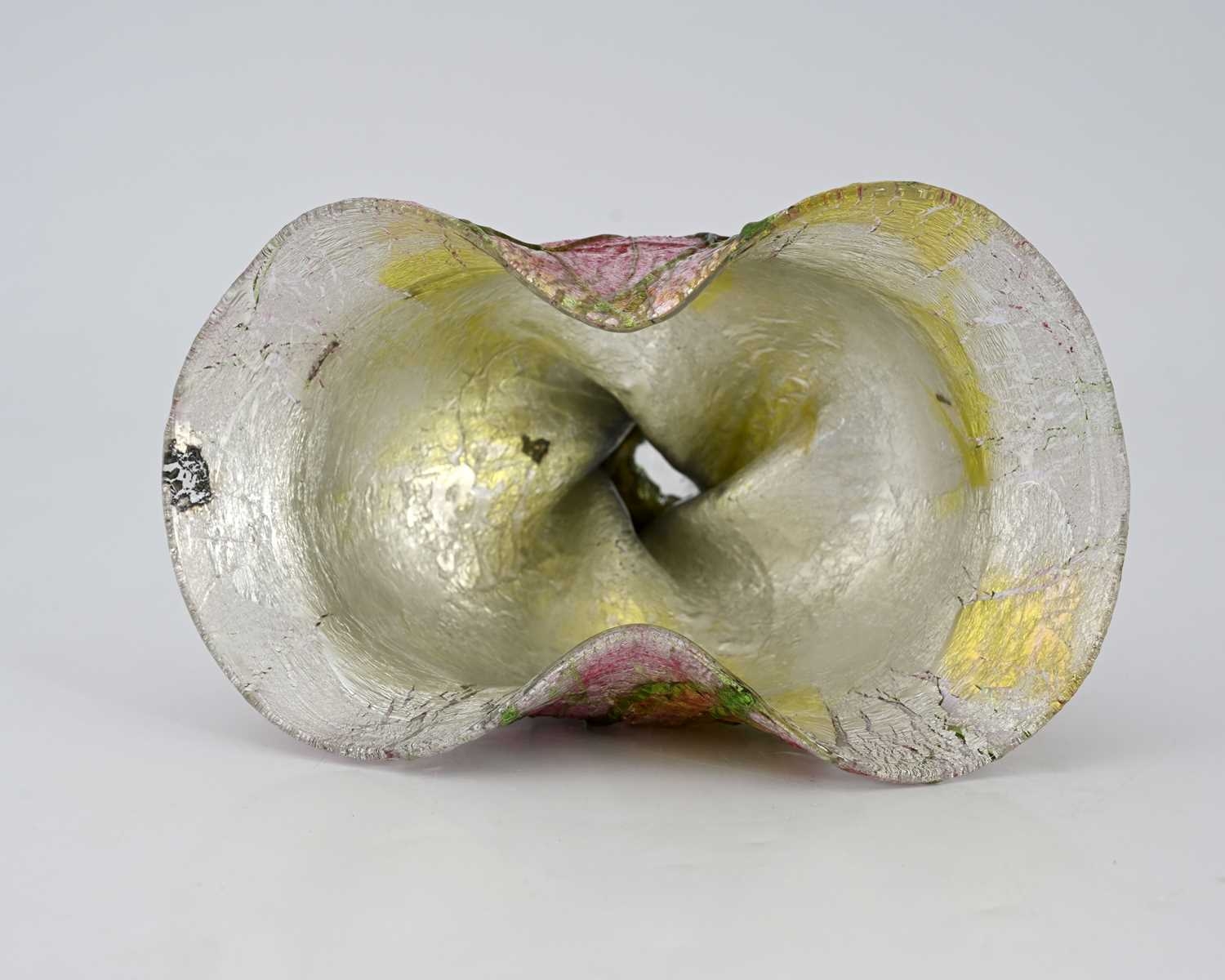 John Northwood II for Stevens and Williams, a Silveria iridescent glass vase, circa 1900, twisted organic form, pinched and flared to the rim, encased silver foil within pink, blue and amber shot shell, overlaid with random green web trailing, incised mark to the polished pontil SW, 15cm high Note: probably a collaborative effort with designer Frederick Carder, who later developed a range of iridescent and foil-cased glass at Steuben in America, the technique was difficult to perfect at the Stourbridge factory making the production short lived and the pieces quite scarce.