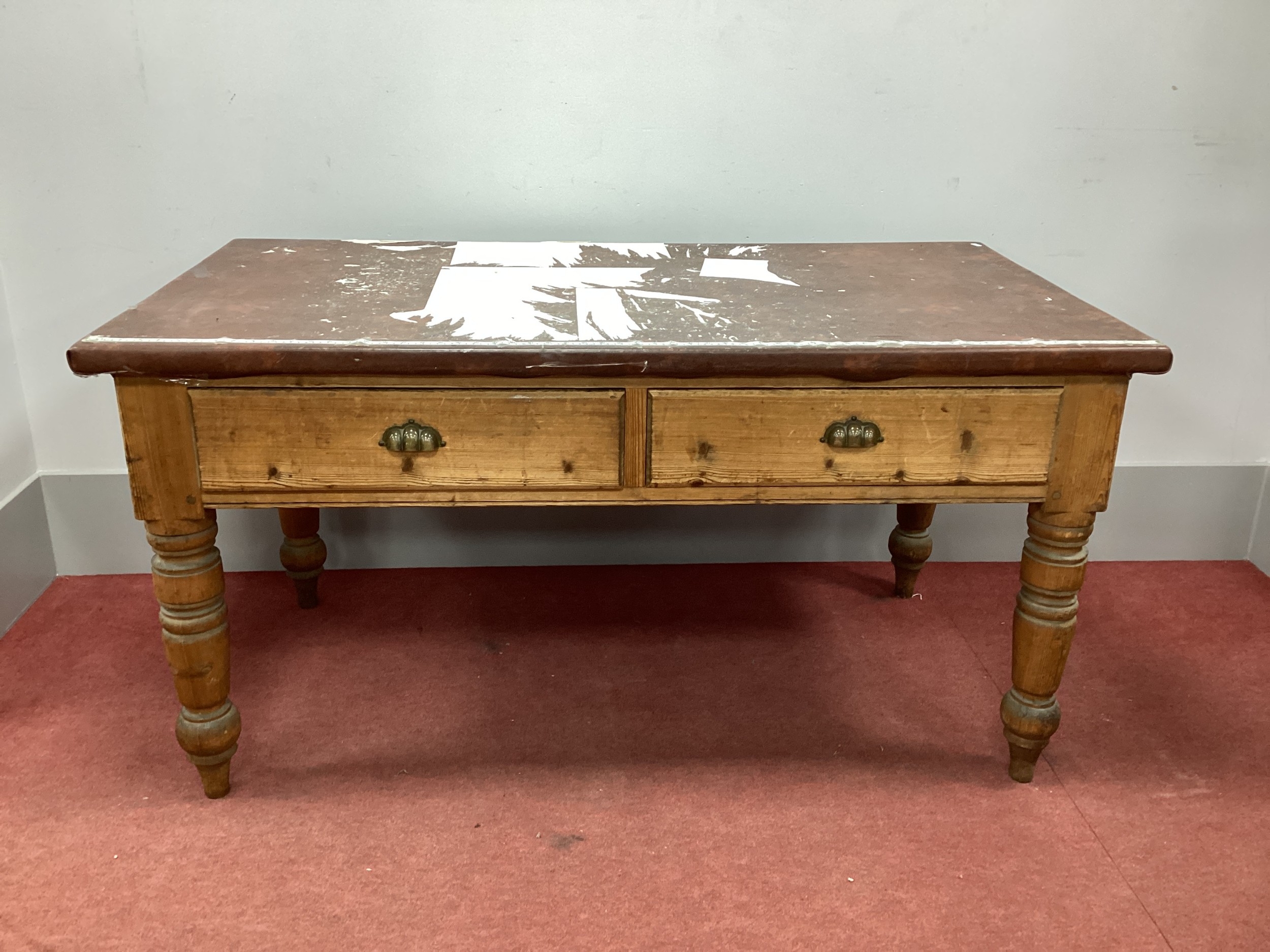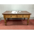 A Pine Rectangular Shaped Table, with two small drawers, on turned and block supports, 152cm wide;