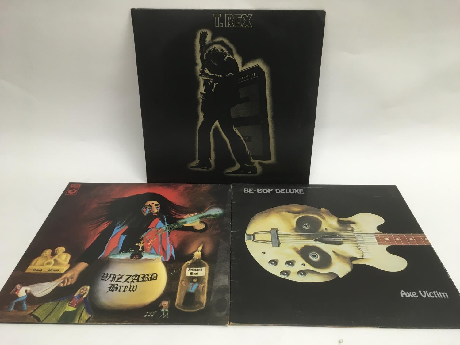 Three glam rock LPs comprising T Rex 'Electric Warrior' (no poster), Wizzard 'Wizzard Brew' and Be Bop Deluxe 'Axe Victim'.