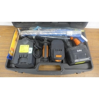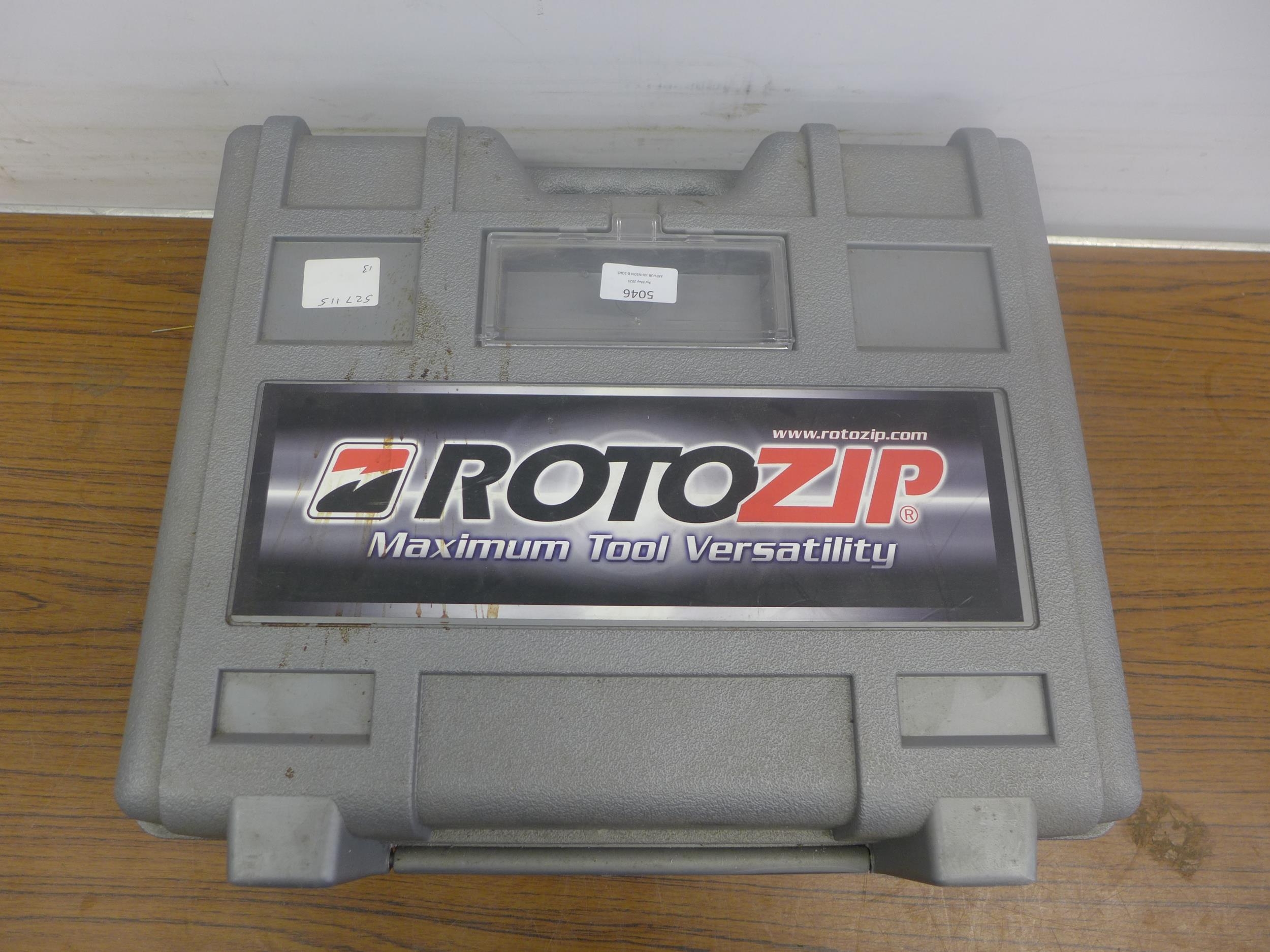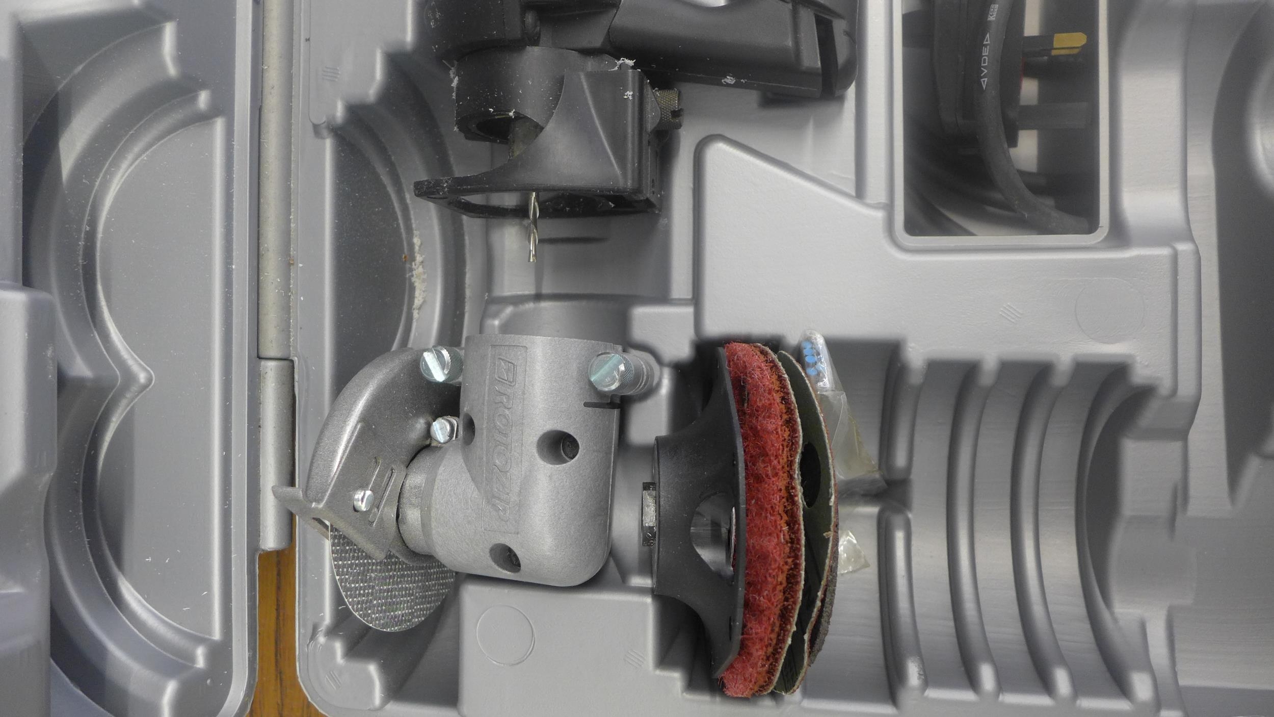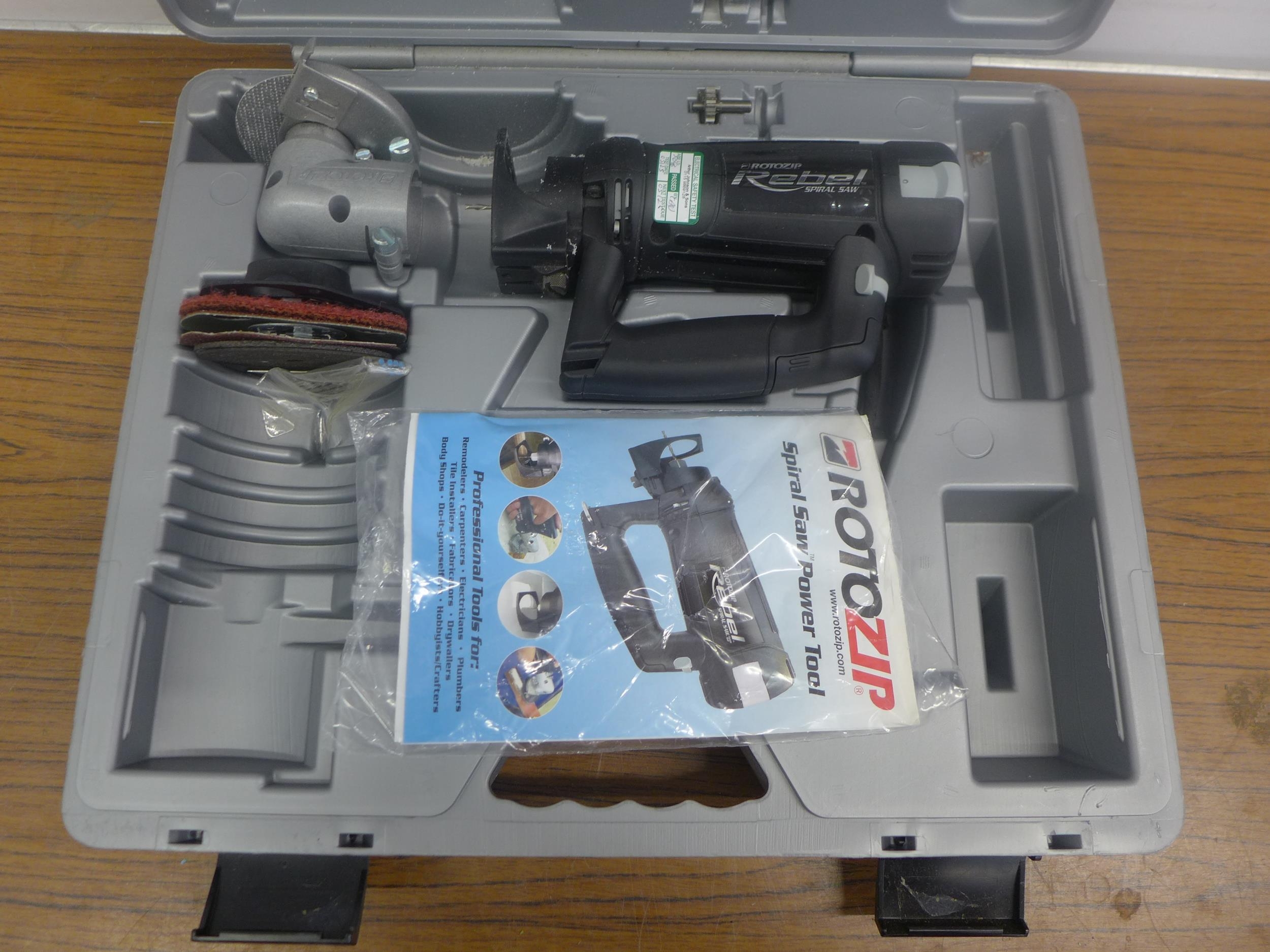 A cased Roto-Zip Type 1 spiral saw power tool with accessories and instruction manual