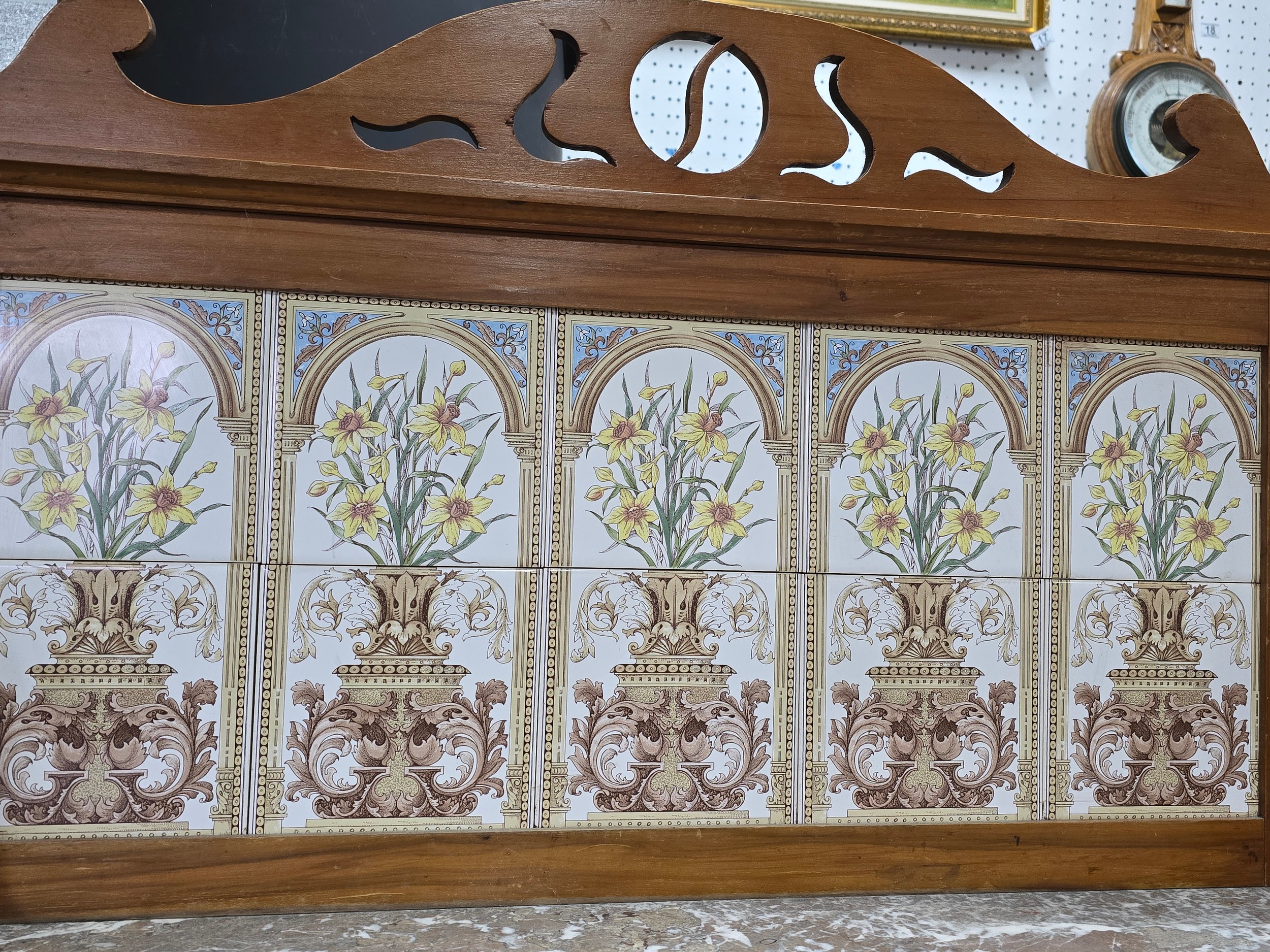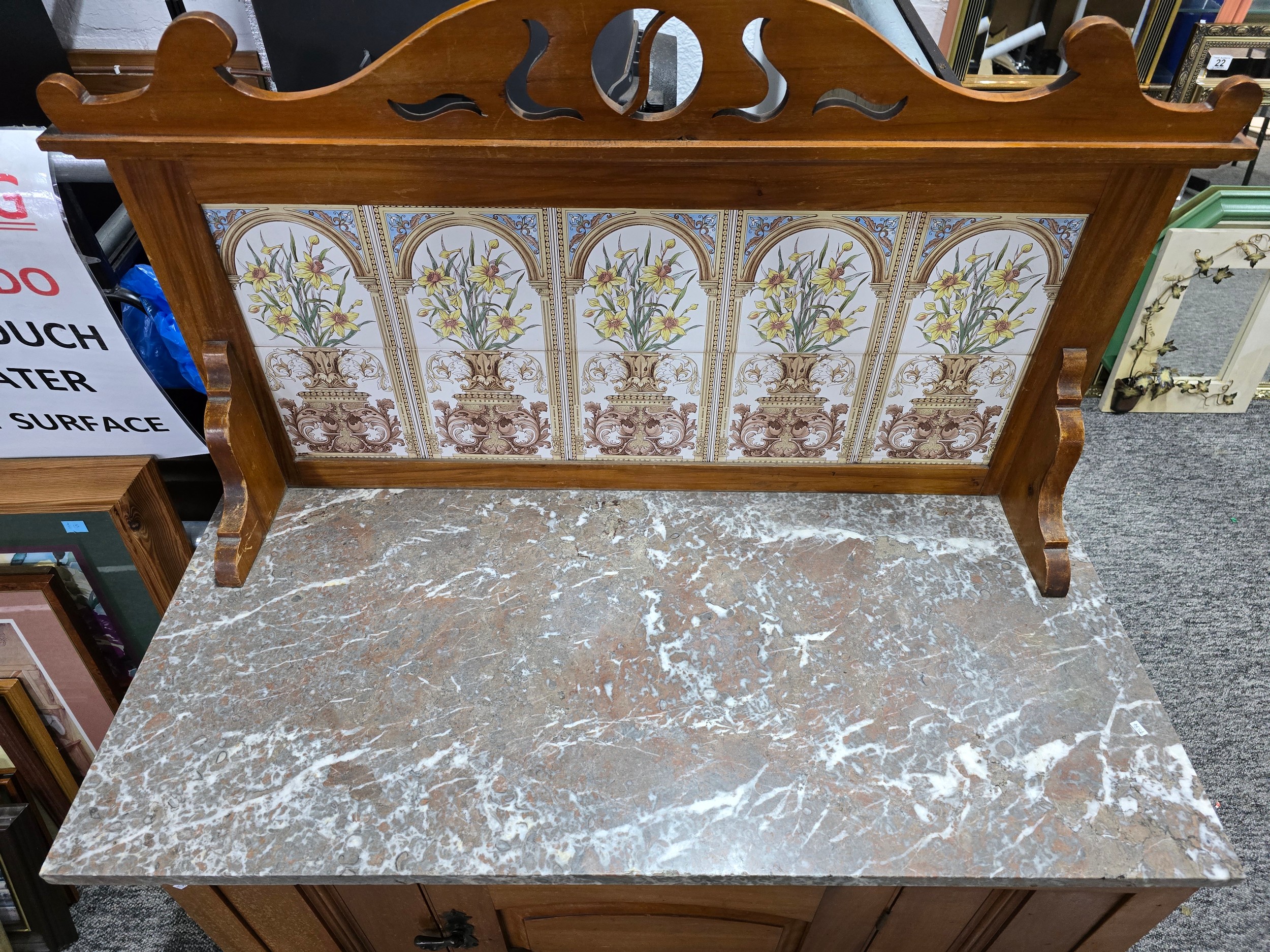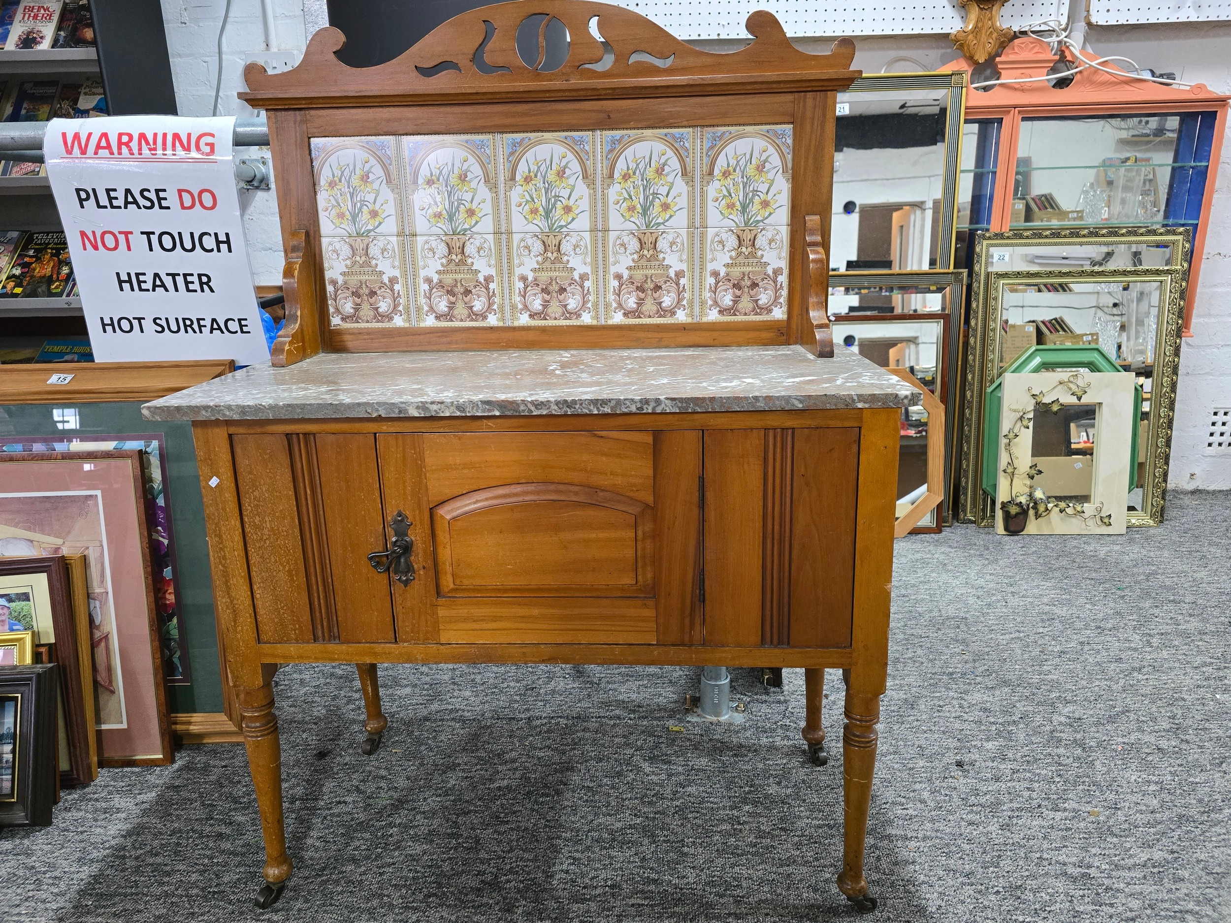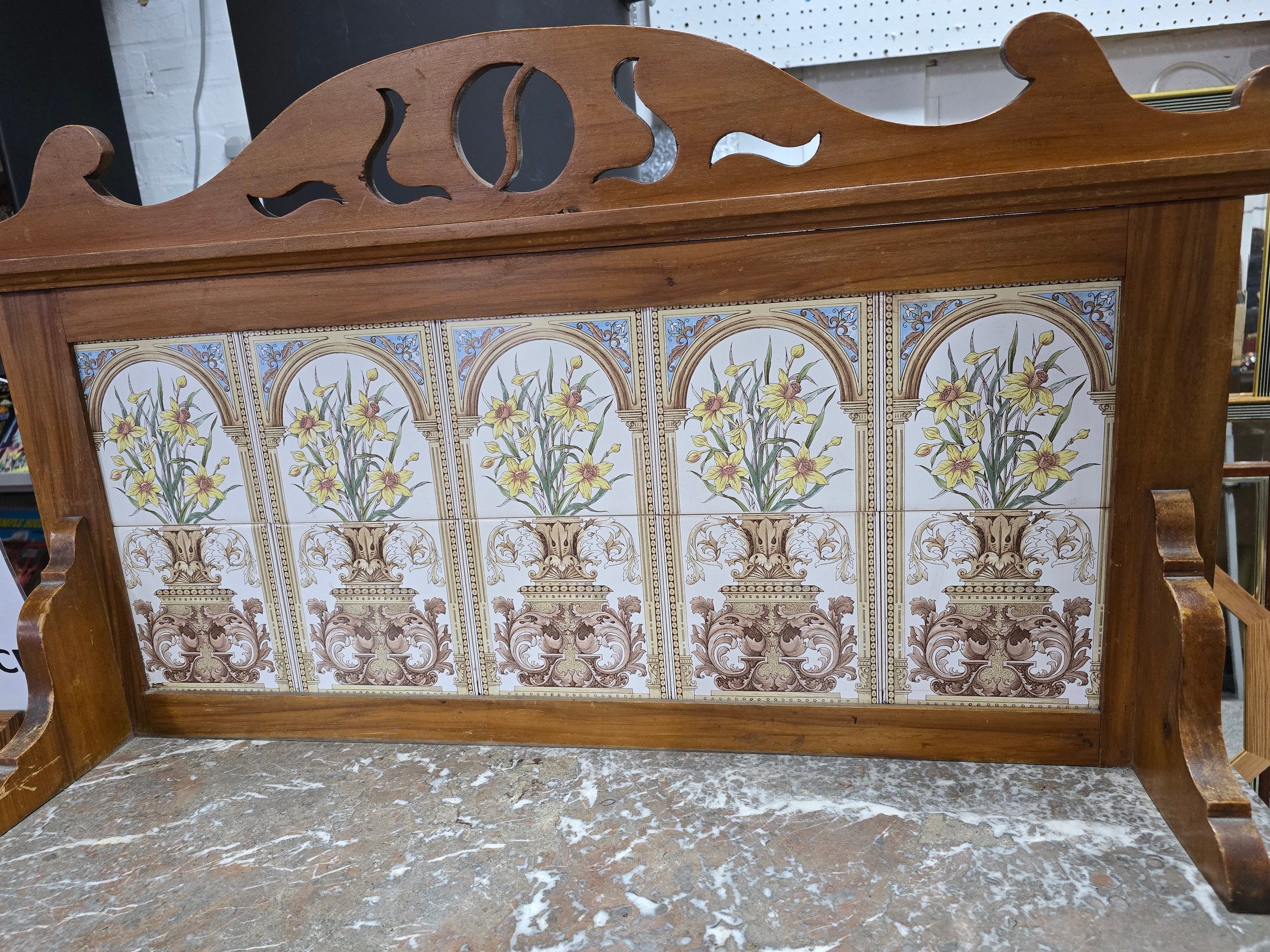 Stunning clean example antique mahogany wash stand featuring a stuning 5 tile back with a daffodil and vase design marked to the back H & R Johnson tiles, the wash stand features a good marble top which is in good condition with no damage with a cupboard door below standing on castors, has a height of 148cm length 91.5cm depth 43.5