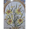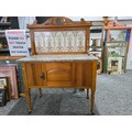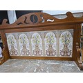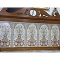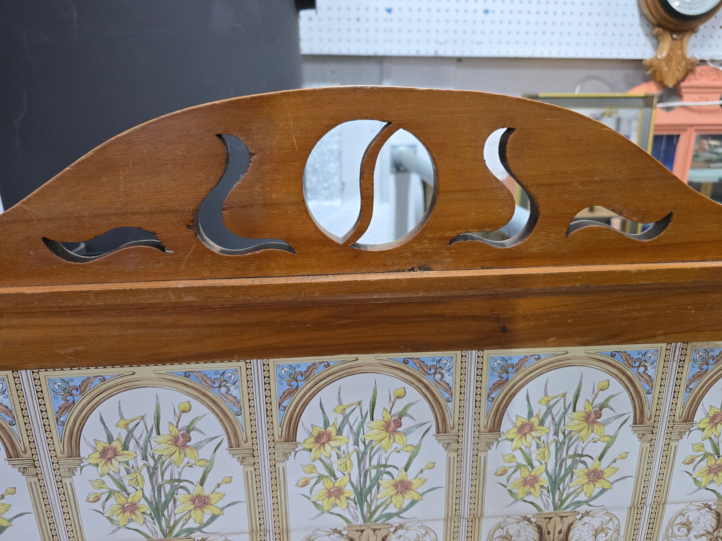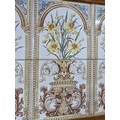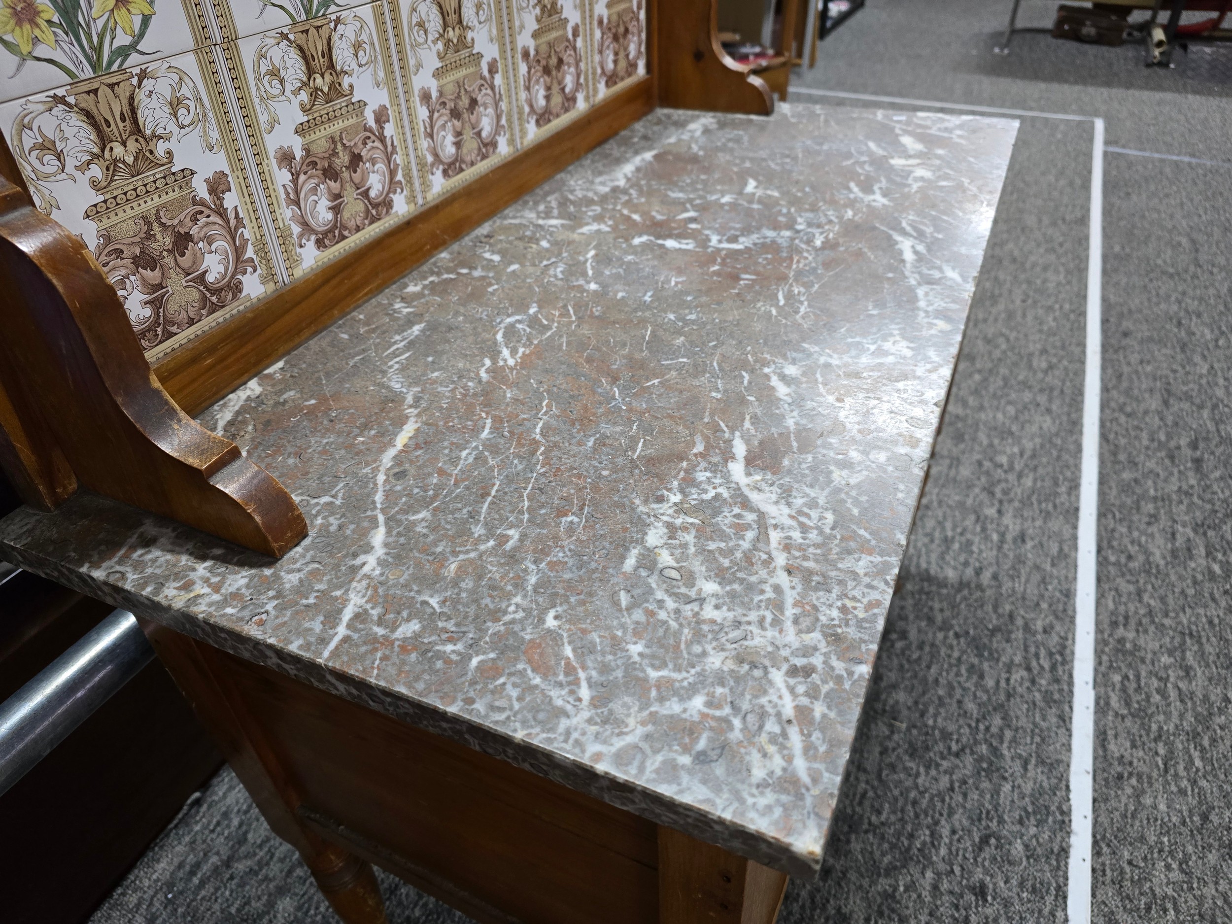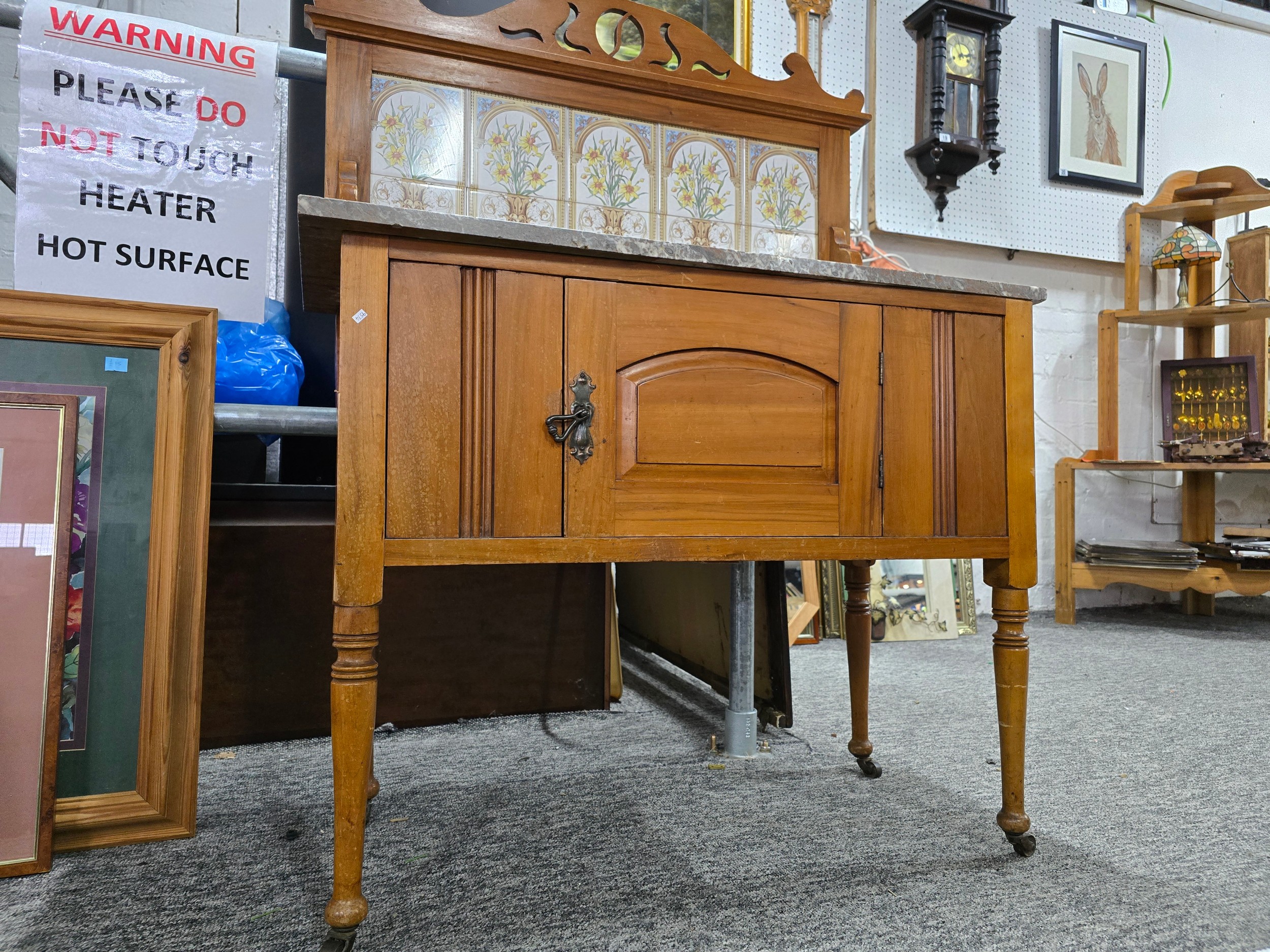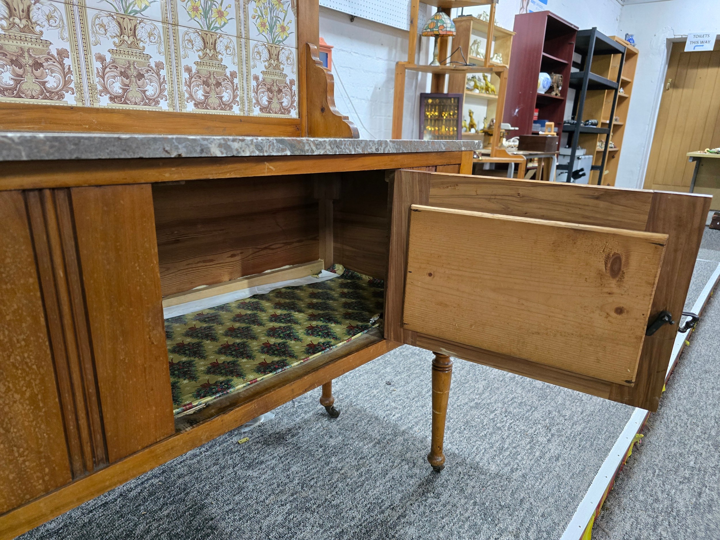 Stunning clean example antique mahogany wash stand featuring a stuning 5 tile back with a daffodil and vase design marked to the back H & R Johnson tiles, the wash stand features a good marble top which is in good condition with no damage with a cupboard door below standing on castors, has a height of 148cm length 91.5cm depth 43.5