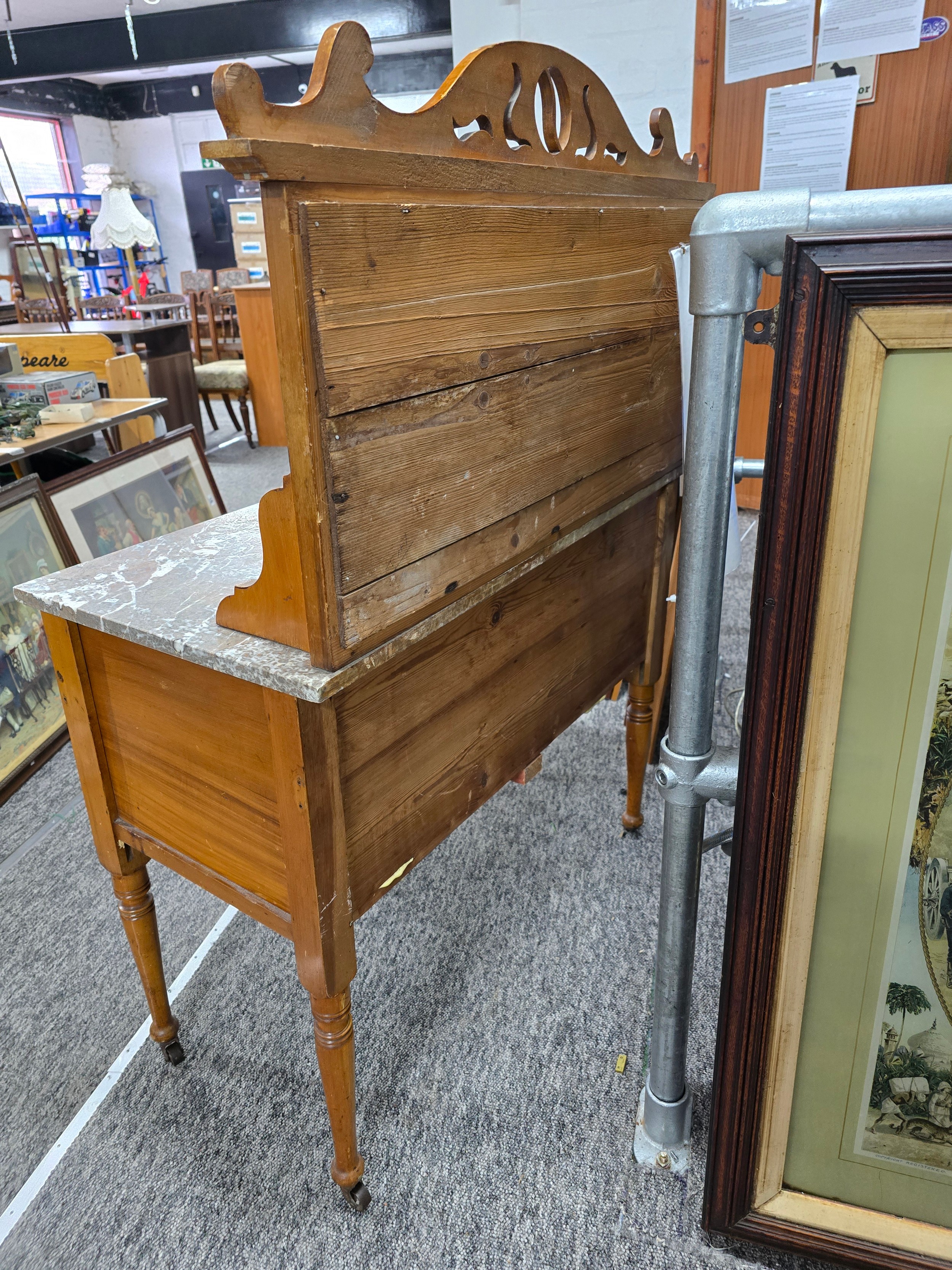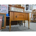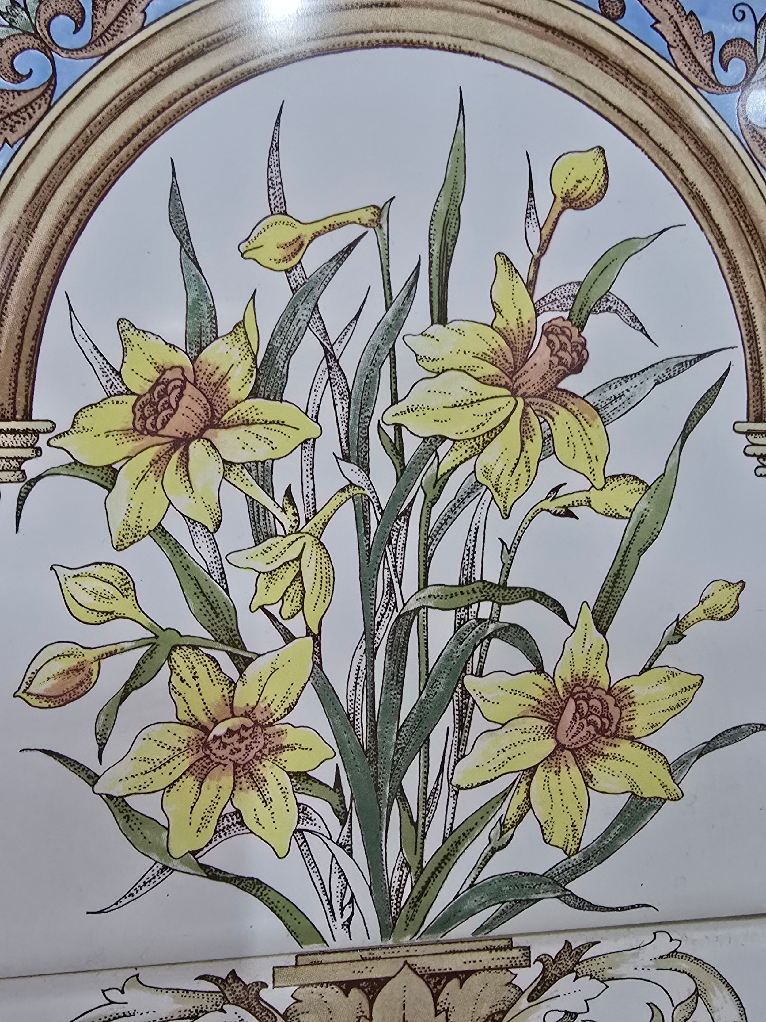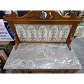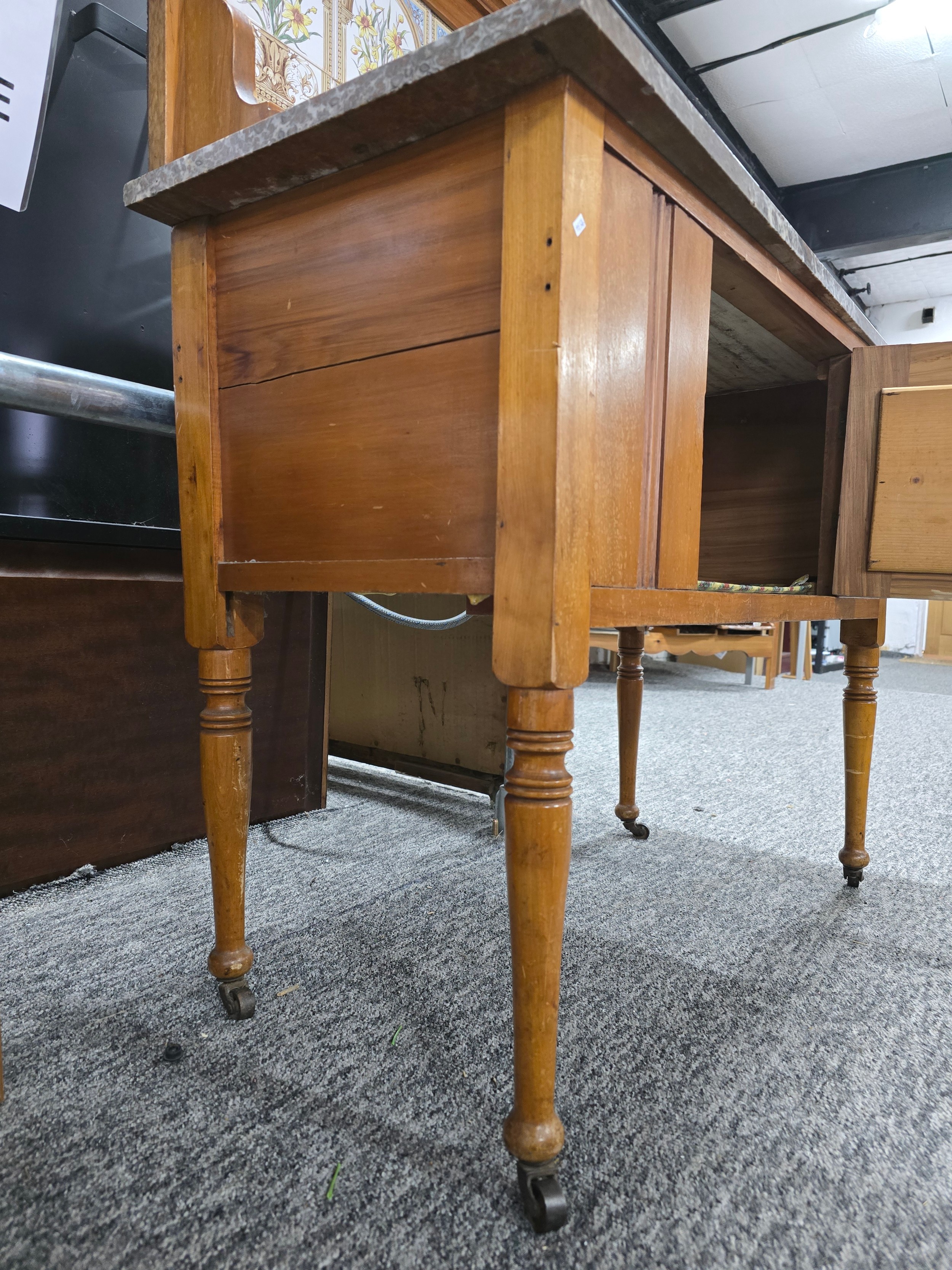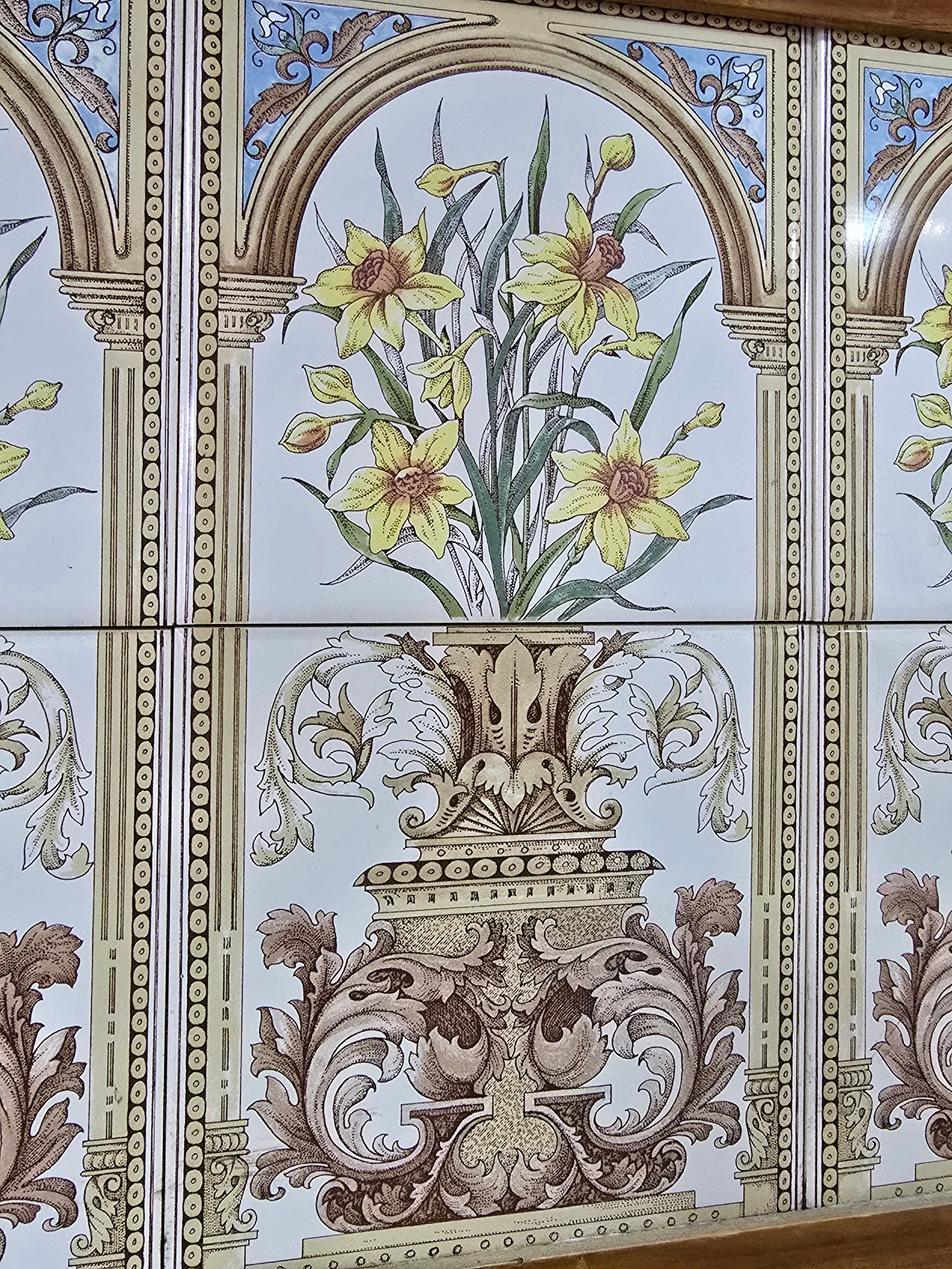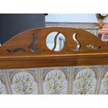 Stunning clean example antique mahogany wash stand featuring a stuning 5 tile back with a daffodil and vase design marked to the back H & R Johnson tiles, the wash stand features a good marble top which is in good condition with no damage with a cupboard door below standing on castors, has a height of 148cm length 91.5cm depth 43.5