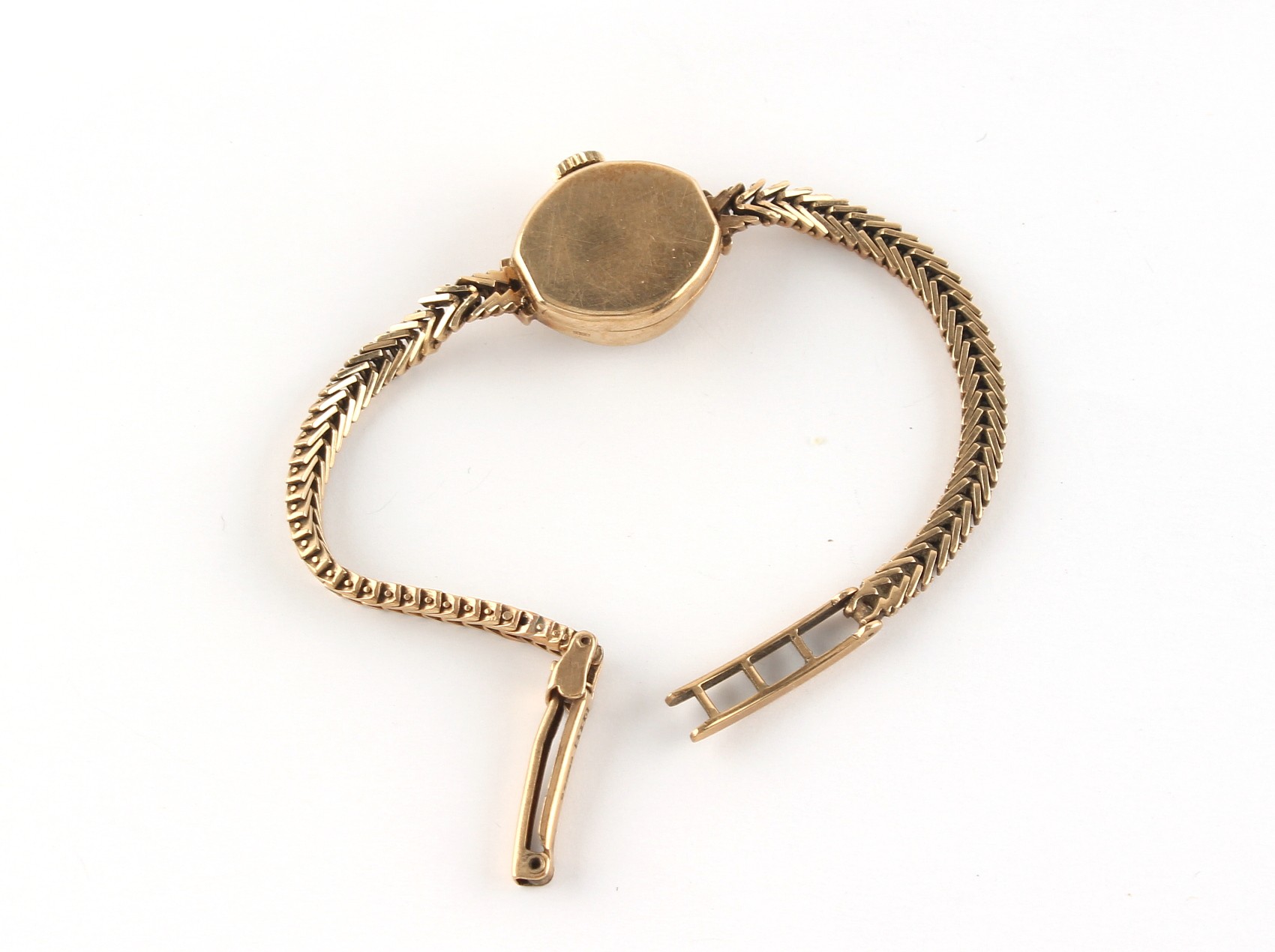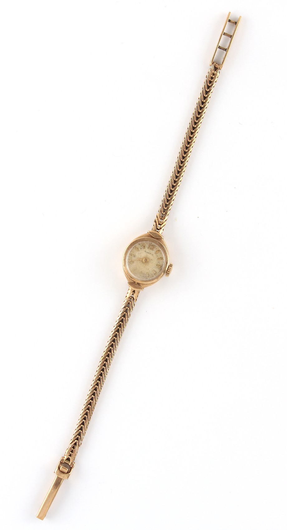 Property of a lady - a lady's Mappin 9ct gold wristwatch with Swiss 17-jewel movement, appears to be working but no guarantees are given, on 9ct gold bracelet strap (approximately 9.3 grams with glass but excluding movement).