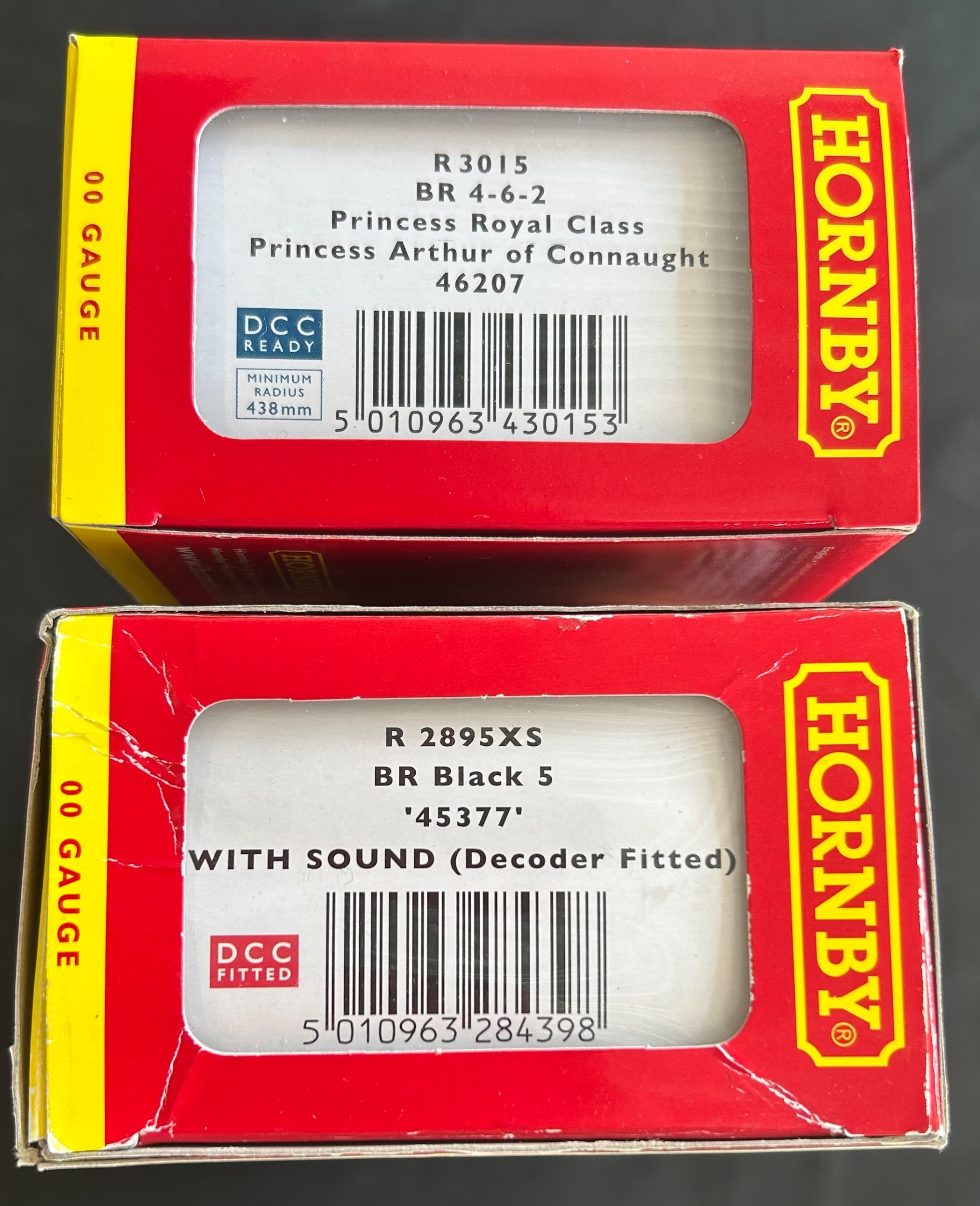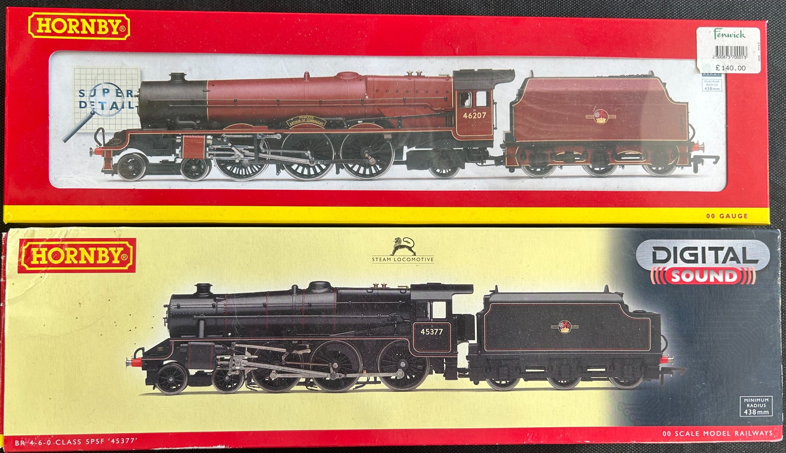 2 Hornby OO Tender Locomotives. A BR Ex LMS Princess Royal Class 4-6-2 'Princess Arthur of Connaught' 46207 (R.3015). Together with a BR Black 5 4-6-0 45377 (R.2895XS). Both boxed. Contents VGC-Mint.