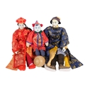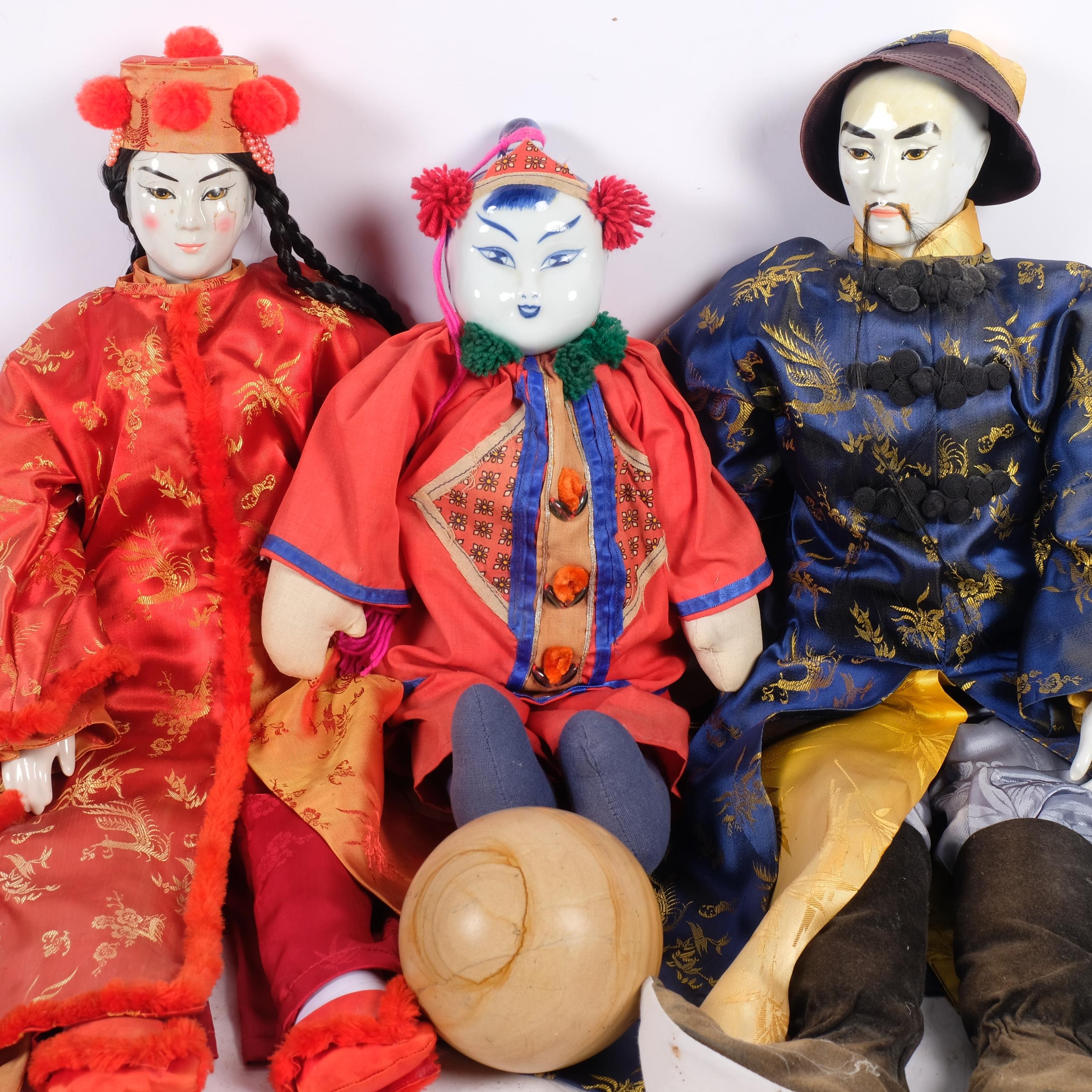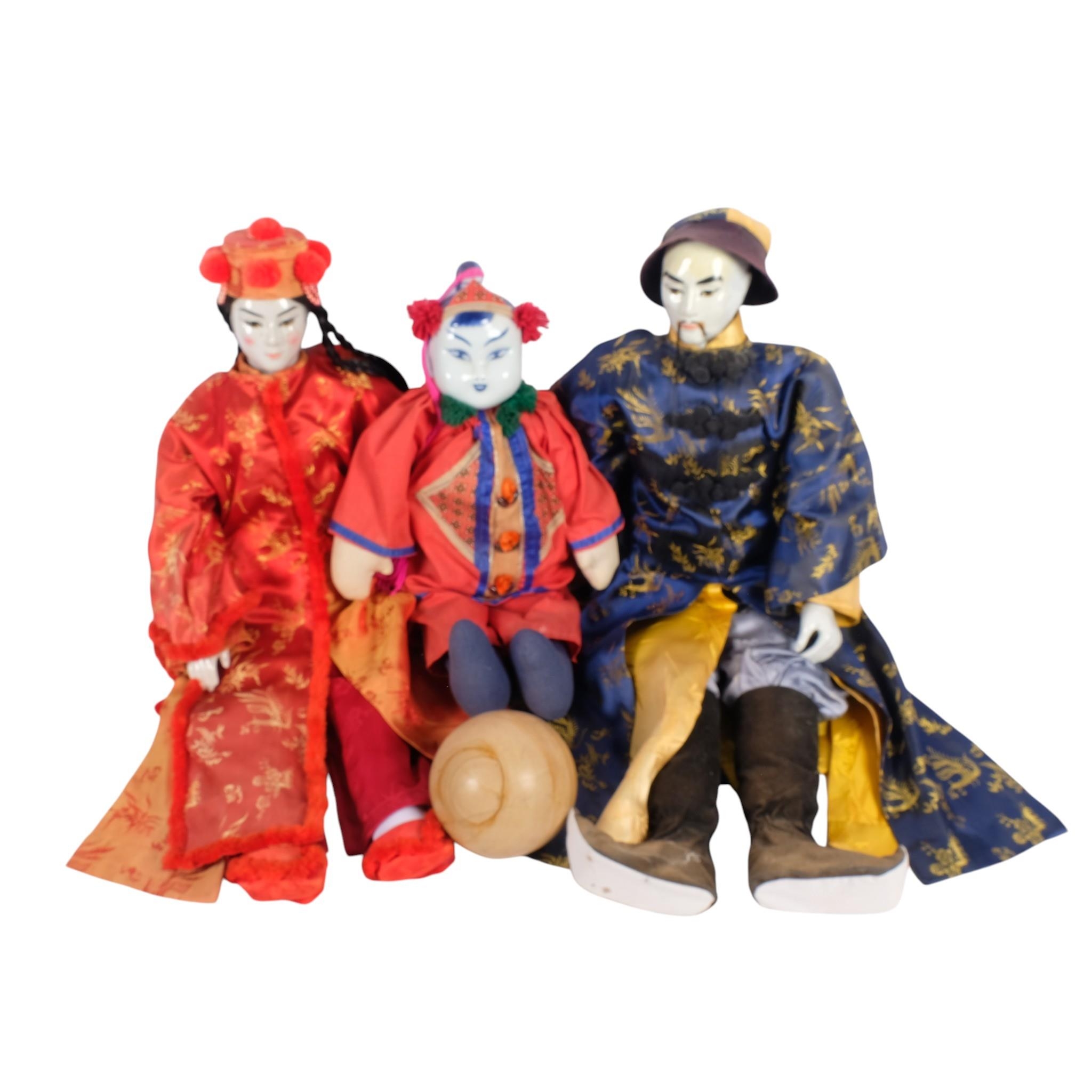 A collection of 3 Chinese dolls, with porcelain feet, hands and legs and cloth body, in traditional dress