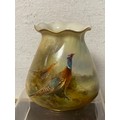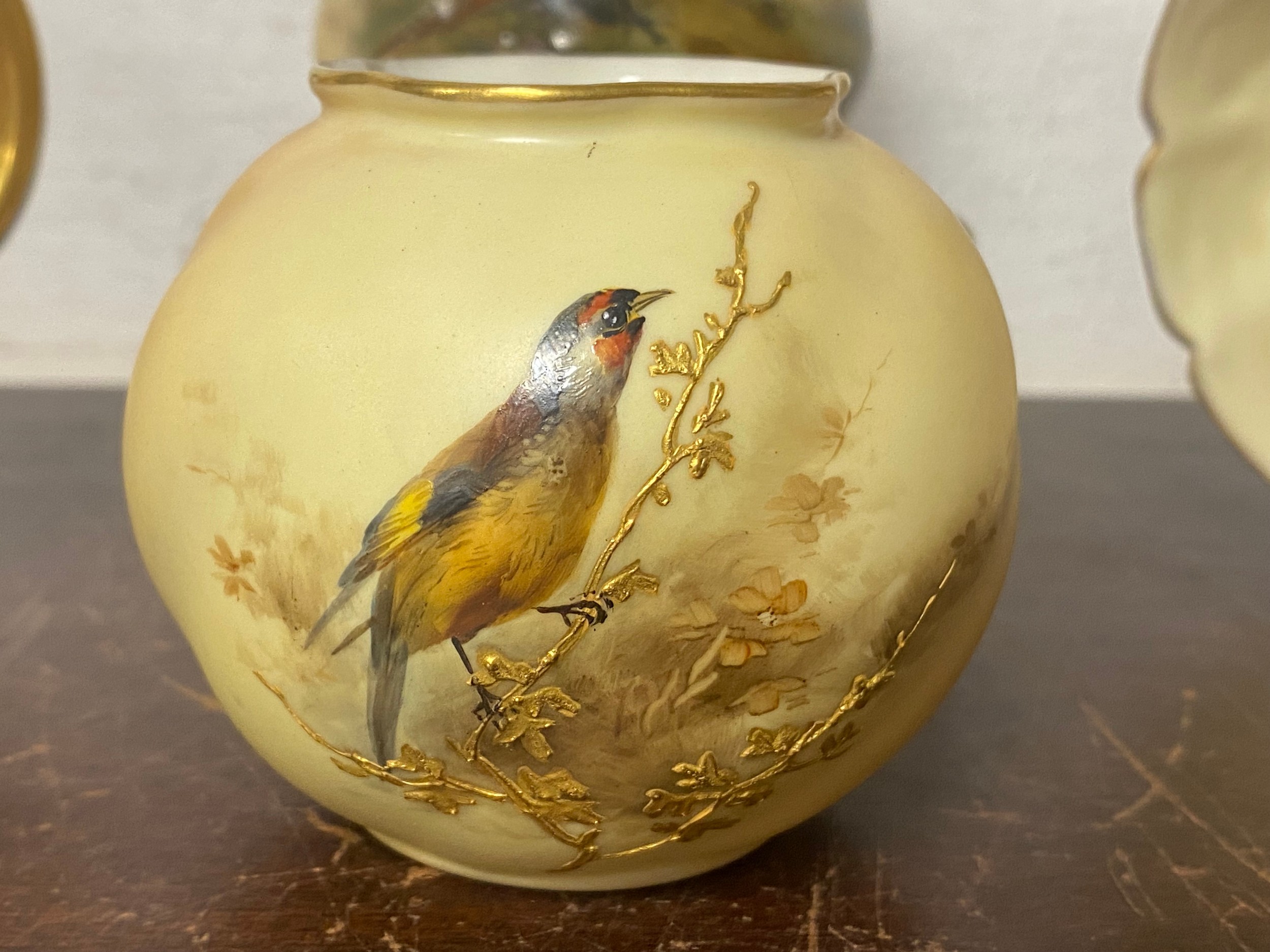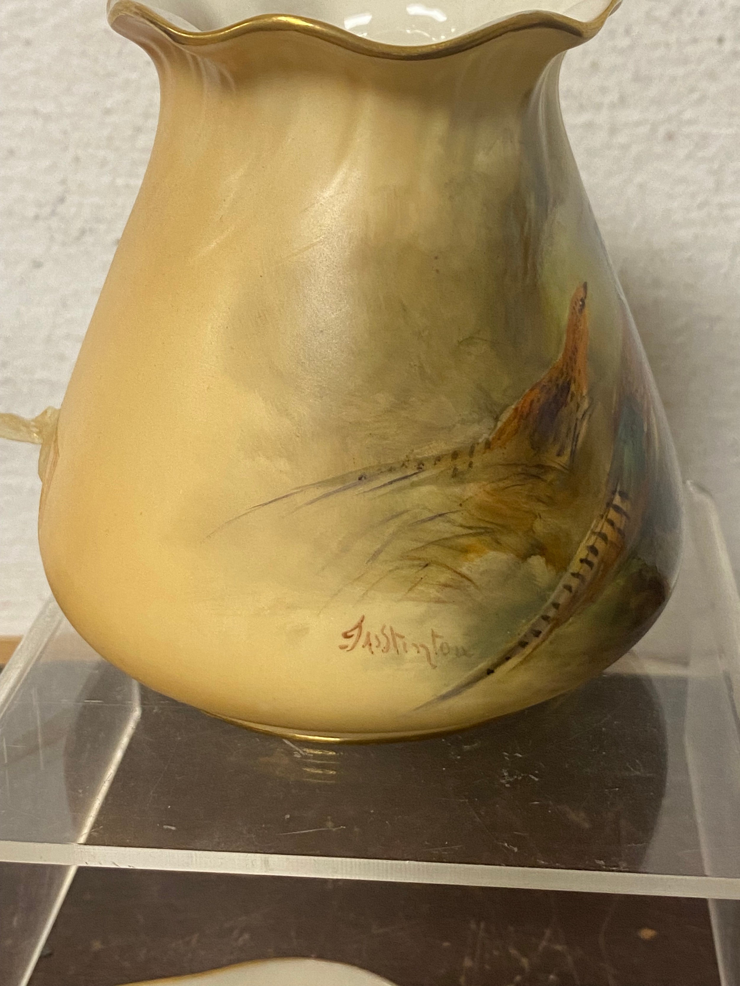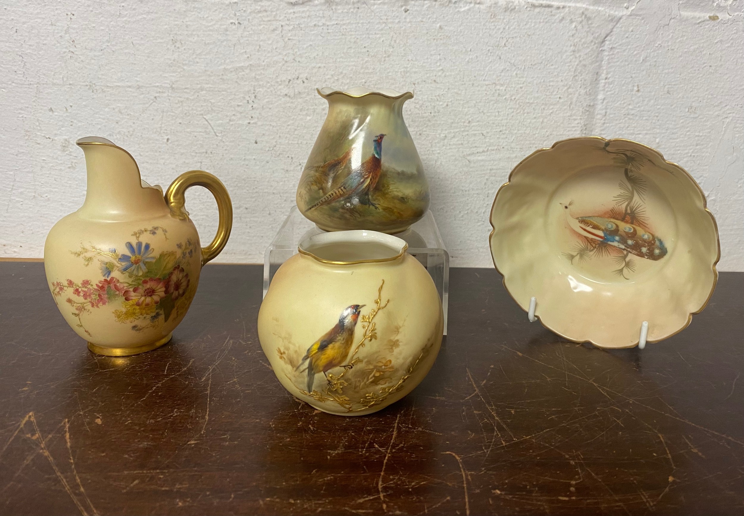 A Royal Worcester vase, painted with pheasants, by James Stinton (a/f), together with a vase painted with a goldfinch, a bowl with peaches and a floral jug -