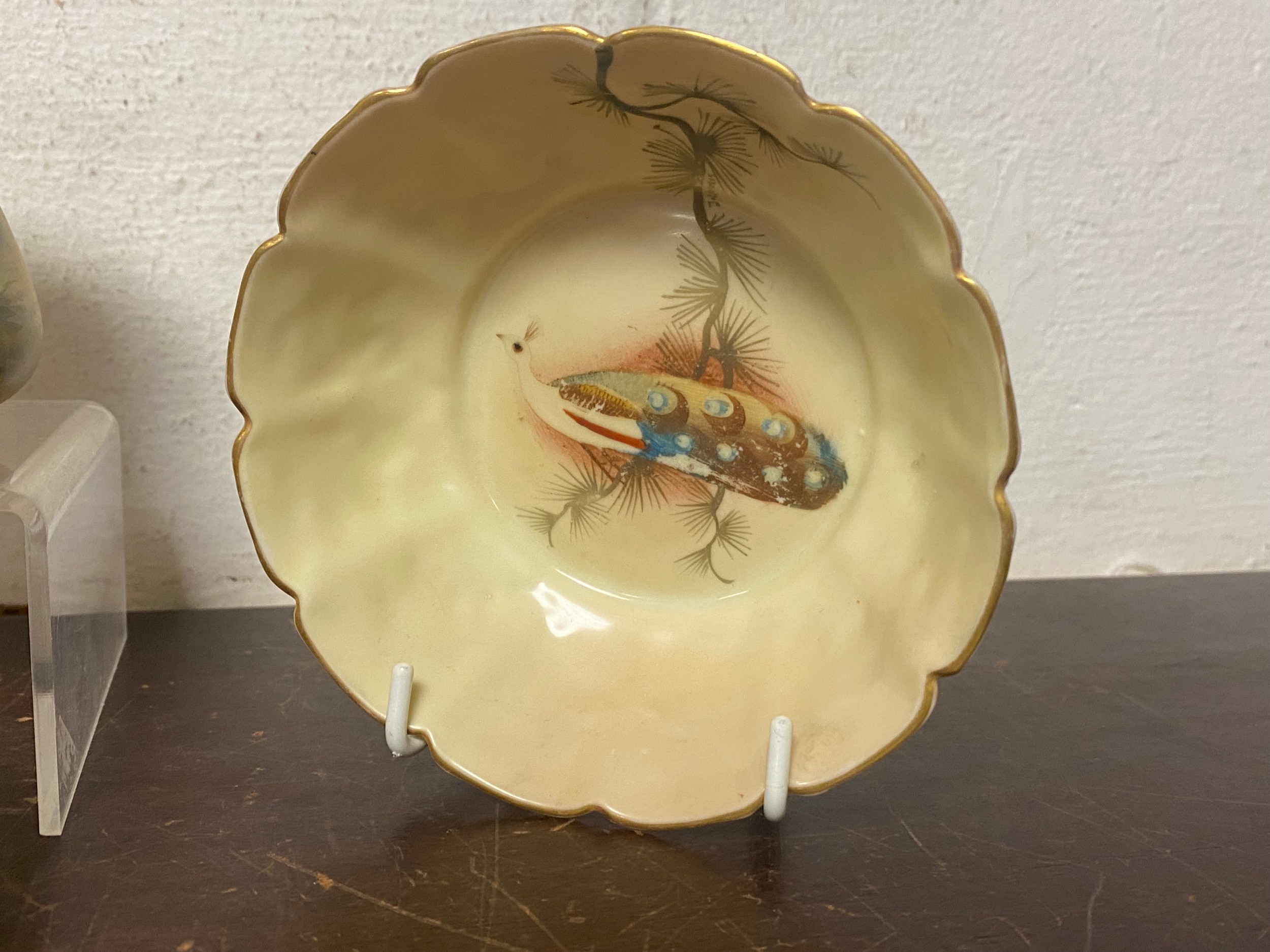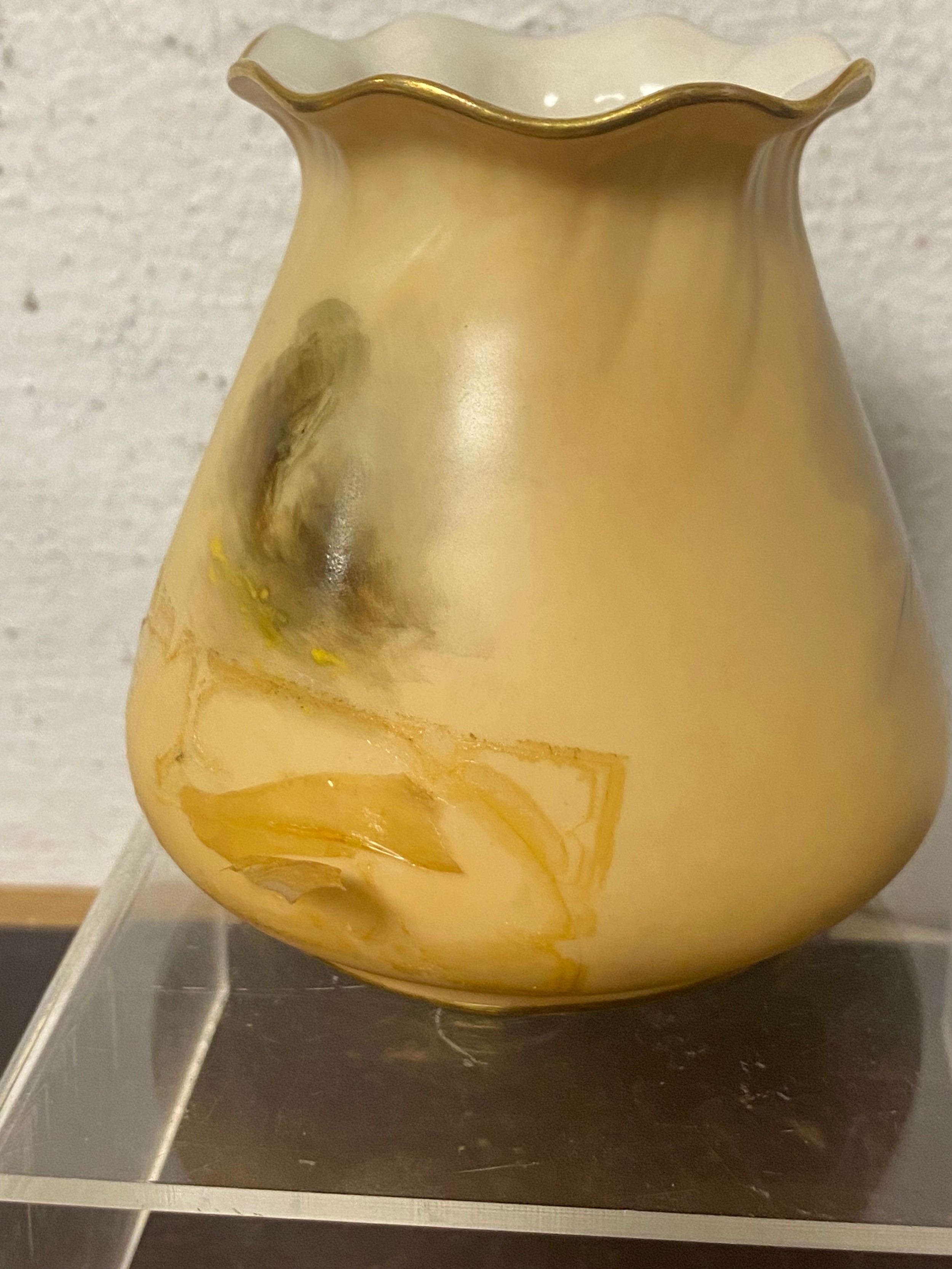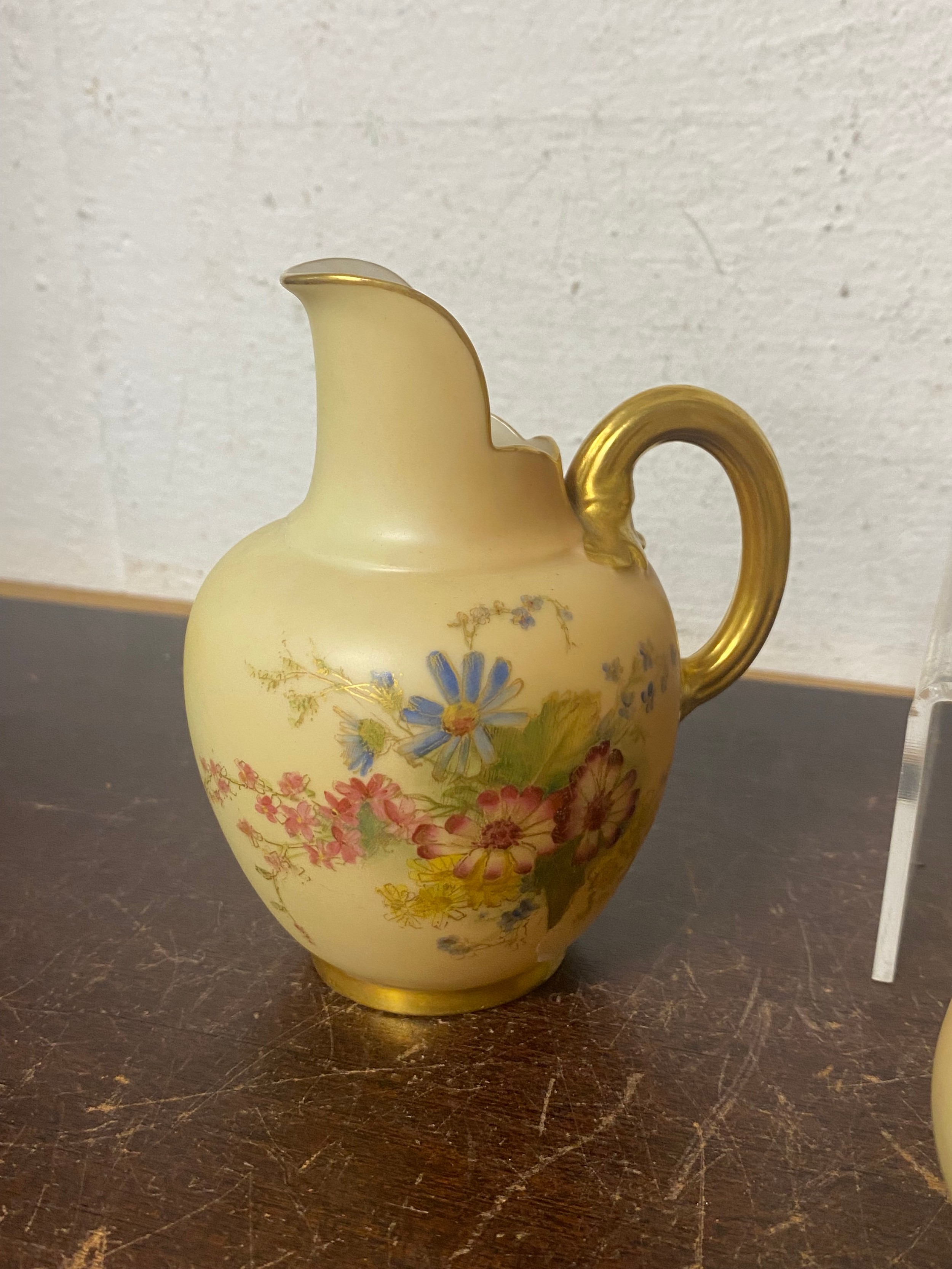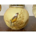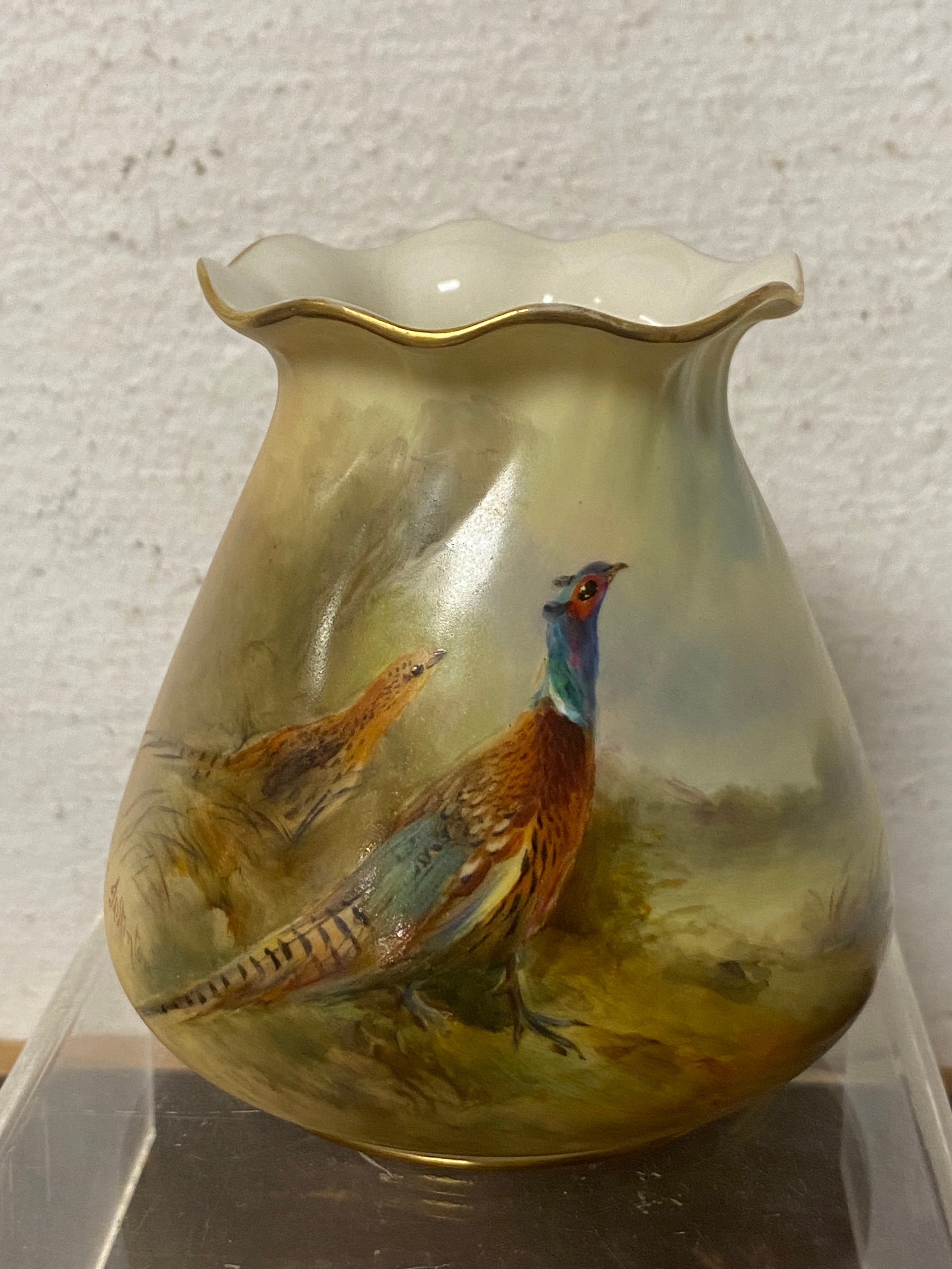 A Royal Worcester vase, painted with pheasants, by James Stinton (a/f), together with a vase painted with a goldfinch, a bowl with peaches and a floral jug -