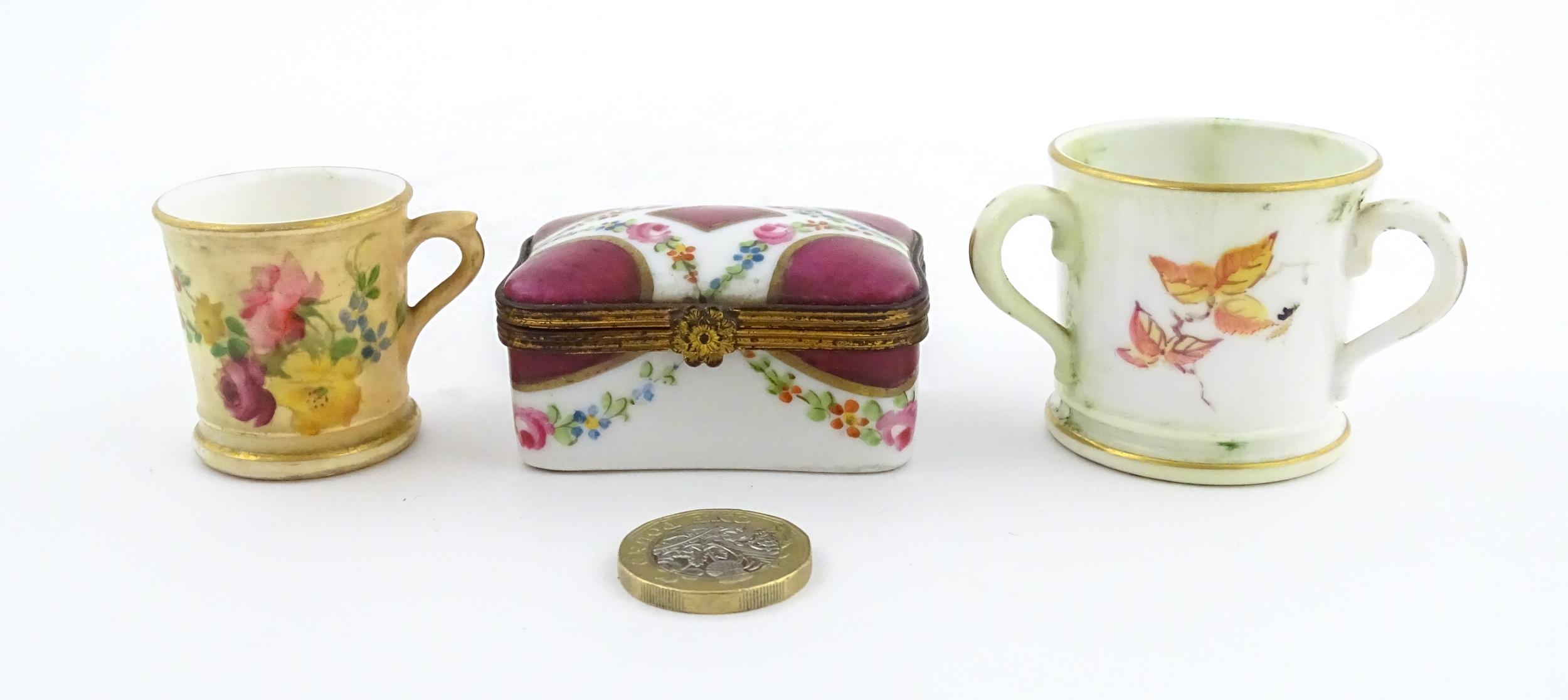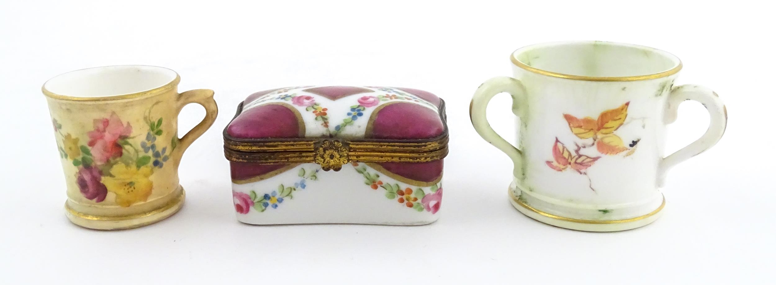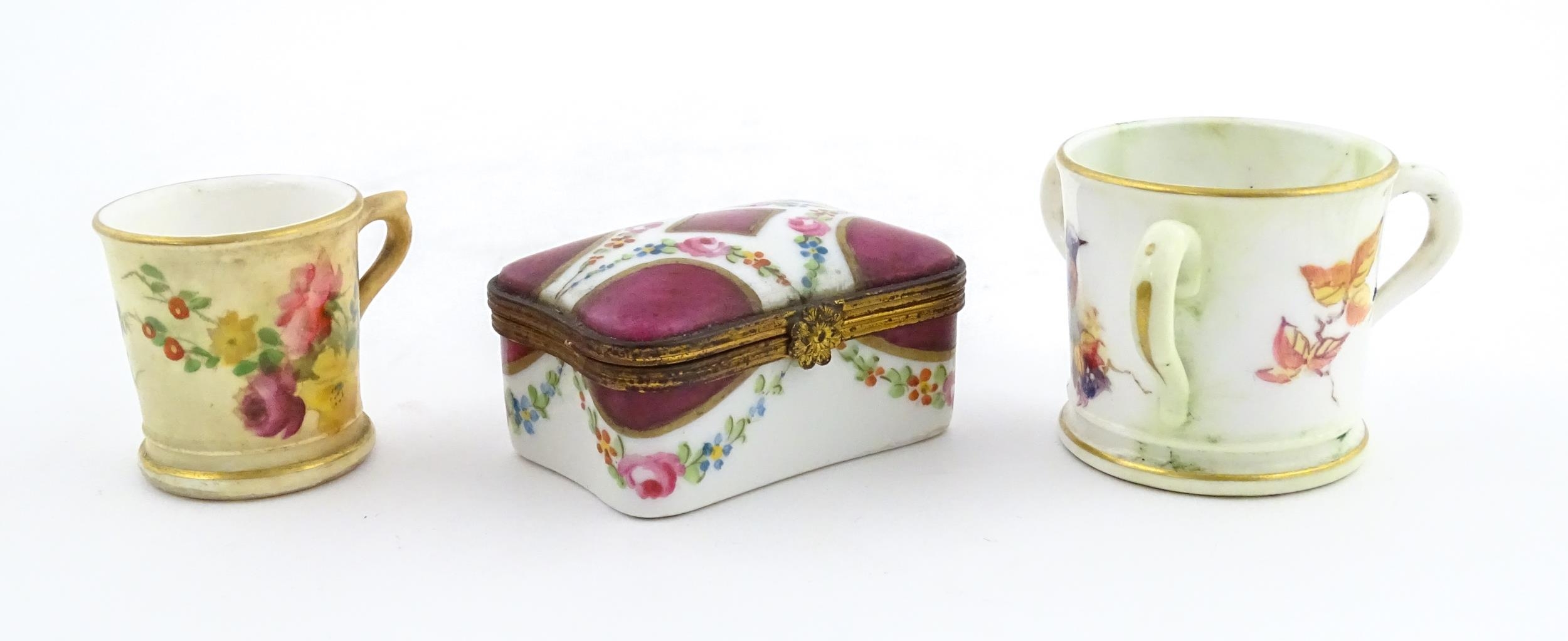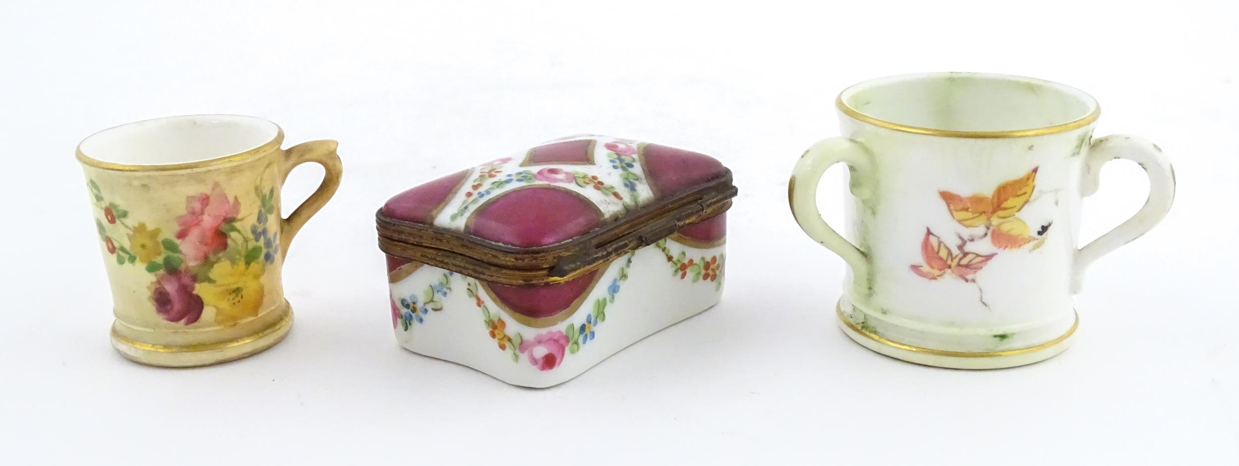 Two miniature Royal Worcester items comprising a mug with floral and foliate decoration, and a tyg with foliate detail. Together with a Continental porcelain pill box decorated with floral swag decoration. Largest approx. 1 1/2" high (3)