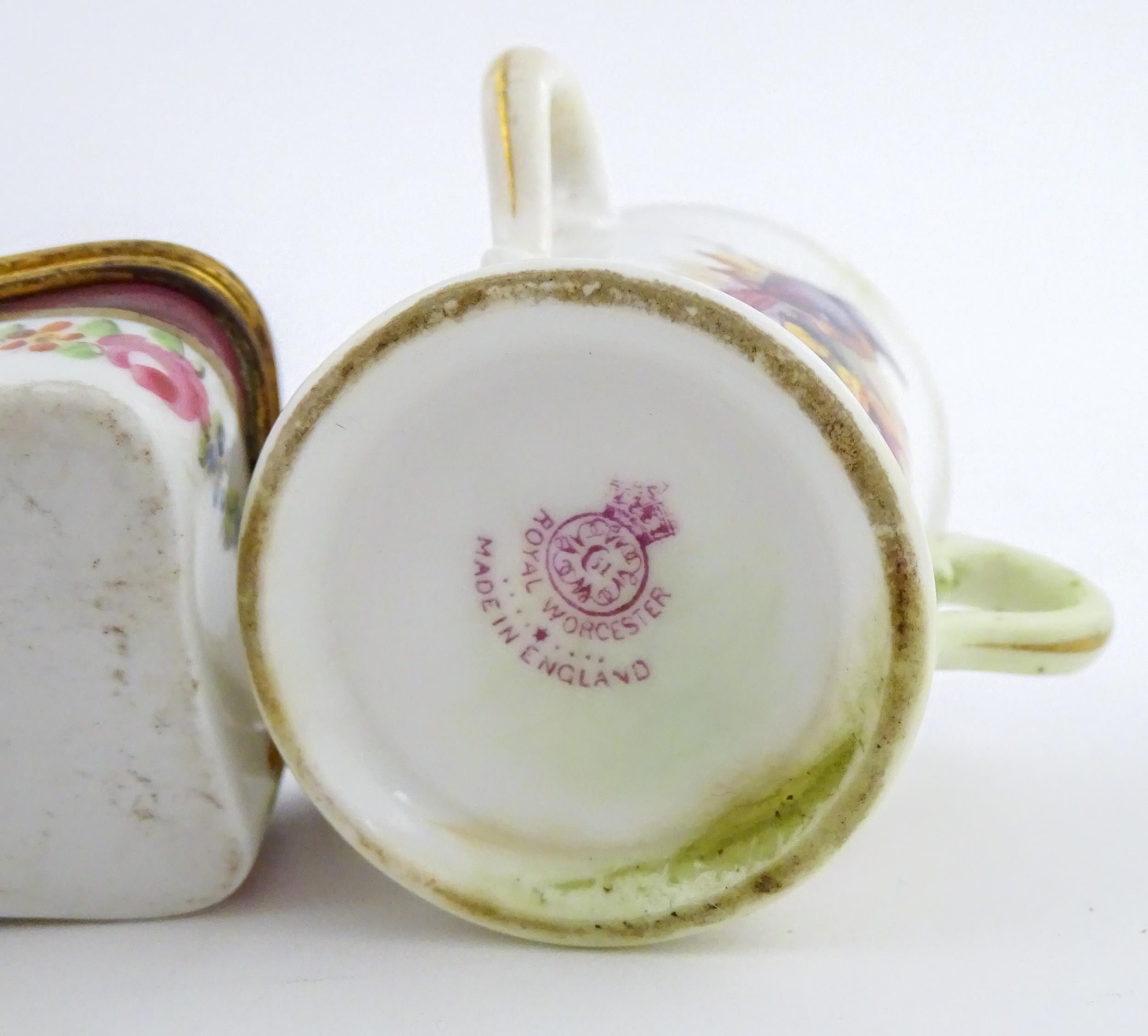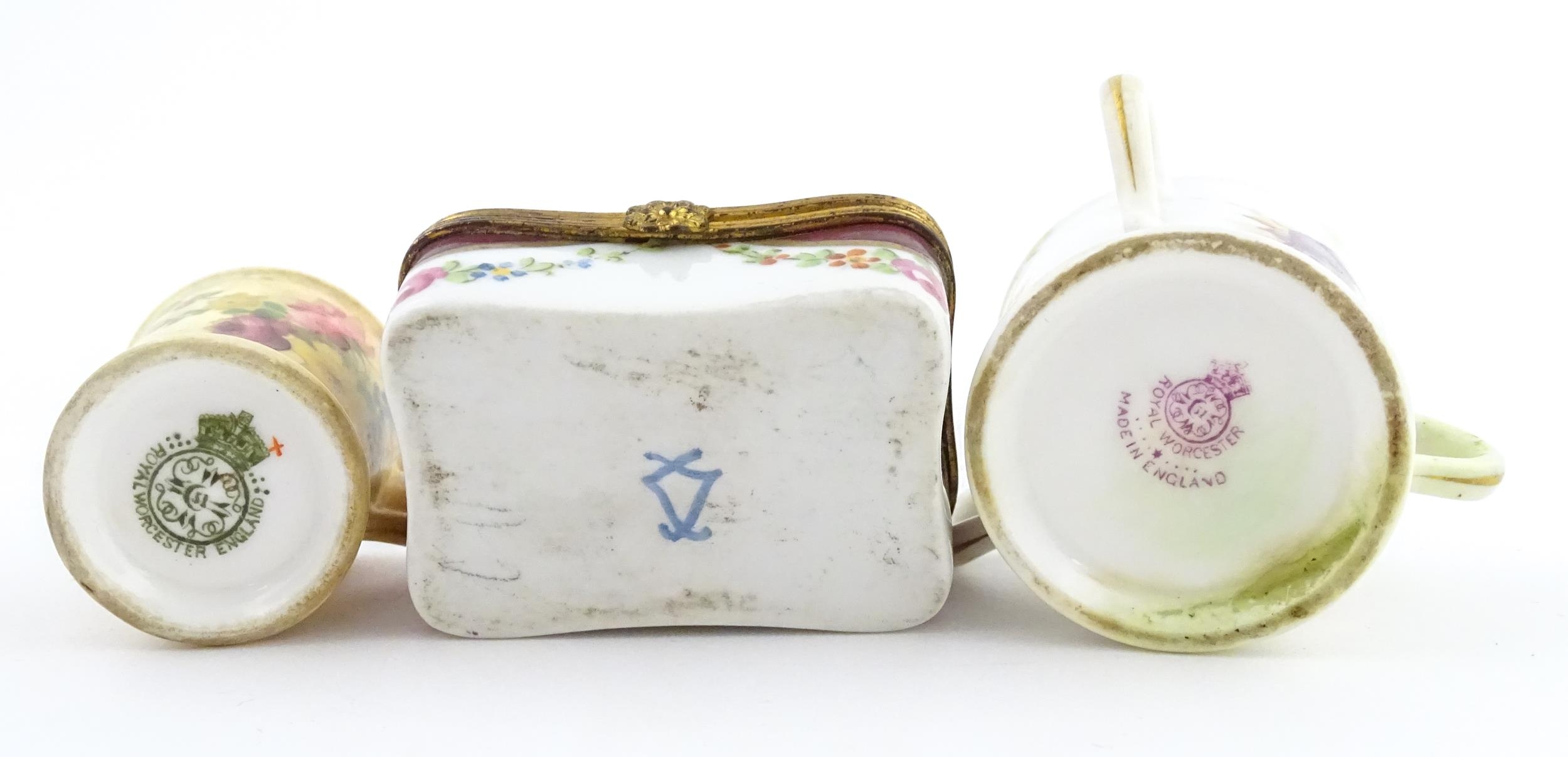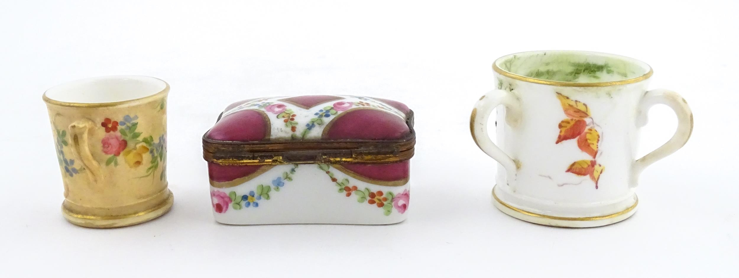Two miniature Royal Worcester items comprising a mug with floral and foliate decoration, and a tyg with foliate detail. Together with a Continental porcelain pill box decorated with floral swag decoration. Largest approx. 1 1/2" high (3)