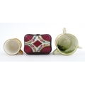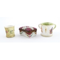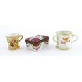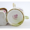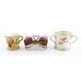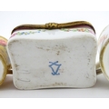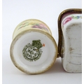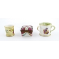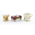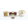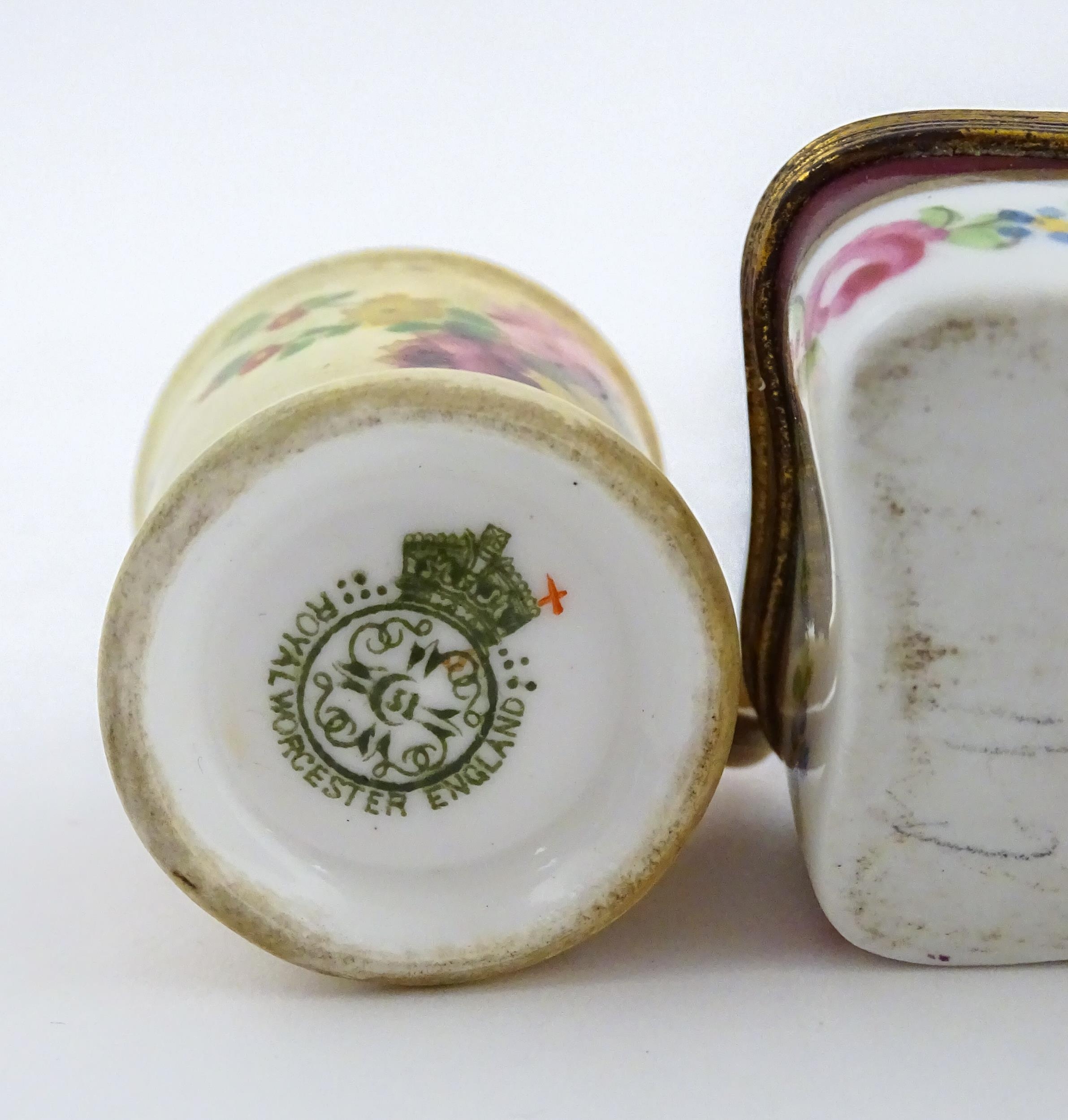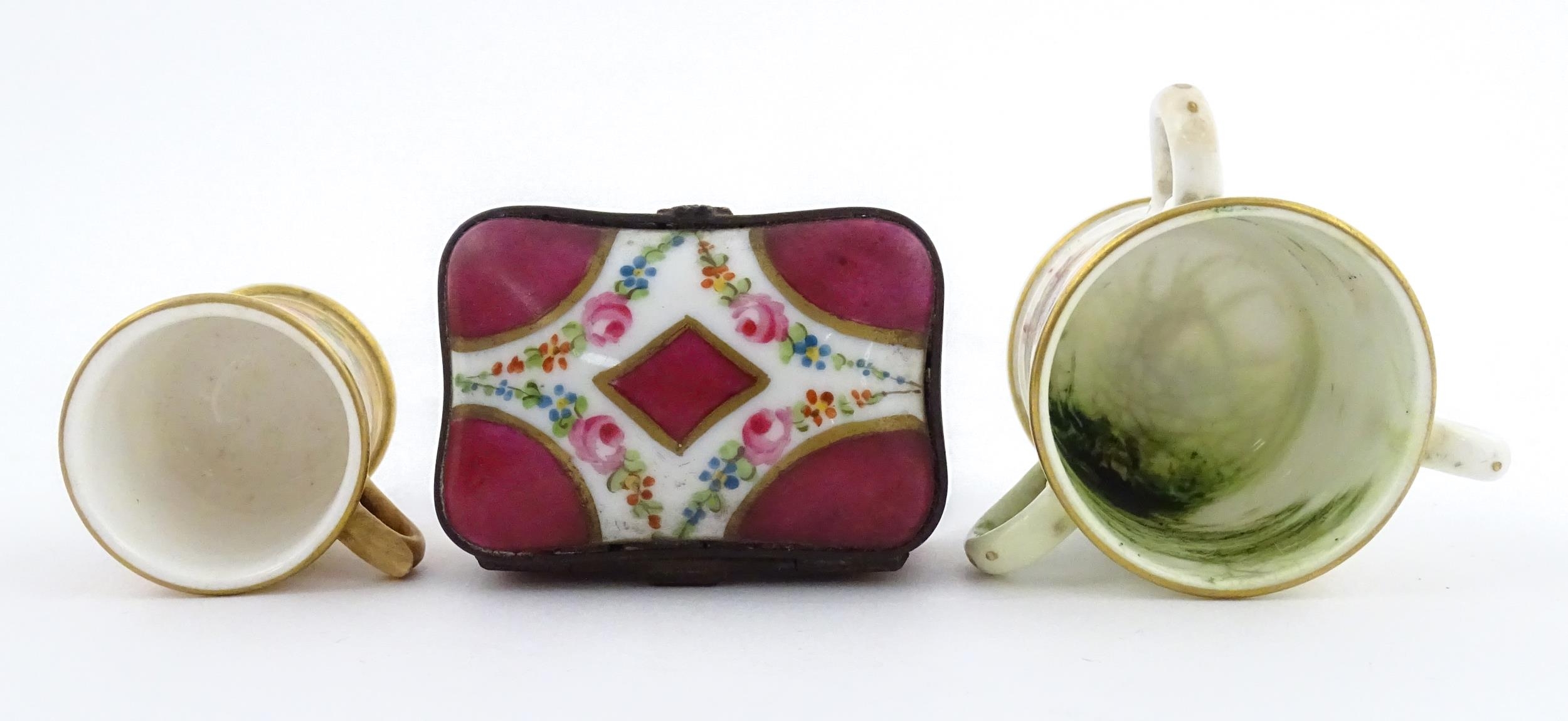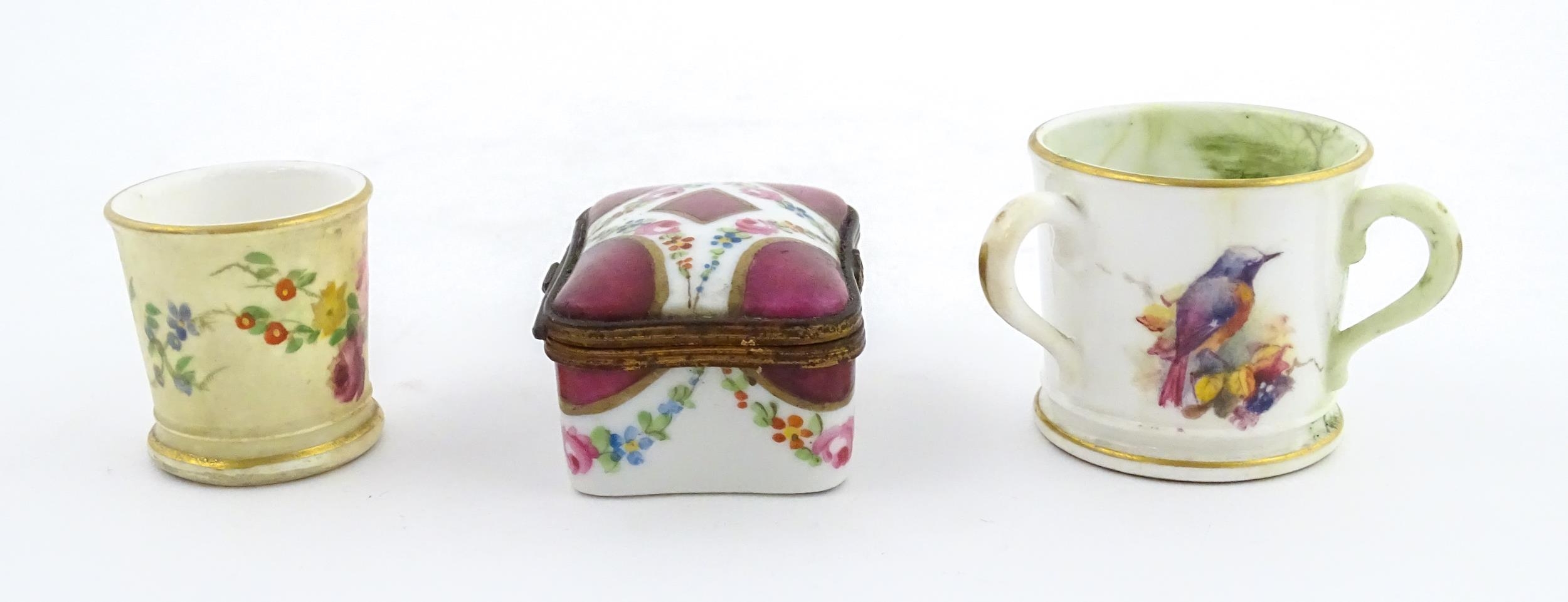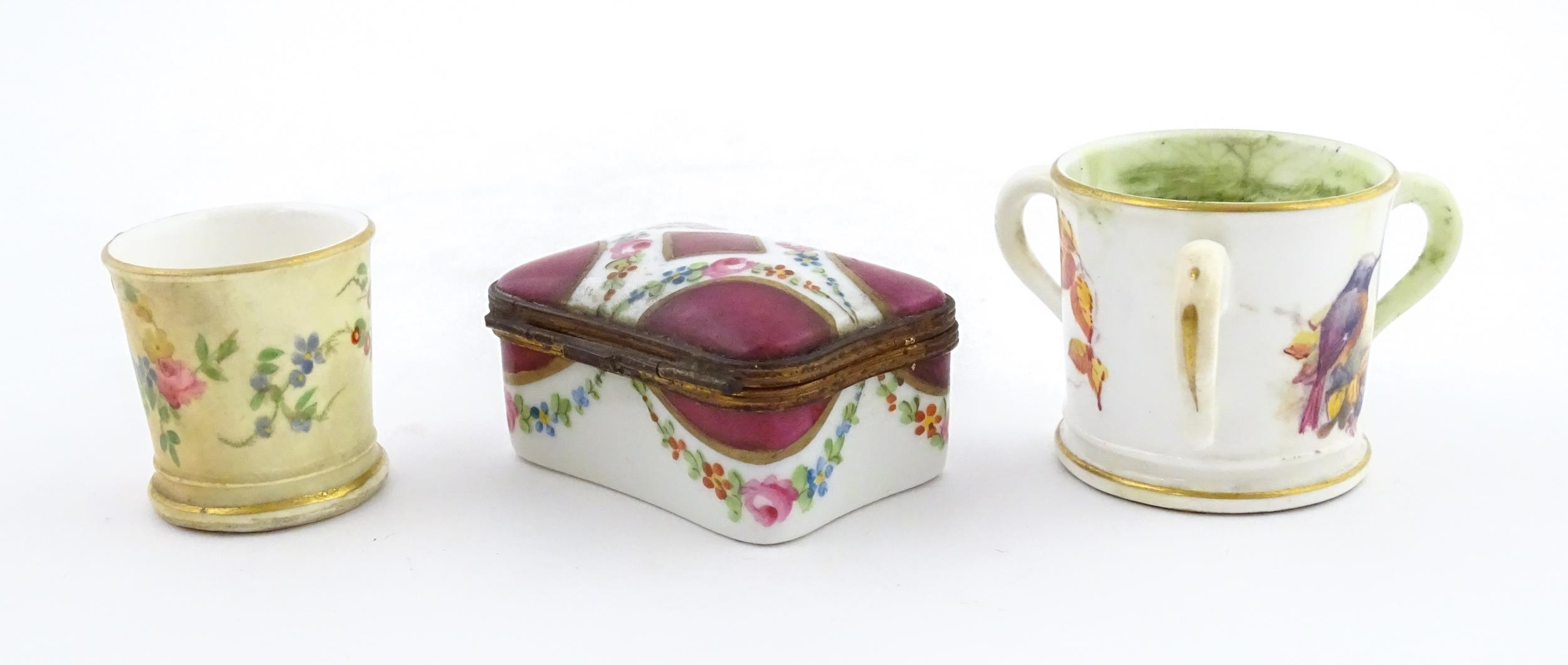 Two miniature Royal Worcester items comprising a mug with floral and foliate decoration, and a tyg with foliate detail. Together with a Continental porcelain pill box decorated with floral swag decoration. Largest approx. 1 1/2" high (3)