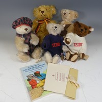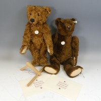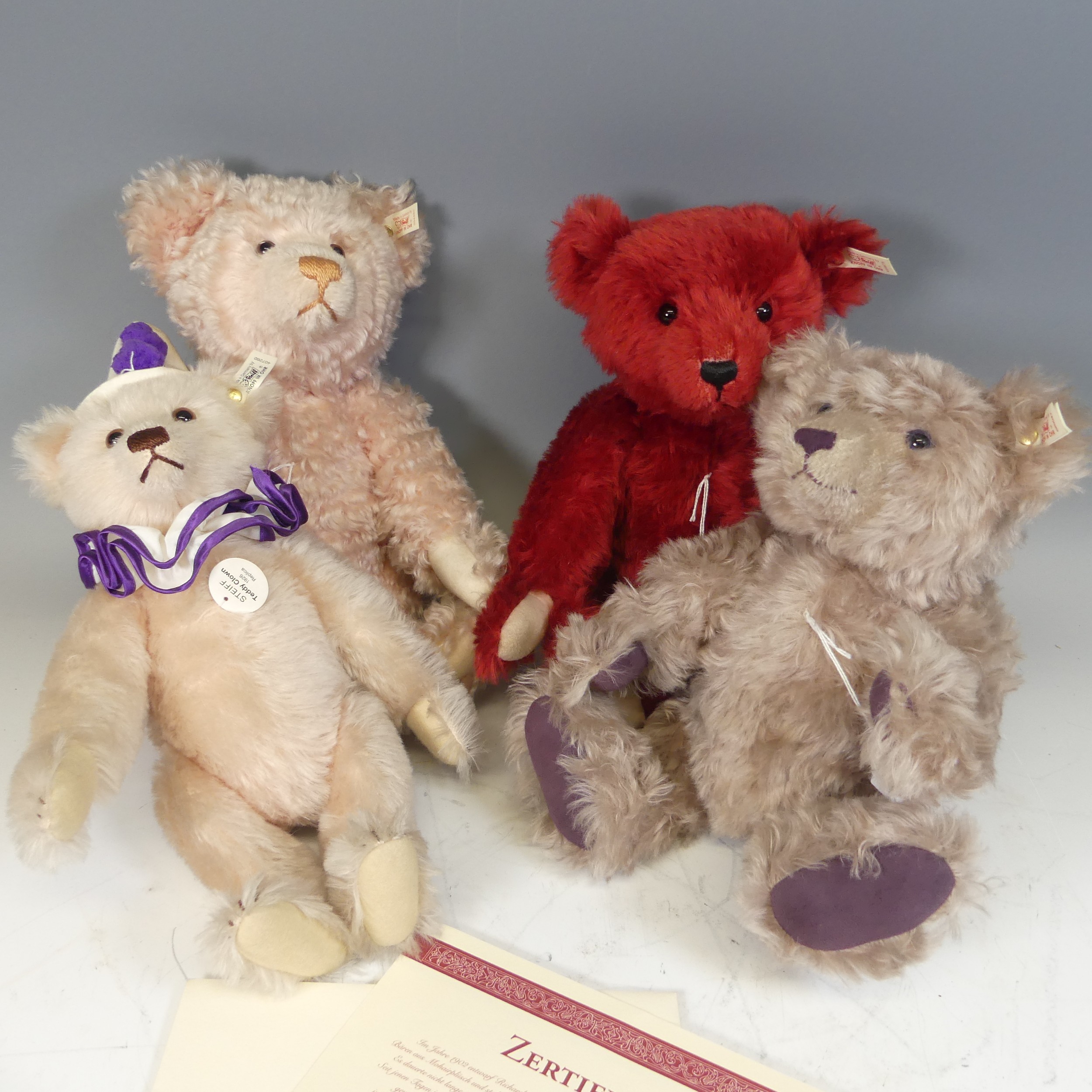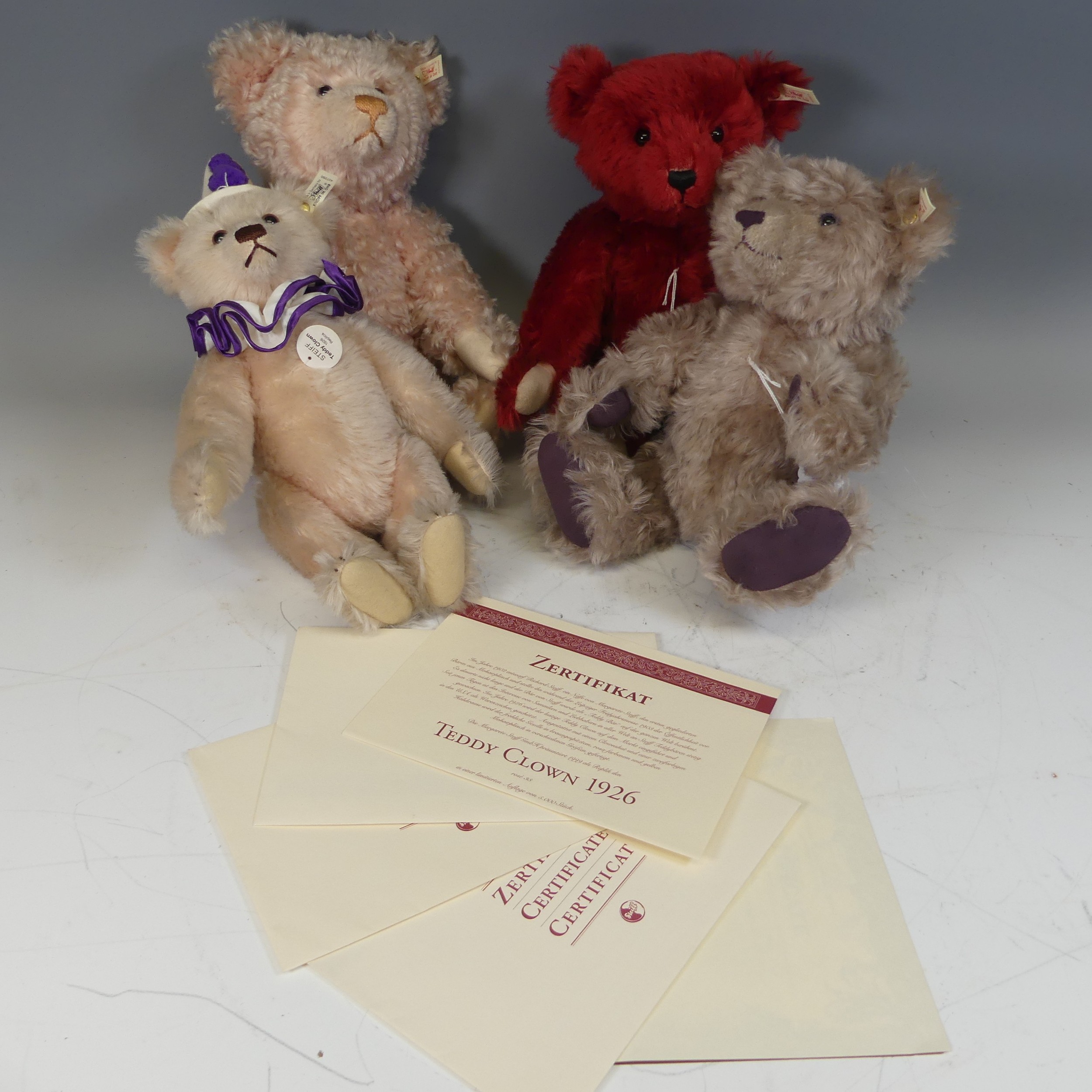 Steiff; British Collector's 1998 Teddy Bear, white tag 659973 347 / 4000, 1998, burgundy mohair, lacking chest tag, with certificate, together with 1997 Collector's Bear, 654480 2671 / 3000, rose mohair, lacking chest tag, with certificate, 1926 Teddy Clown replica, 1999, 407260 867 / 5000, rose, with chest tag and certificate, and 1999 Collector's Bear, 660047, 2644 / 3000, lilac, lacking check tag, with certificate. (4)
