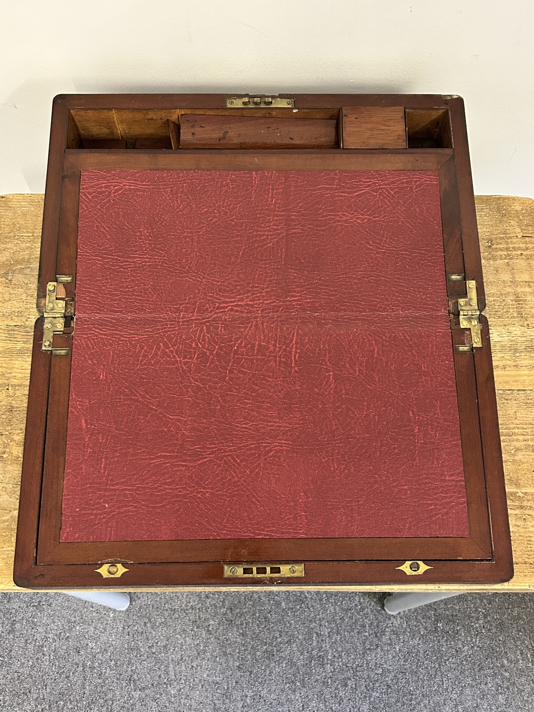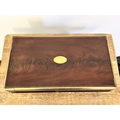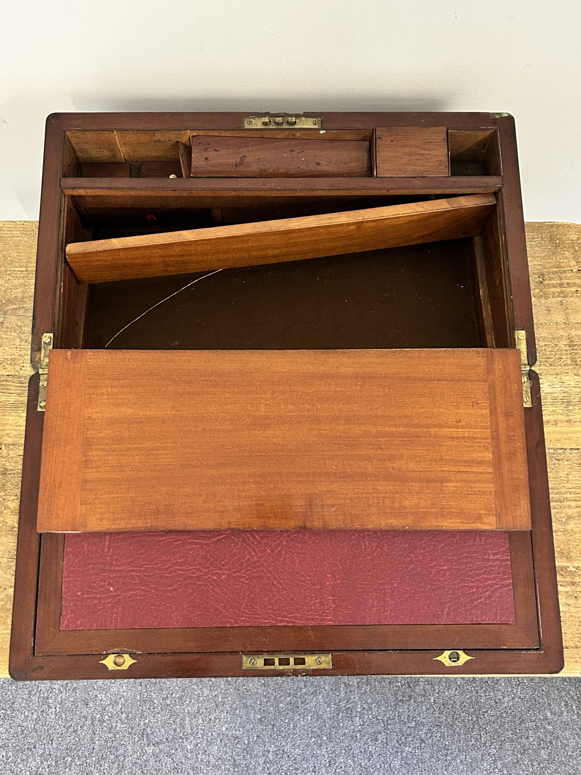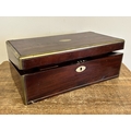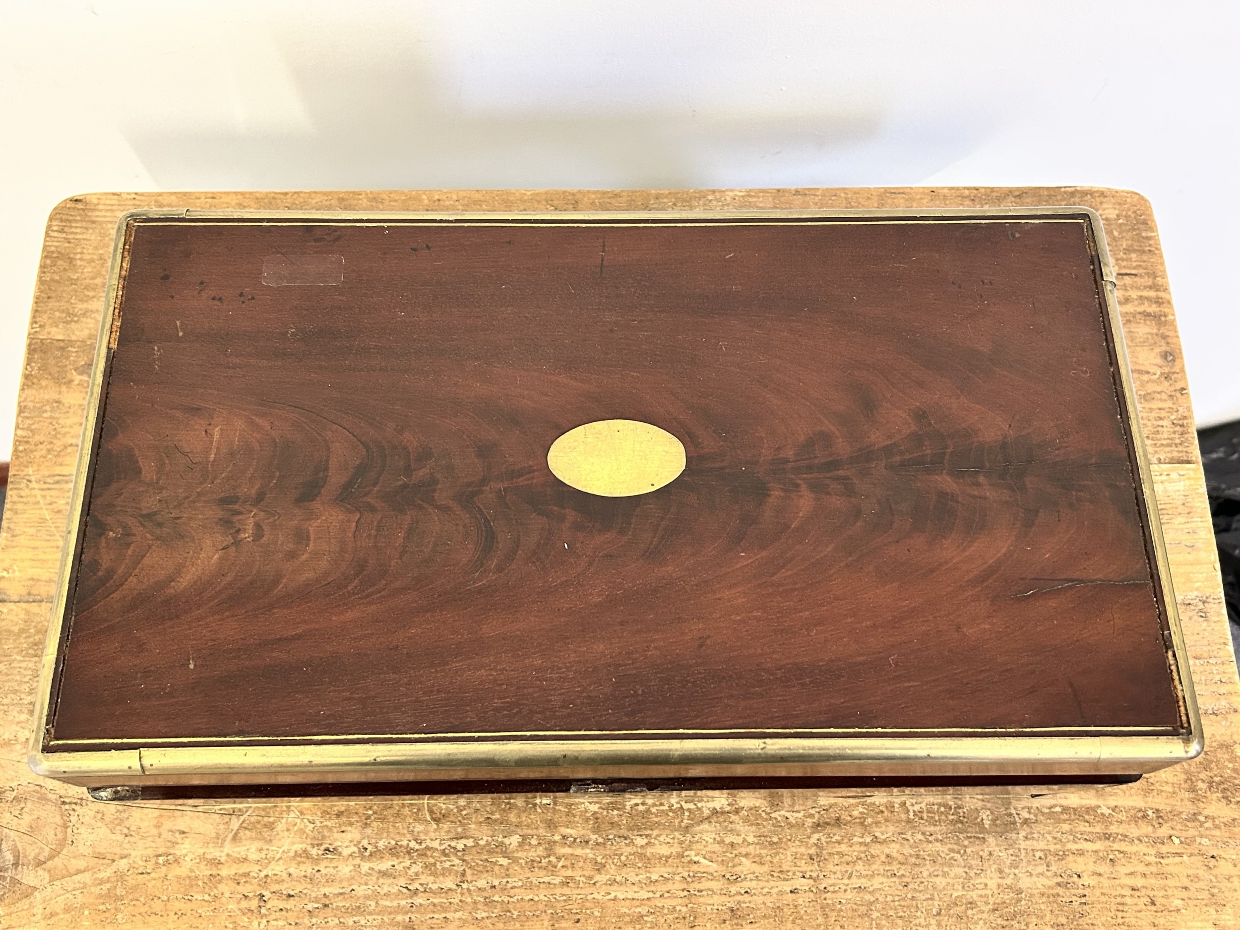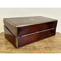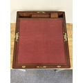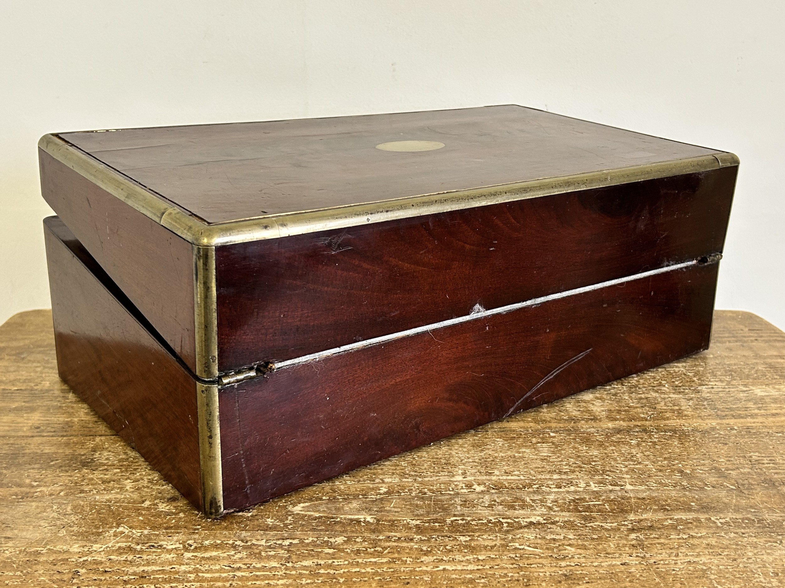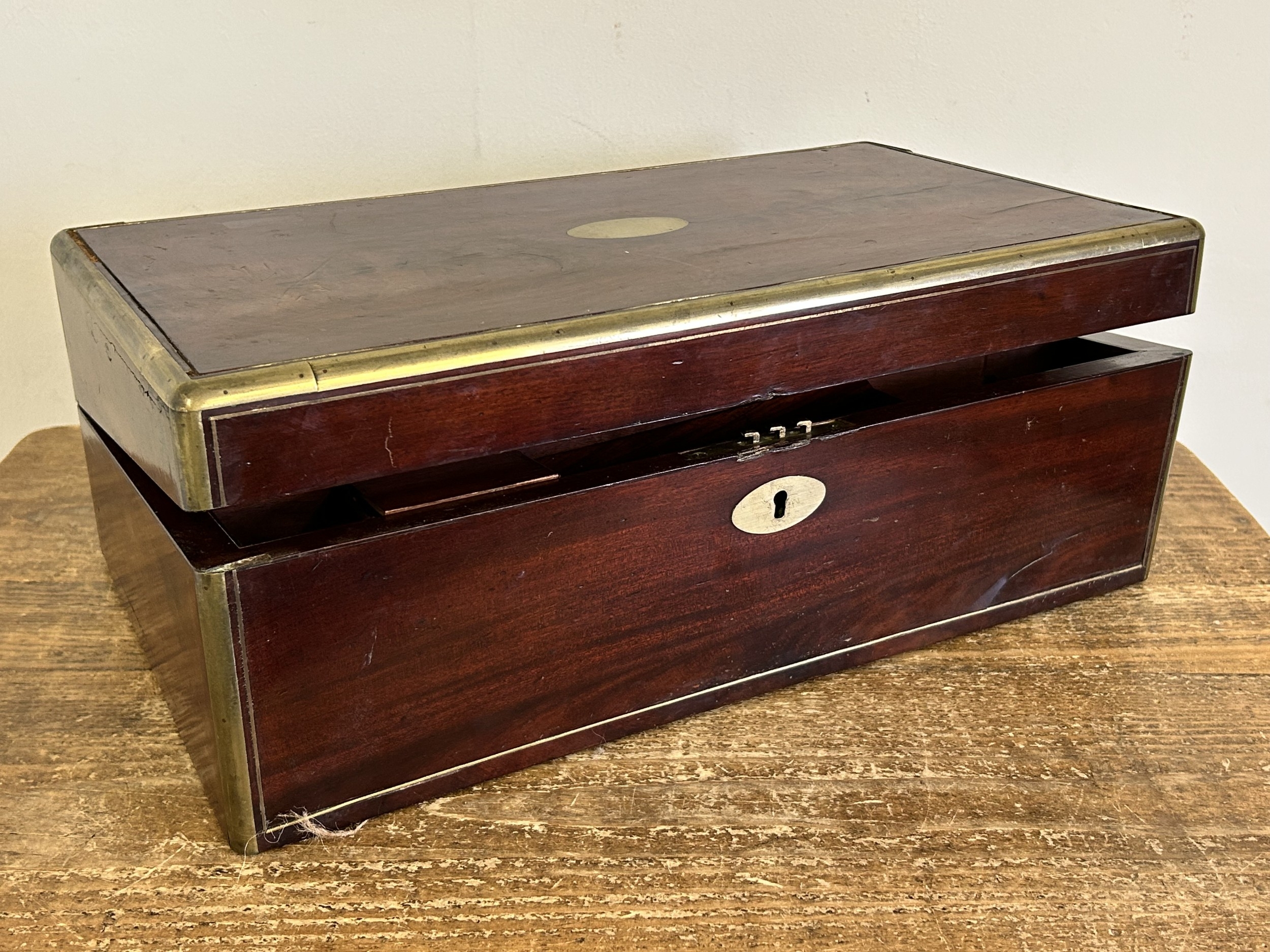An antique brass banded writing slope with secret drawer, 17 3/4" long (no key, requires some work)