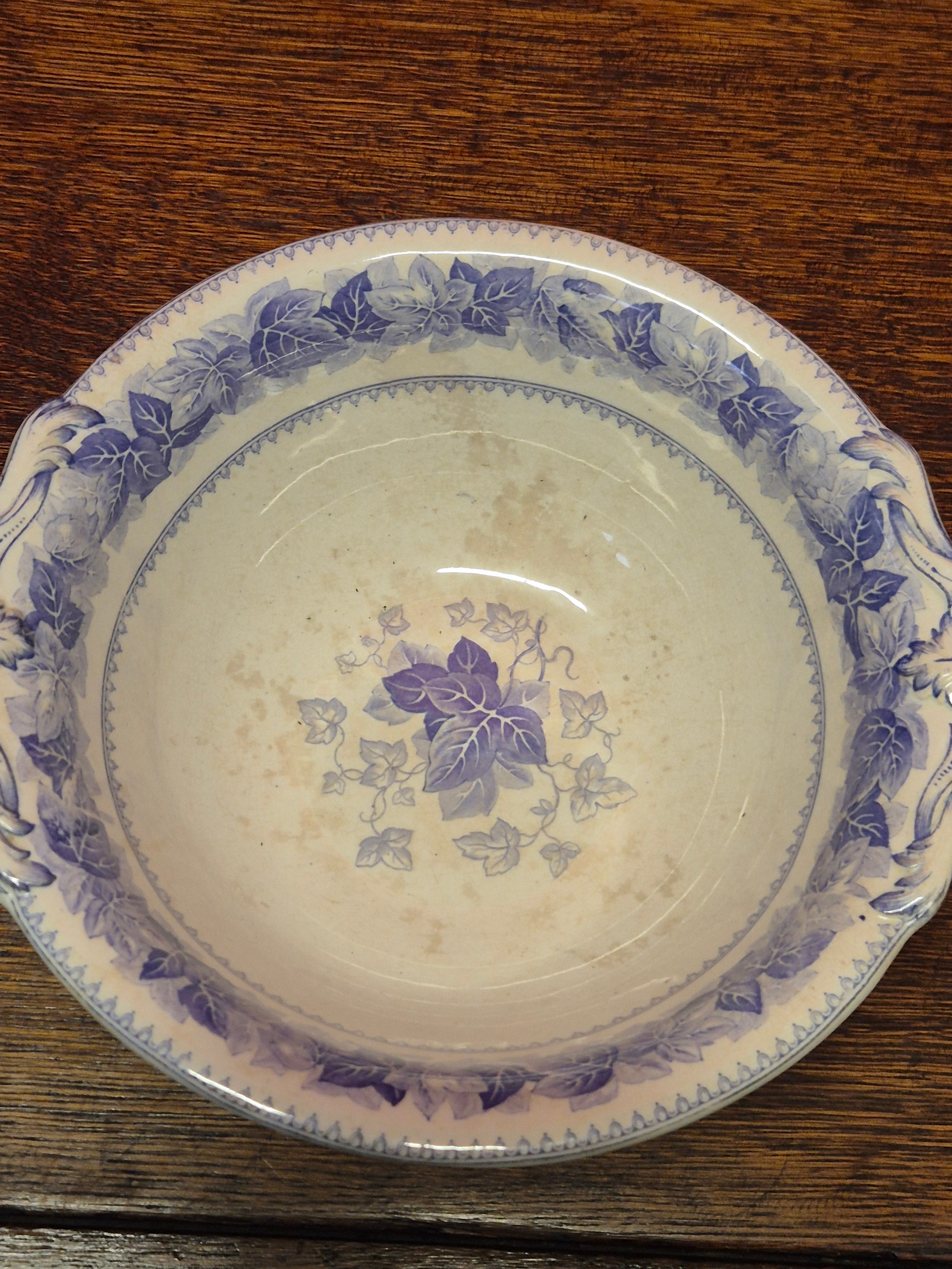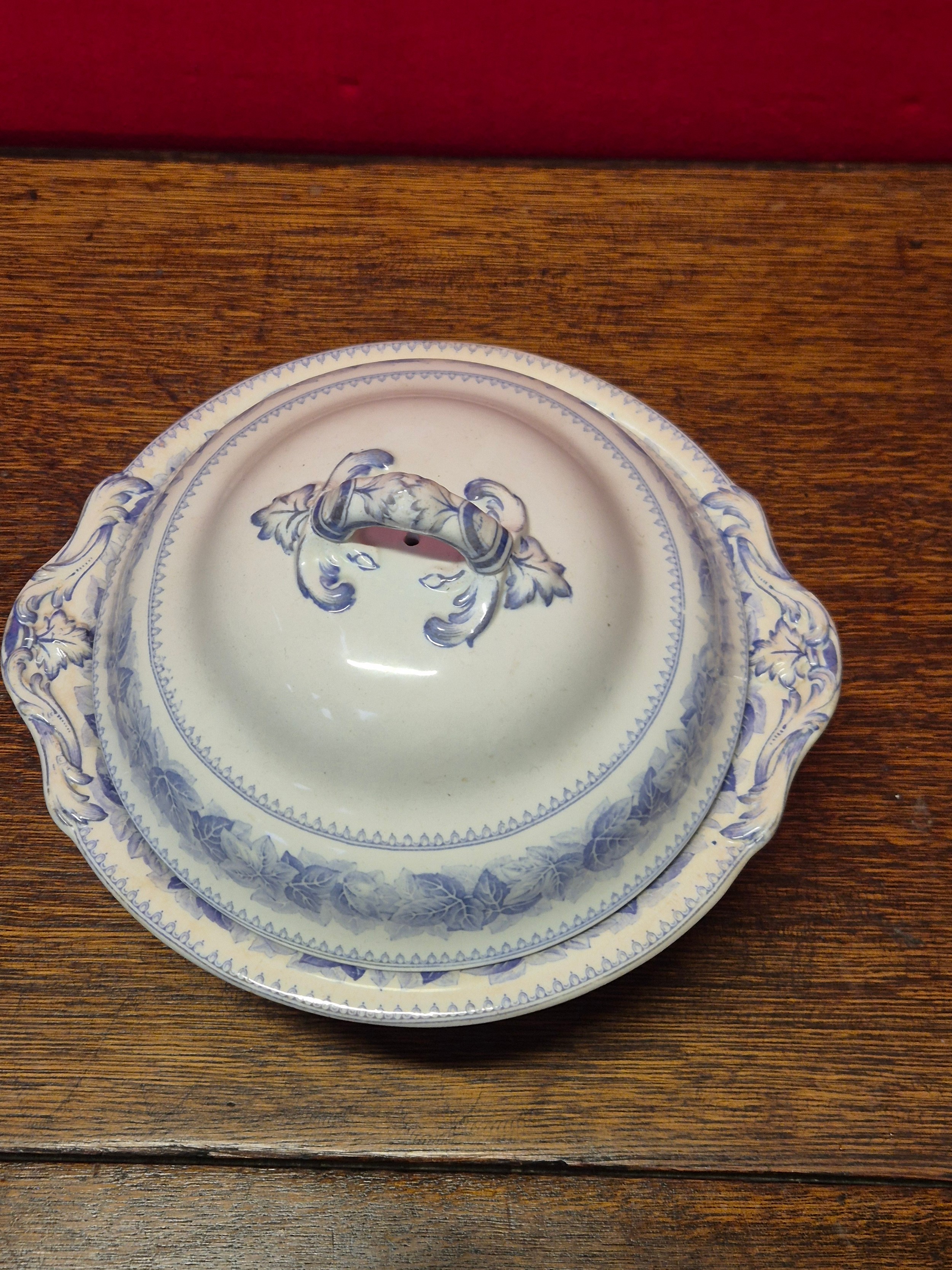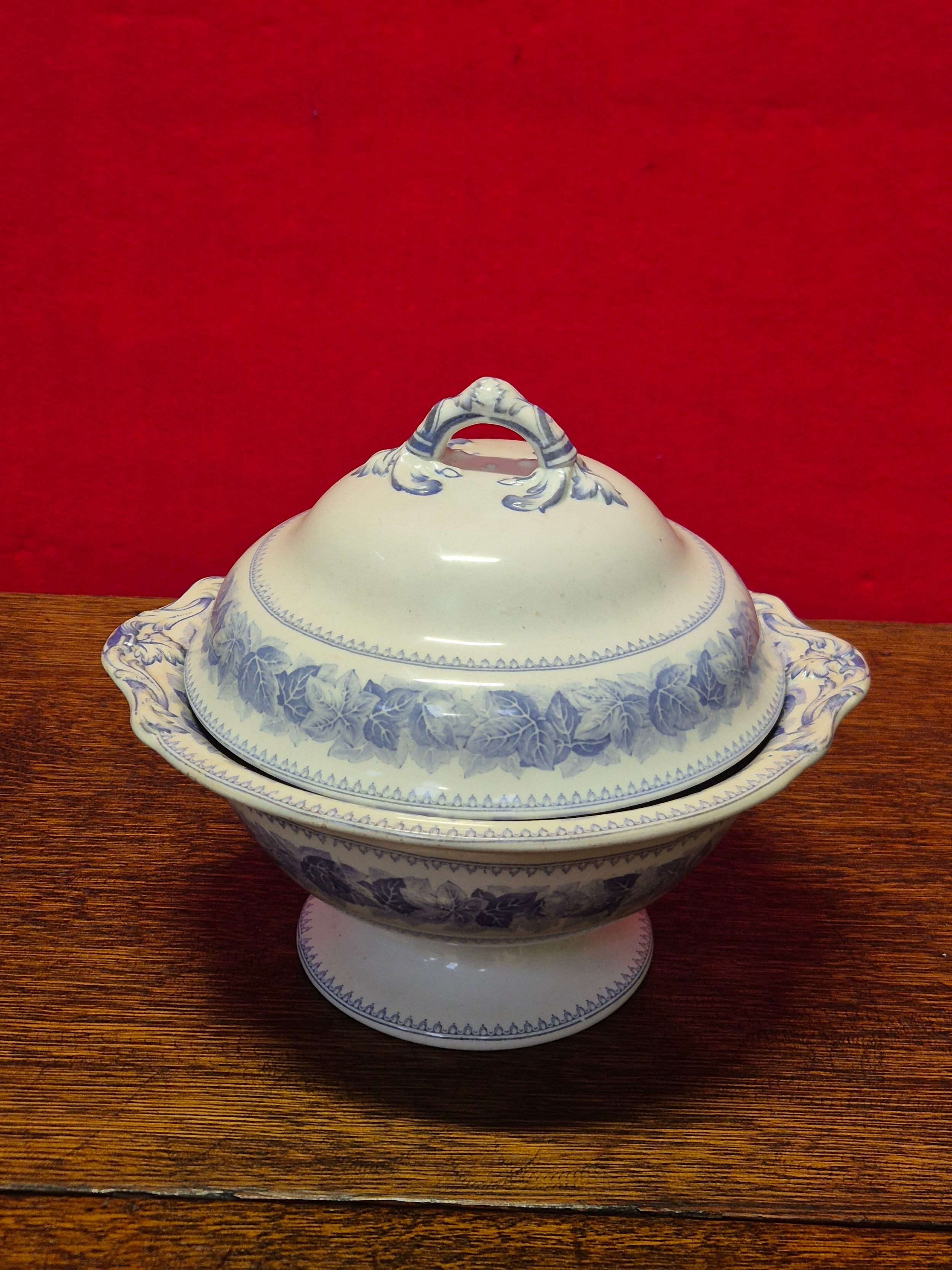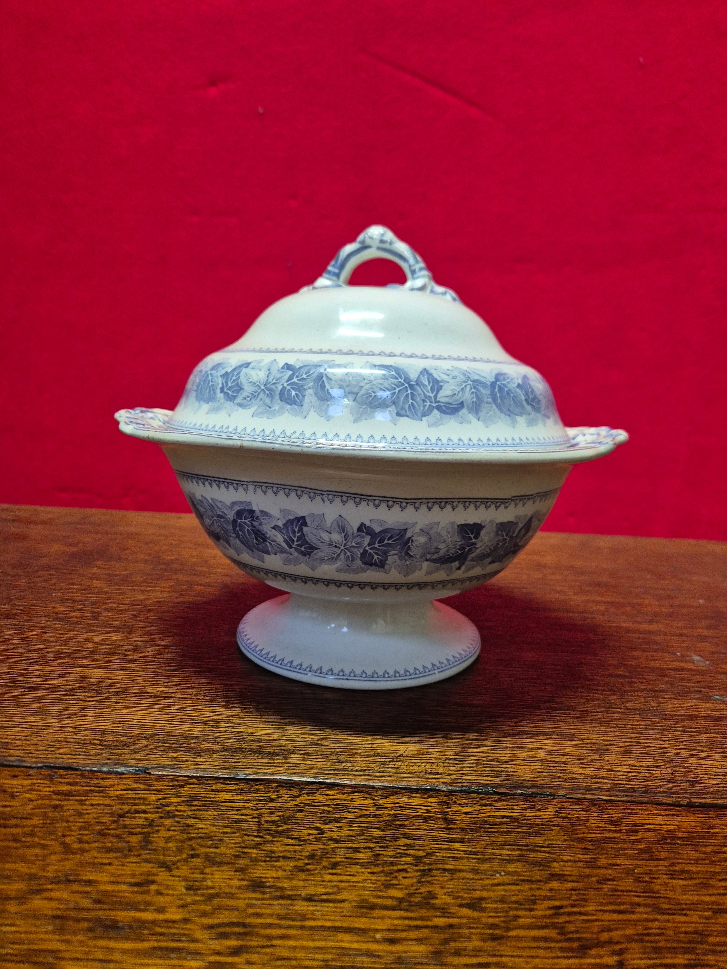 Victorian Copeland Spode blue and white tureen or soupiere in the Ivy leaf pattern. Impressed makers mark to the underside of the dish, along with transfer marks to both pieces.
