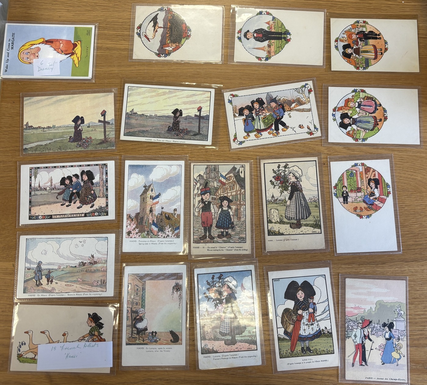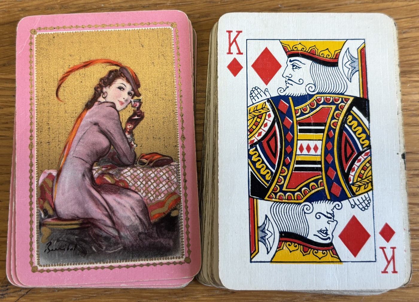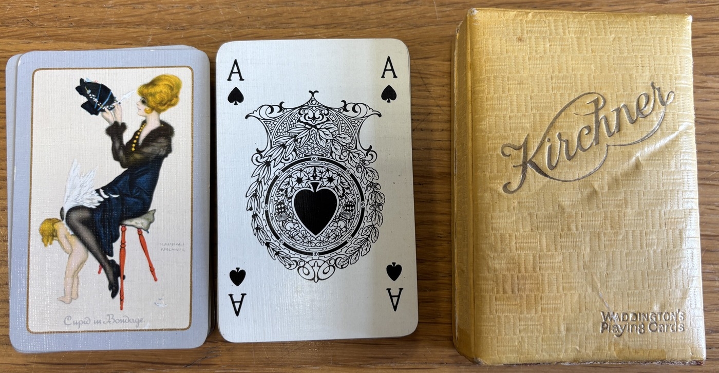 Range of playing cards, generally very good, including Kirchner's 'Cupid and Bondage' complete set in box by Waddingtons's Playing Cards and Barribal with 'Lady Sipping Cocktail' part set (48). Plus range of postcards by Hansi (18). (T)