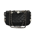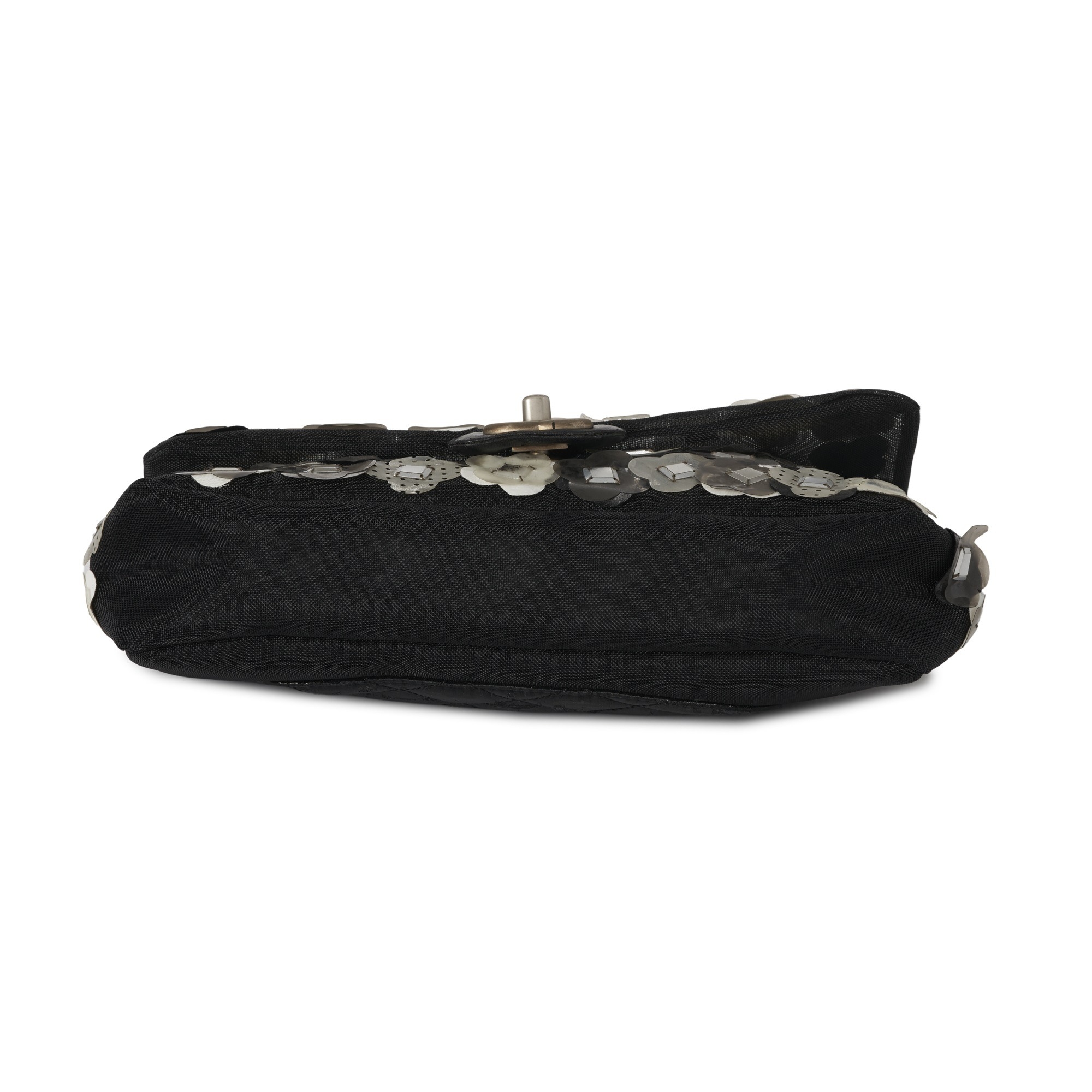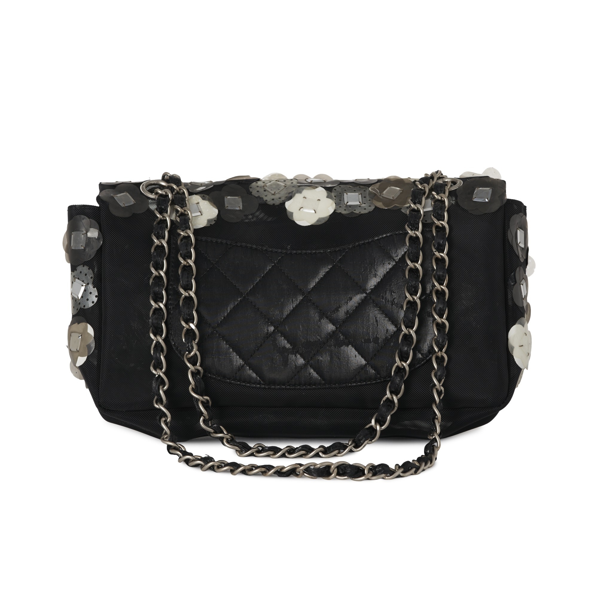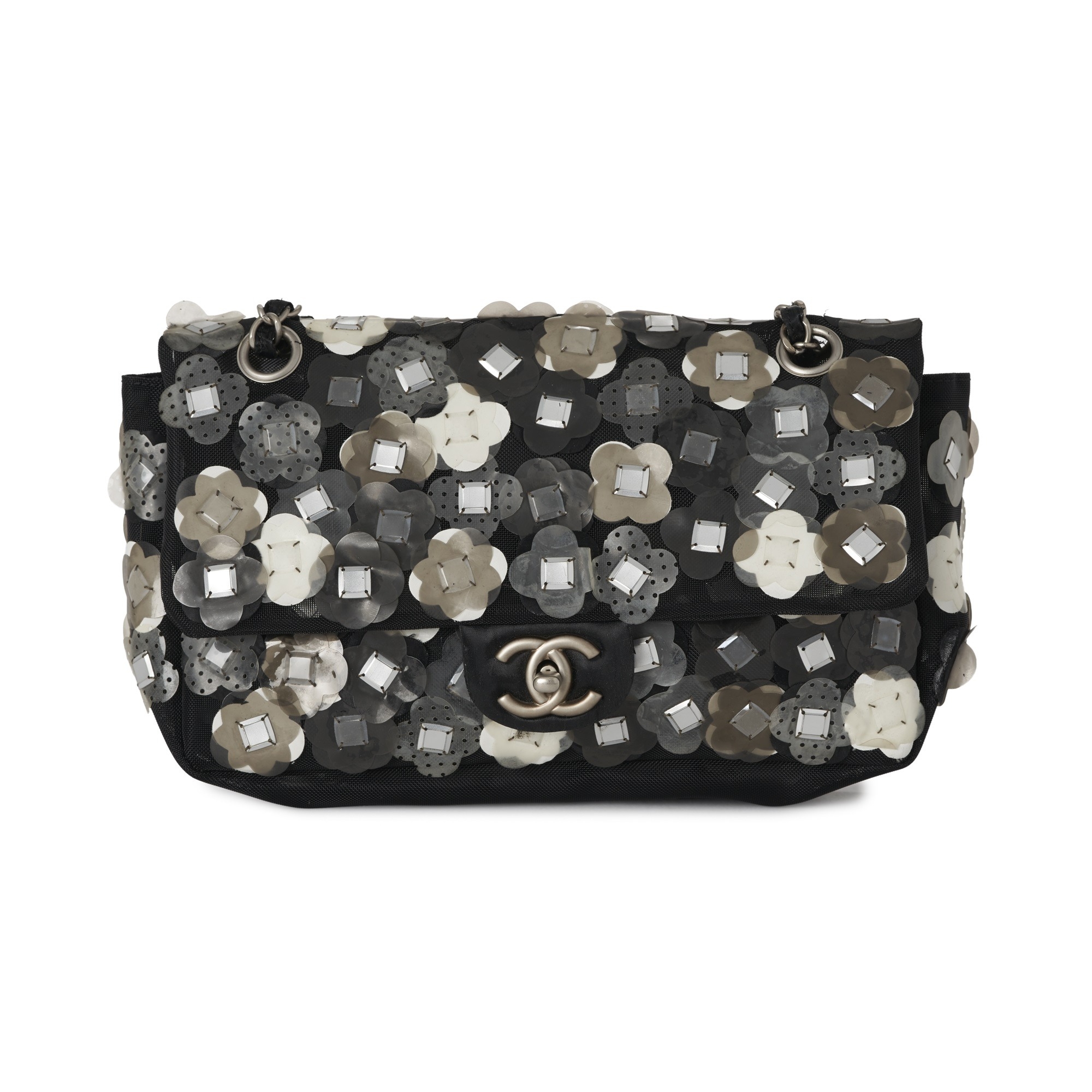 Chanel, a mesh Paillette Flap handbag, featuring a black mesh exterior with floral paillette embellishments in white and grey shades, with a rear patch pocket, silver-tone hardware, chain link shoulder strap and signature CC turn lock fastening, measuring 6 by 15 by 25cm