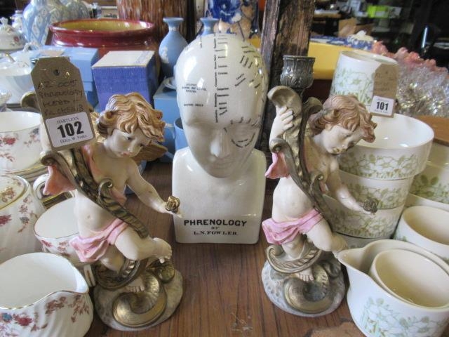 PHRENOLOGY HEAD AND A PAIR OF CHERUB CANDLESTICKS