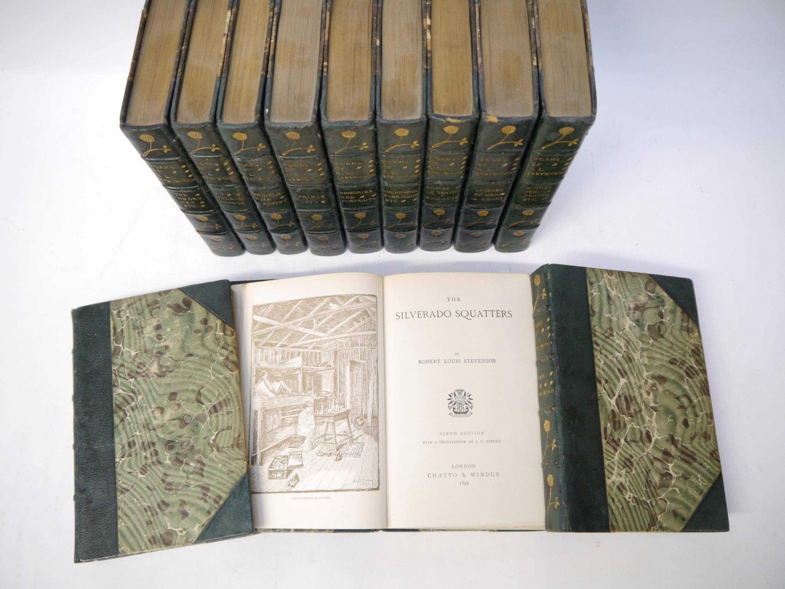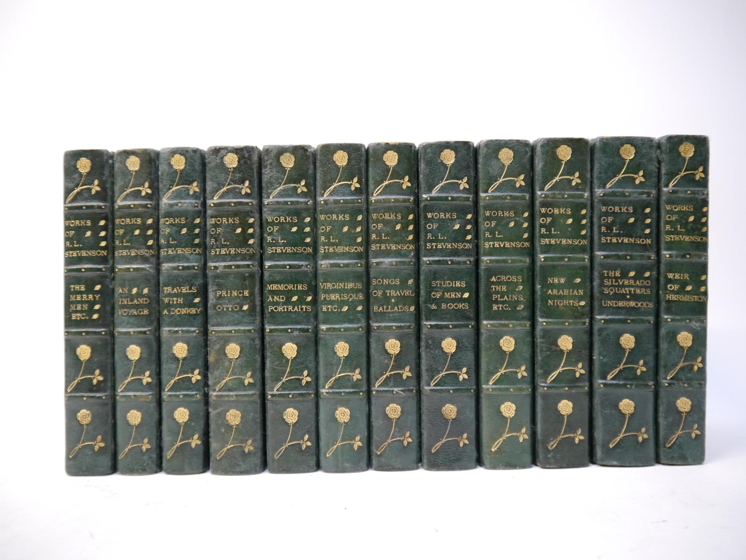 Robert Louis Stevenson: 'Works', London, Chatto & Windus, 1896-1899, 14 volumes in 12, 'Weir of Hermiston' 1896, 2nd edition, others later editions/new editions, uniform old half green morocco, spines decorated in gilt in compartments, top edges gilt, armorial bookplates (12)