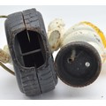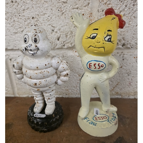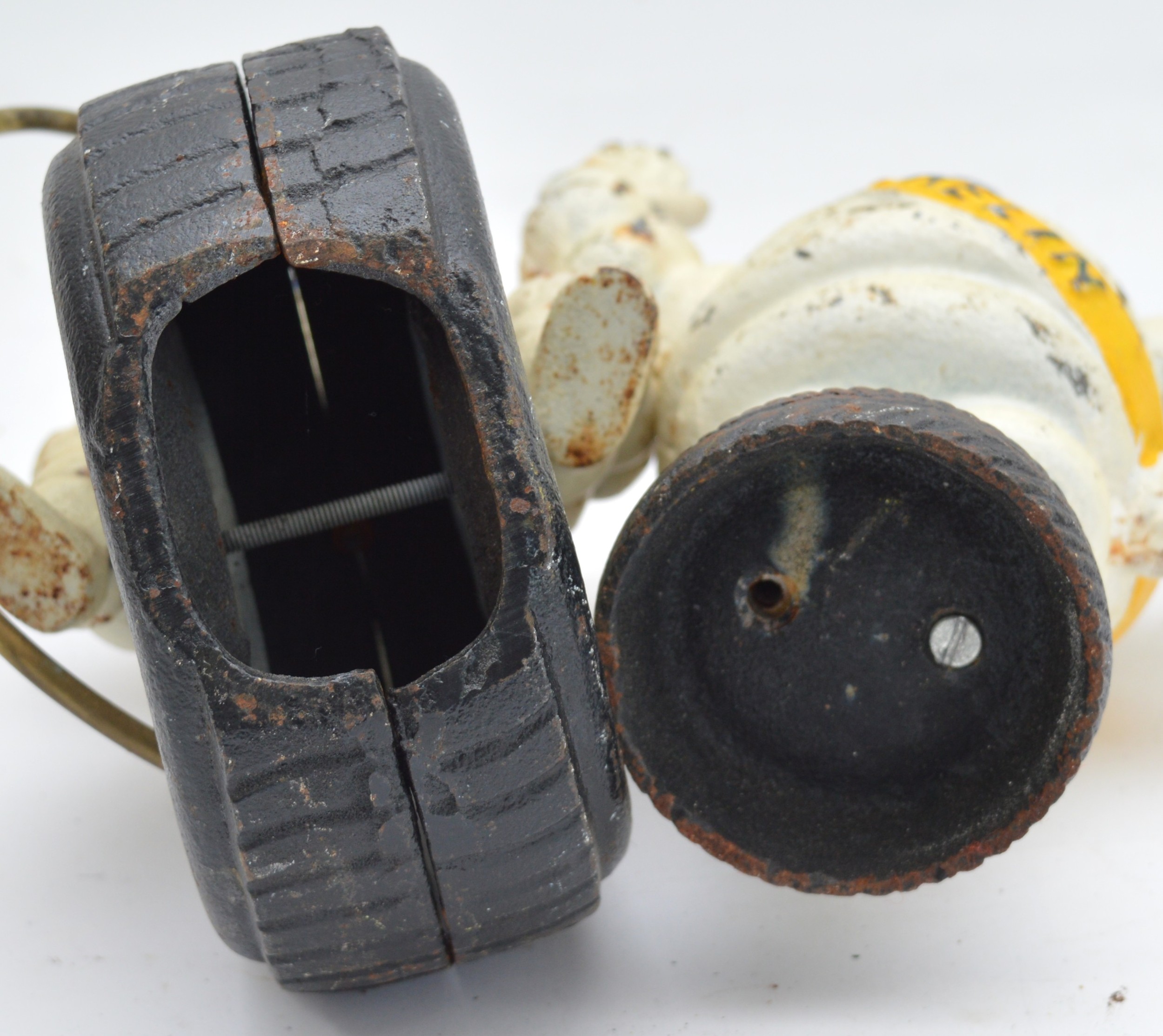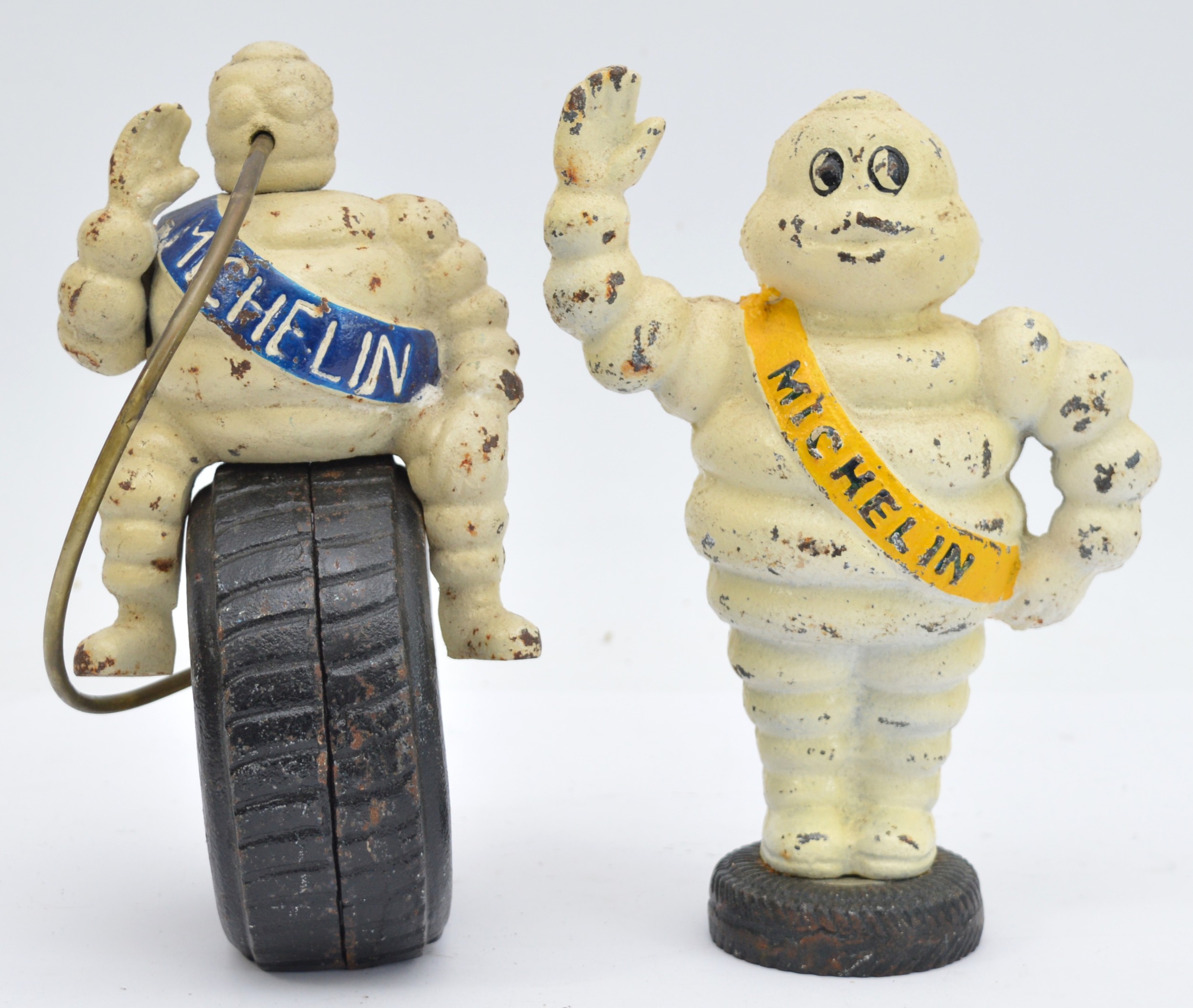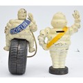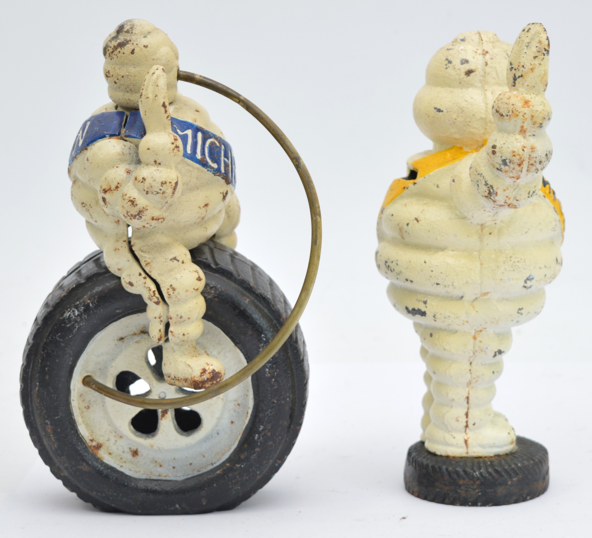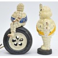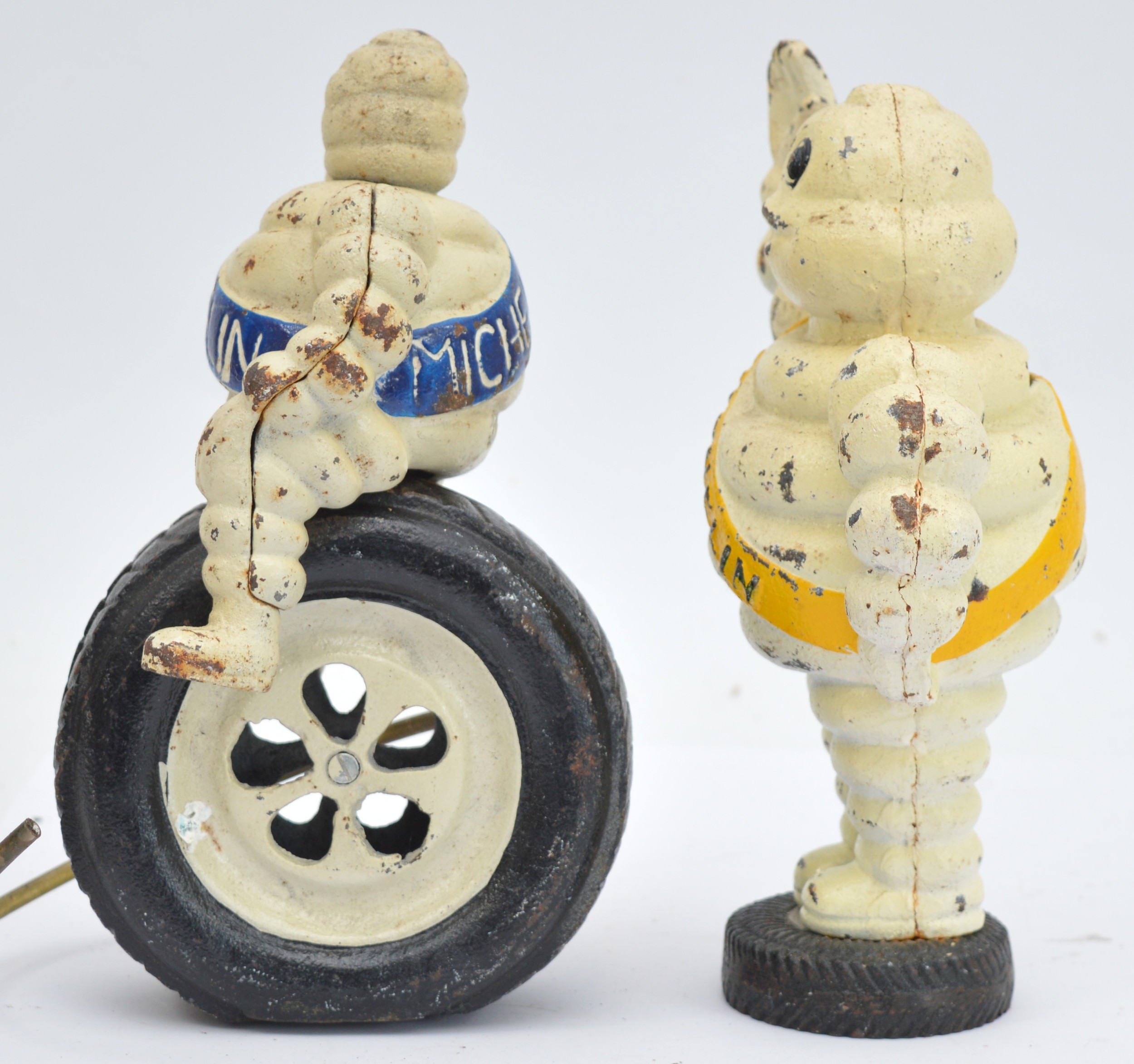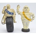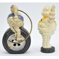 A painted cast iron Michelin man riding a wheel, 24cm and another waving (2).