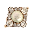 A baroque pearl and diamond ring, c1900, with cushion shaped and round old cut diamonds, in gold marked 18ct, 4g, size O