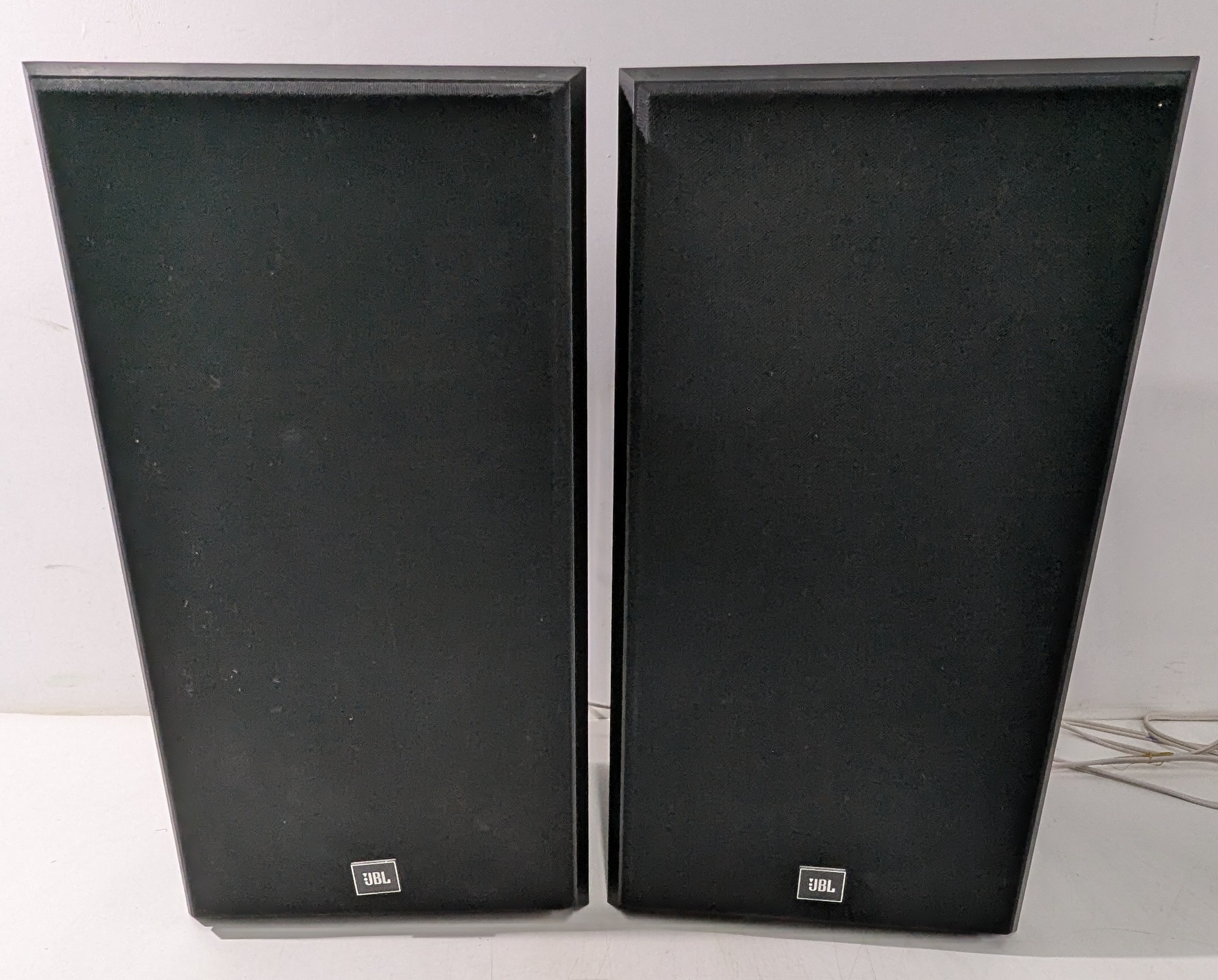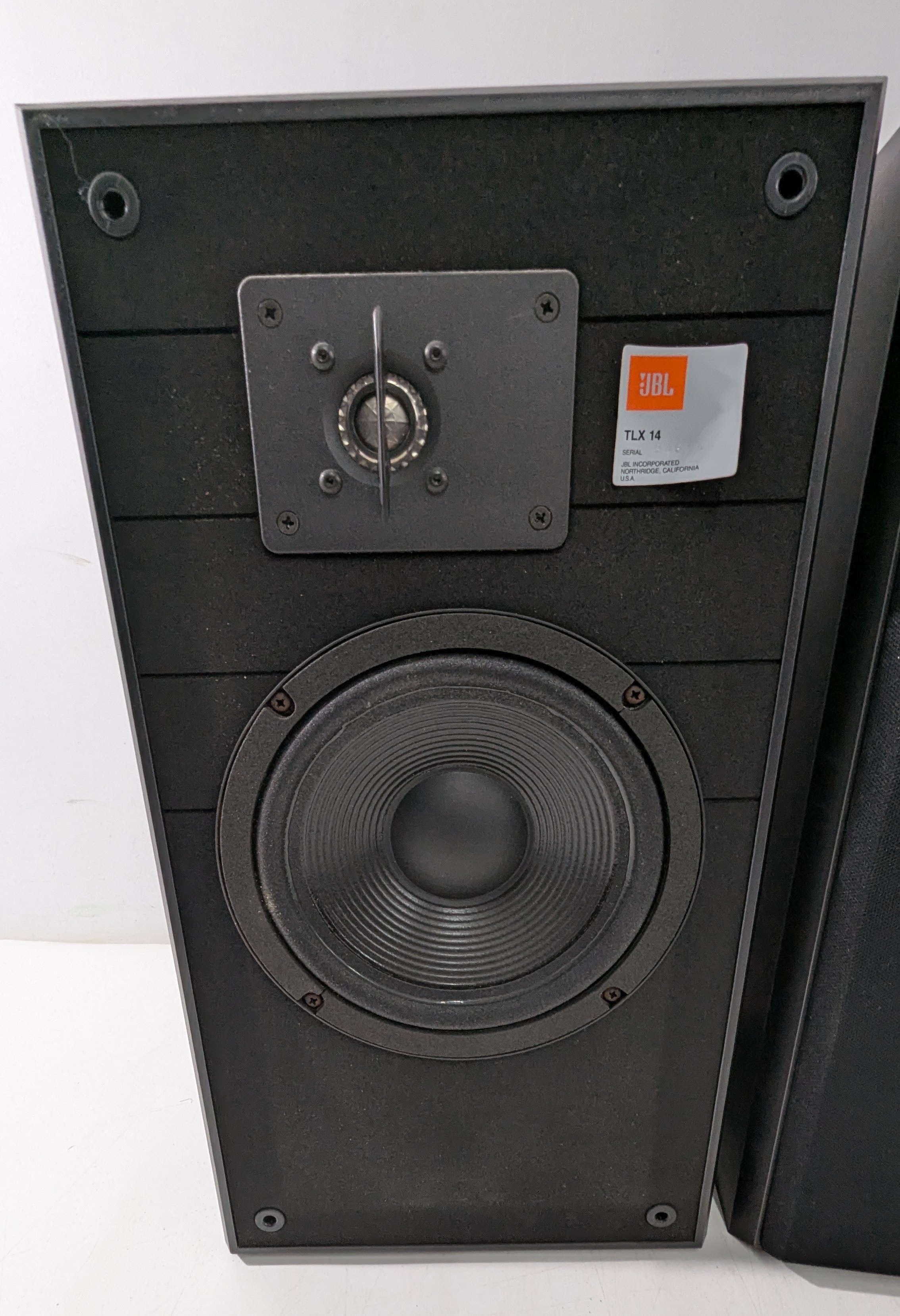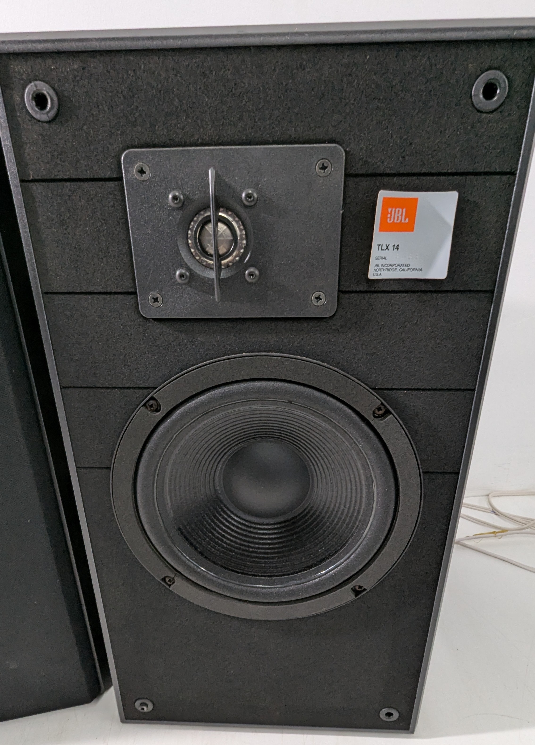 A pair of JBL TLX 14 loudspeakers, manufactured by JBL Incorporated, Northridge, California, USA. Classic two-way bookshelf design featuring JBL’s dynamic drivers and distinctive tweeter protection bars. Housed in black cabinets with removable grilles. Both speakers appear complete and tested working; some minor cosmetic marks consistent with age and use. Well-regarded for their clean, punchy sound and build quality typical of late 1980s–1990s JBL engineering.