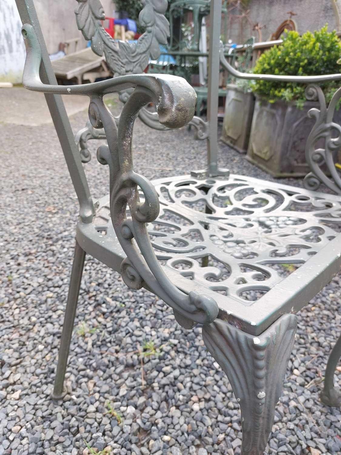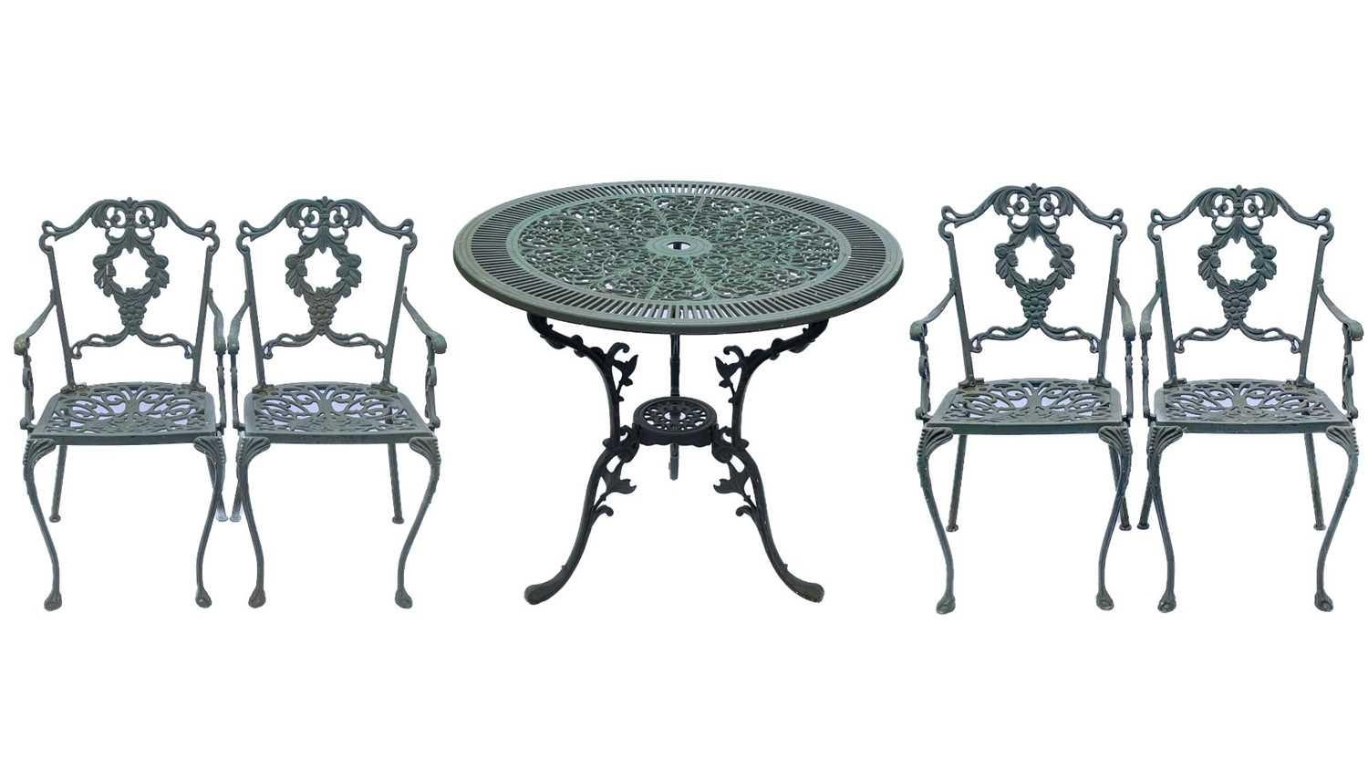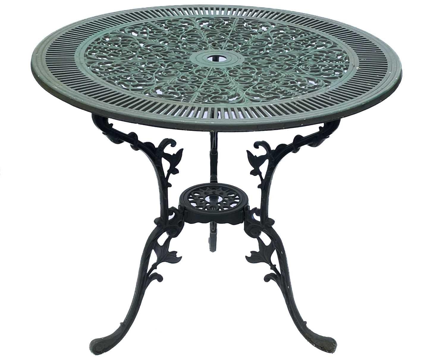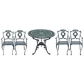 A green painted metal bistro set. Comprising a circular table, height 68.5cm, diameter 80cm, and four chairs (5).