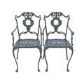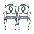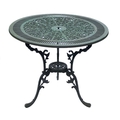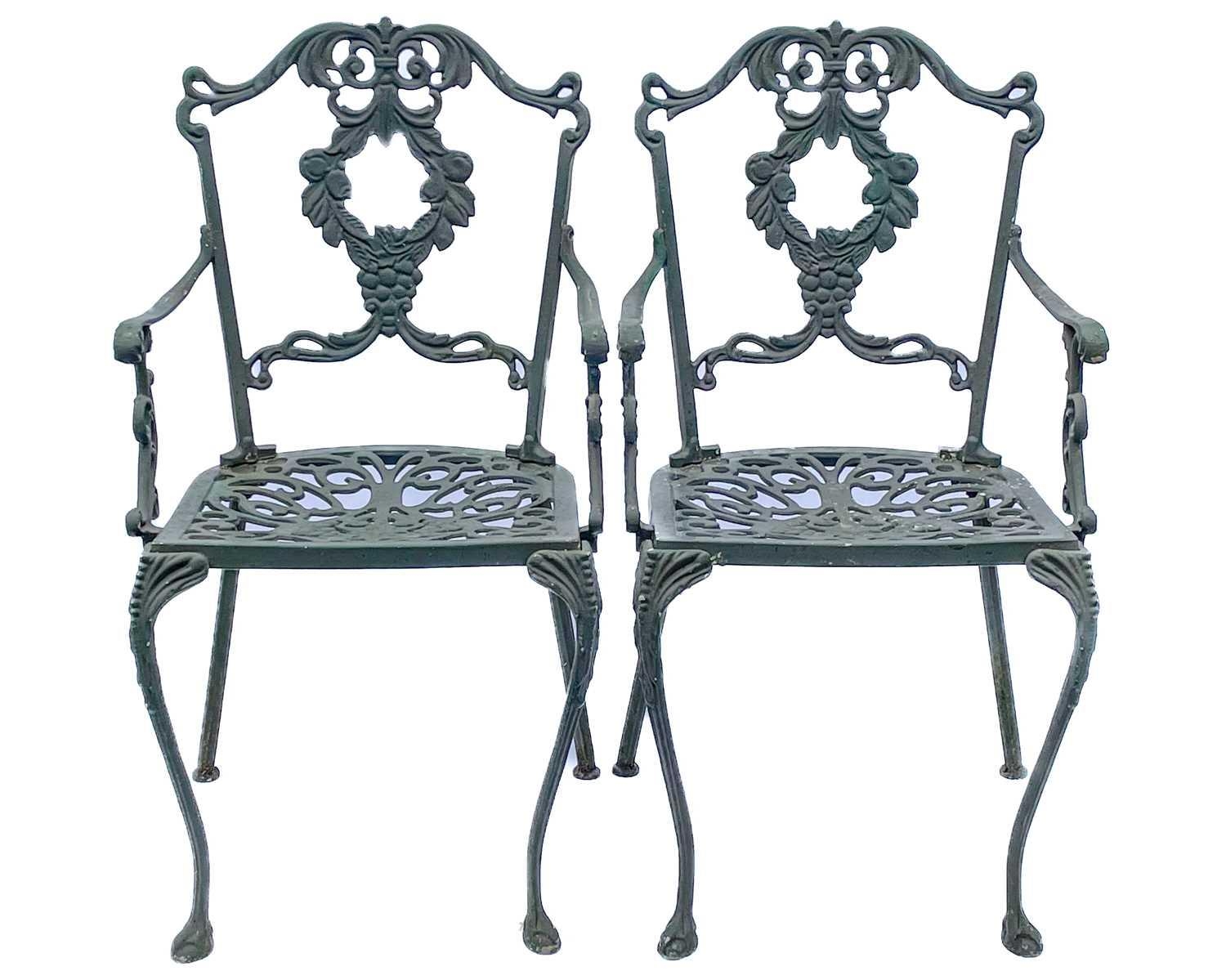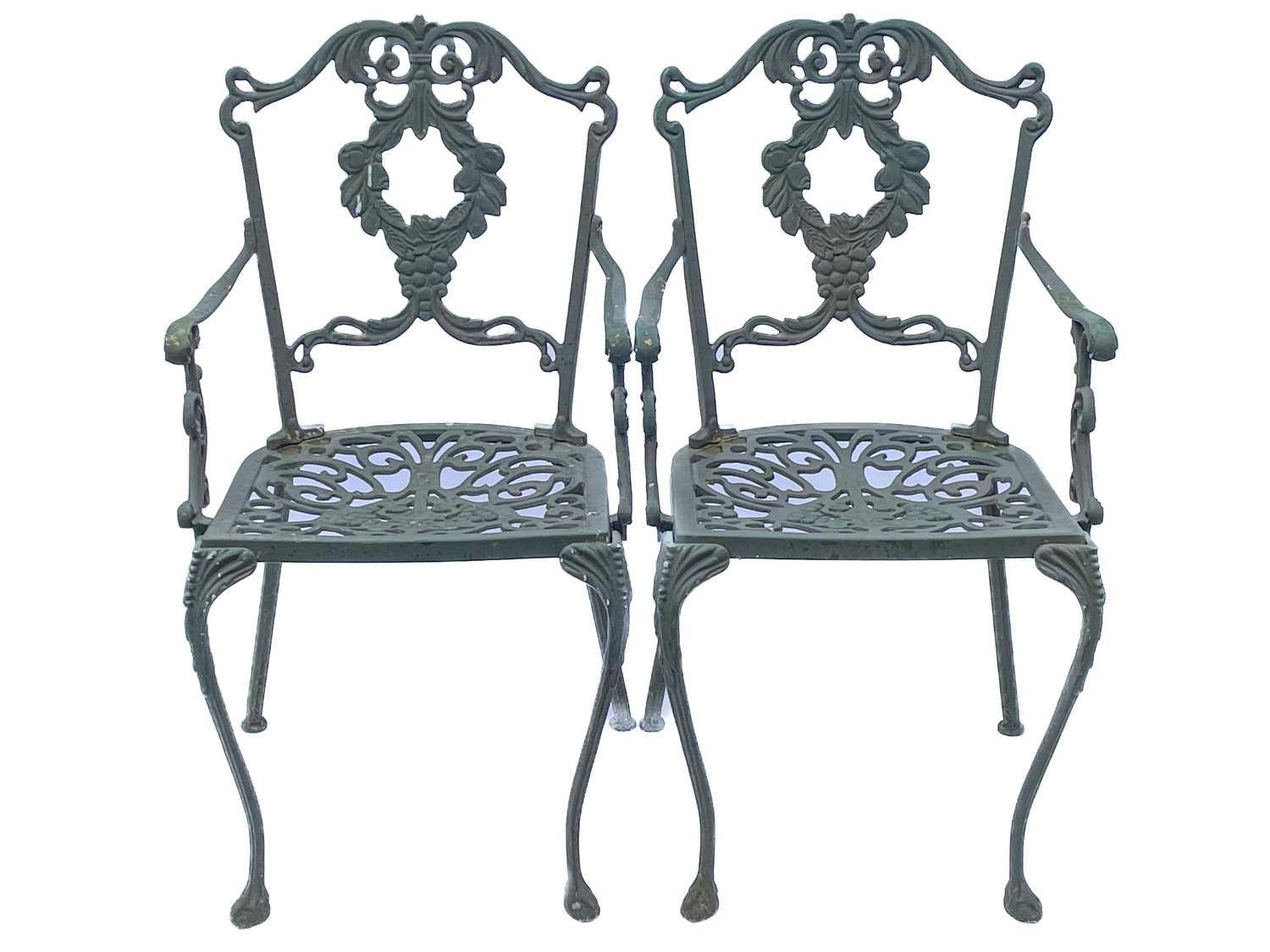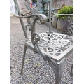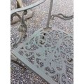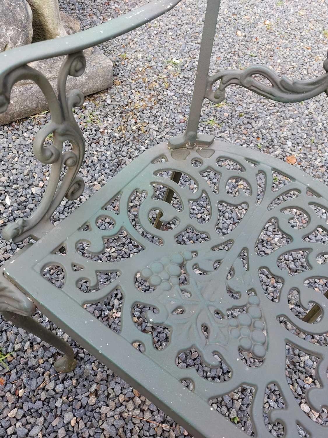 A green painted metal bistro set. Comprising a circular table, height 68.5cm, diameter 80cm, and four chairs (5).