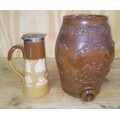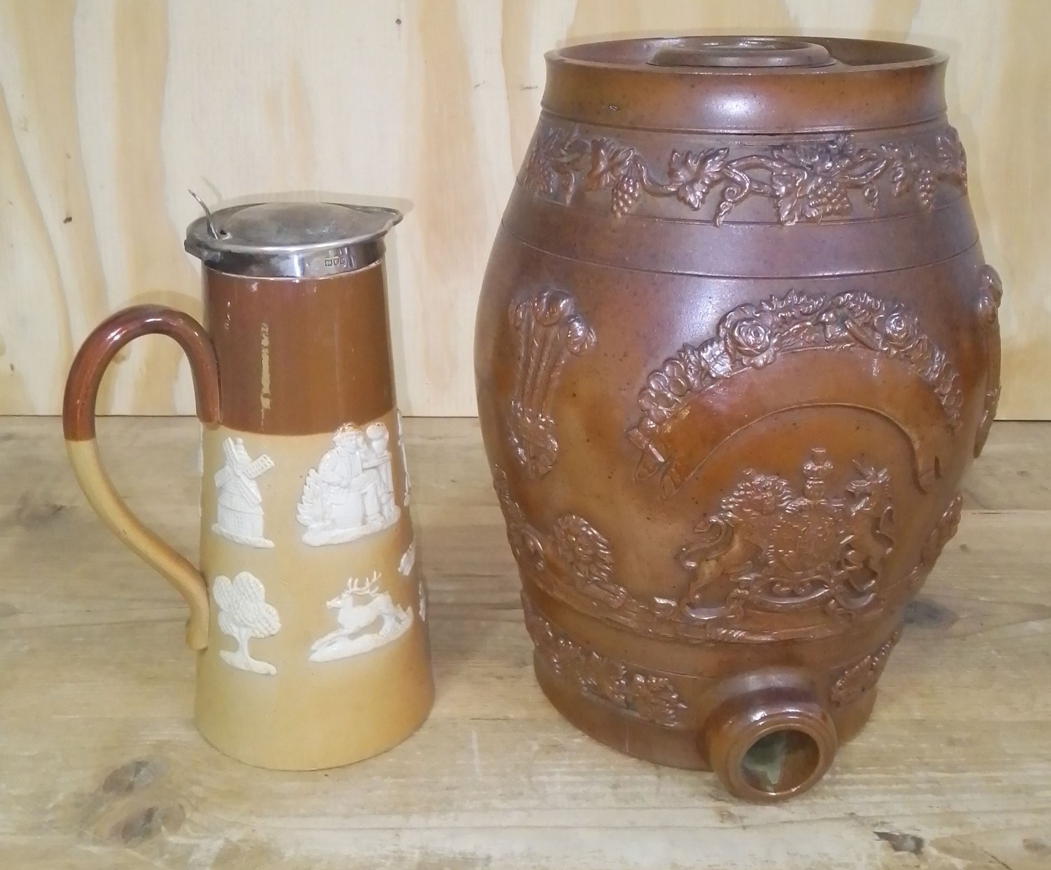 A salt glazed spirit barrel with royal crest and a Doulton Lambeth jug with hallmarked silver top.