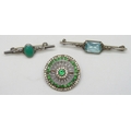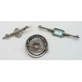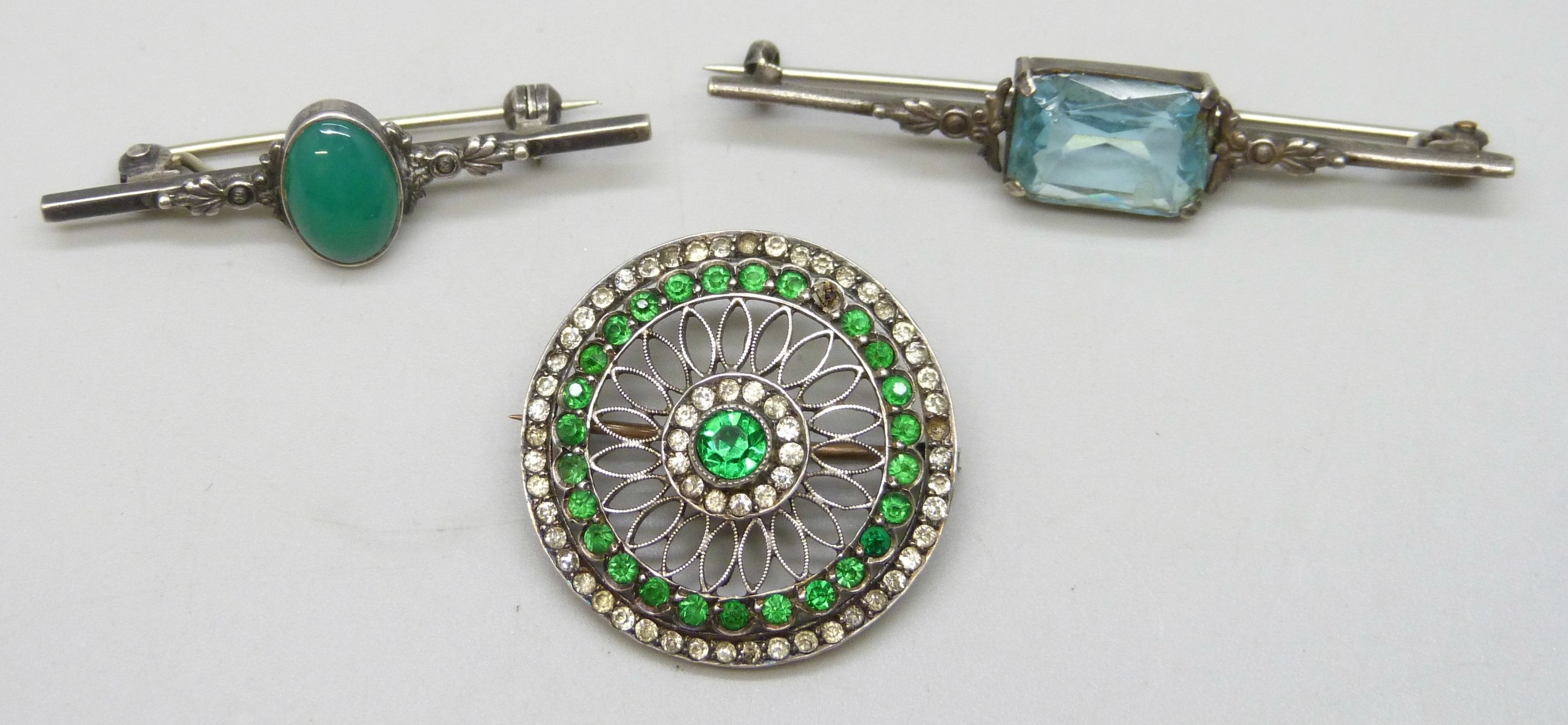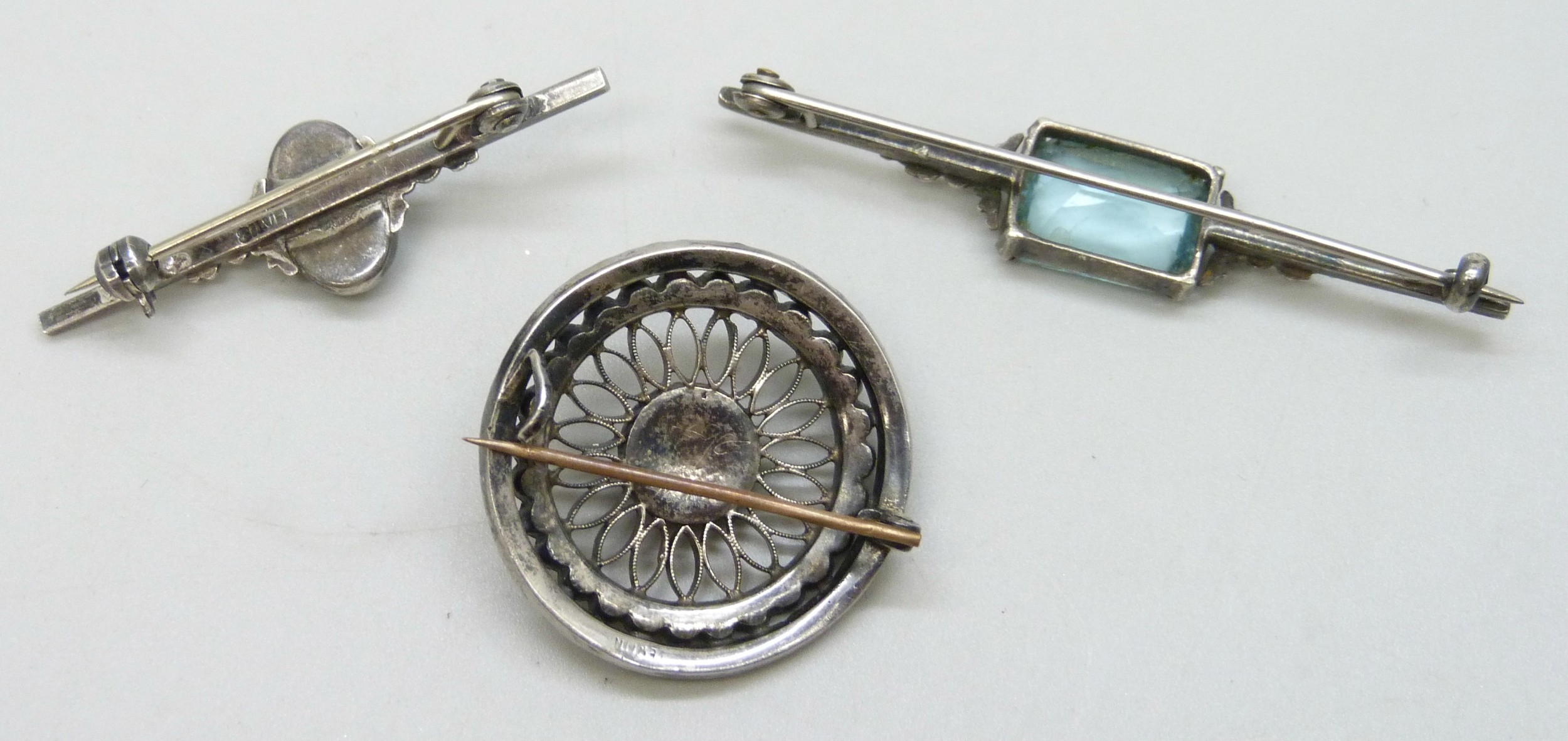 Three silver brooches, the circular example missing a stone, 2.9cm, stone a/f on blue stone example, 16g total