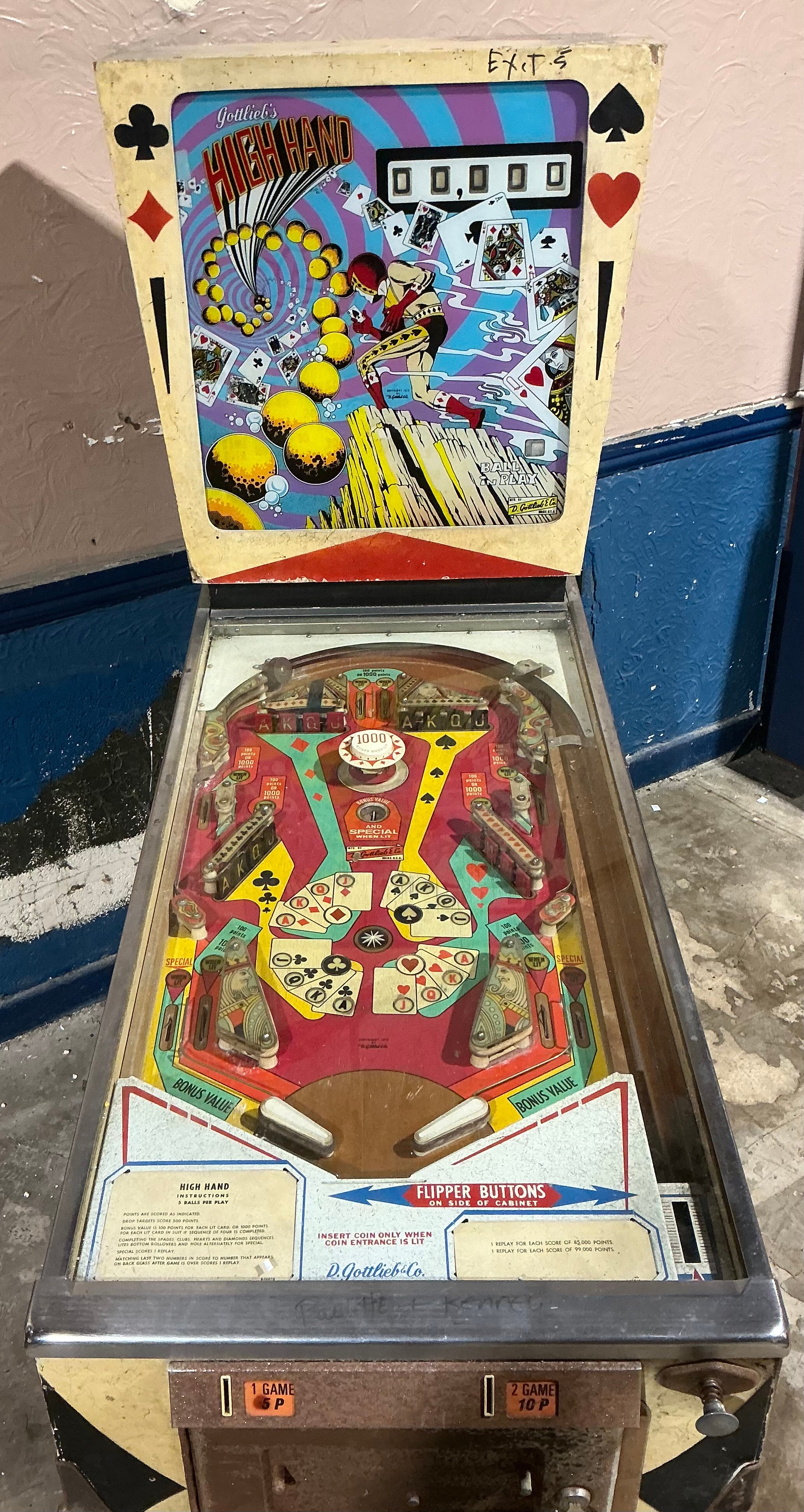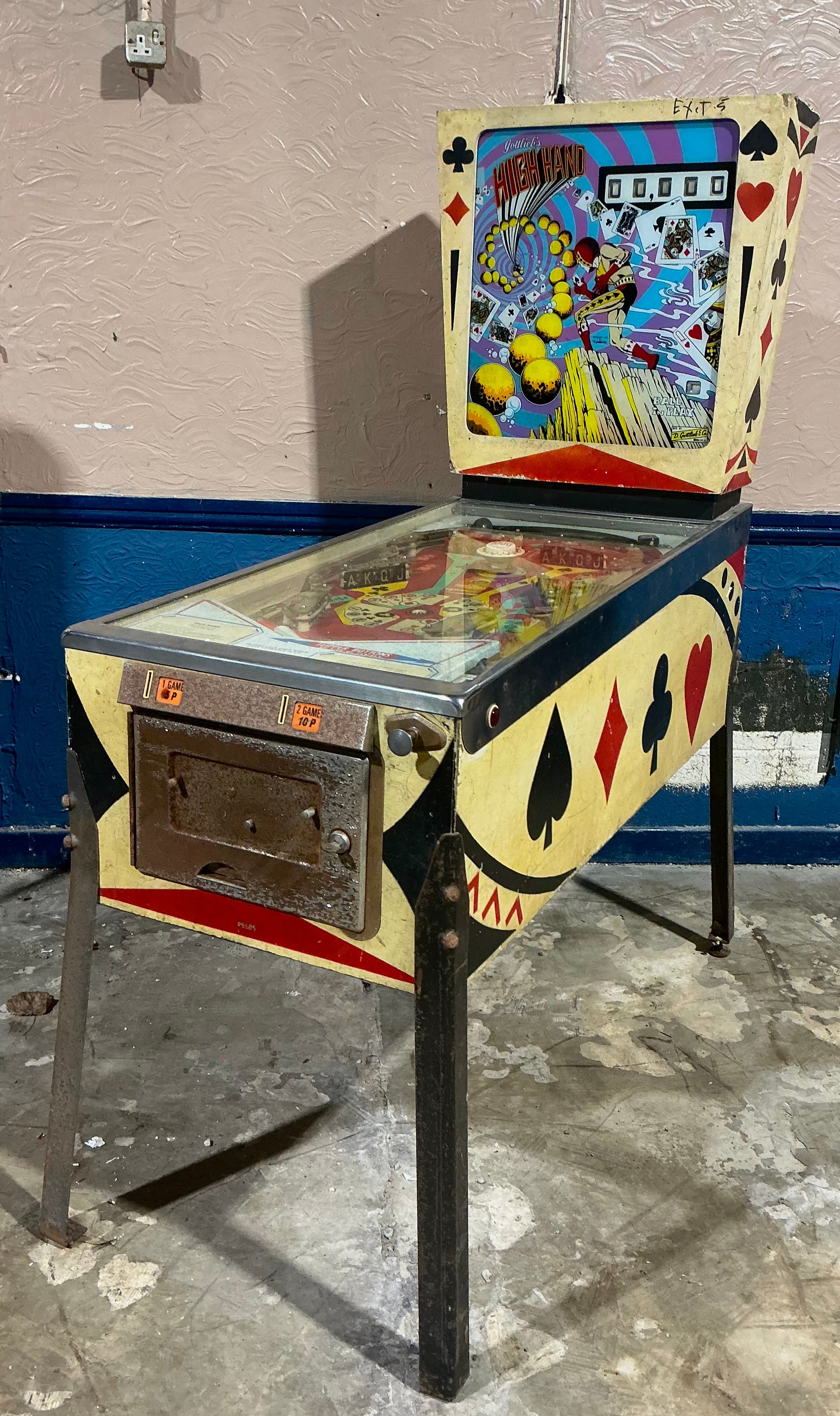 Vintage Arcade - an American pinball machine, Gottlieb’s High Hand, by D Gottlieb & Co, Illinois, the coin slot panel inscribed MANUFACTURED FOR MONDIAL EXCLUSIVELY FOR EXPORT, 167.5cm high, 66cm wide, 141cm deep, c.1973