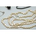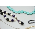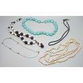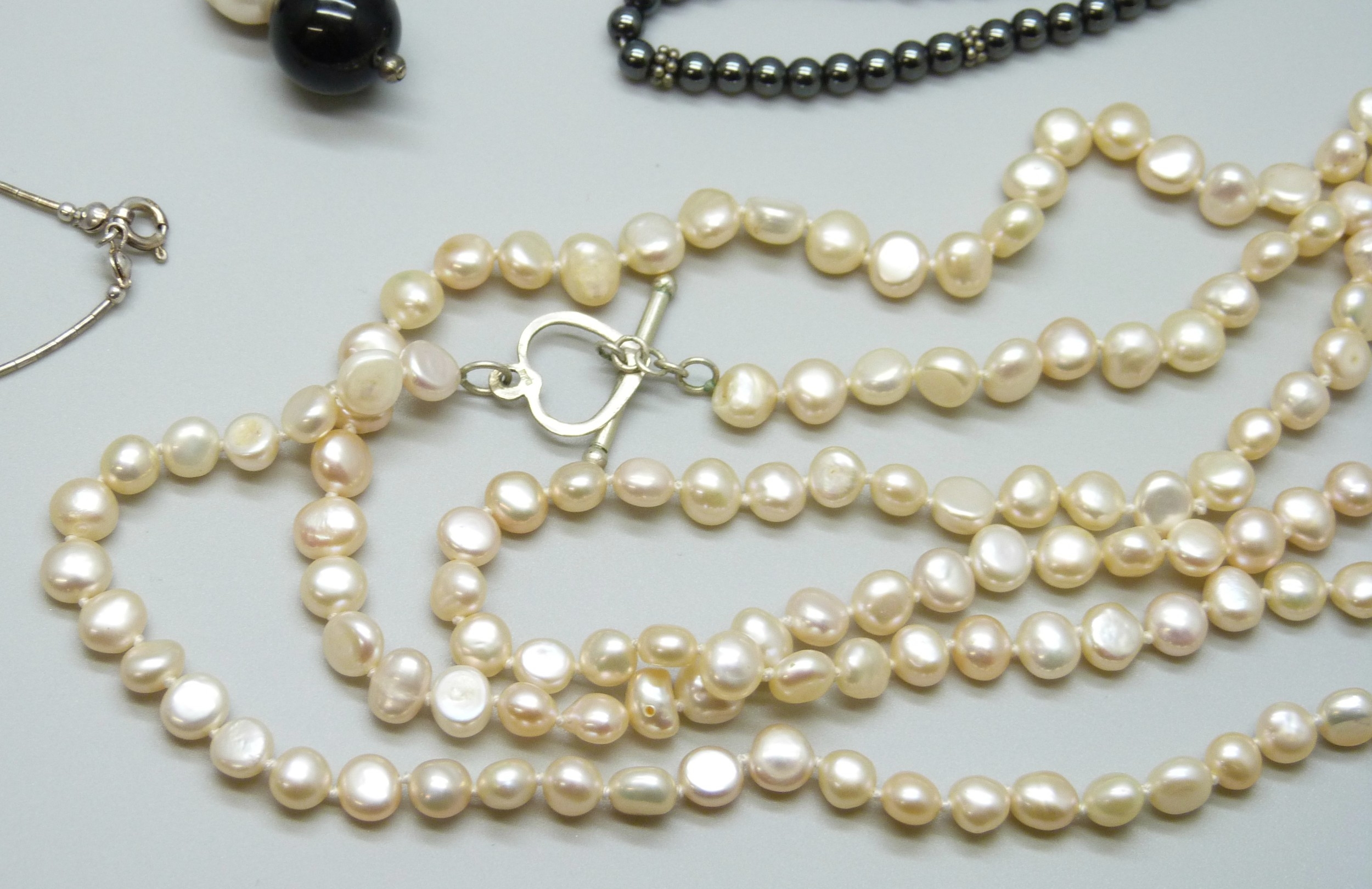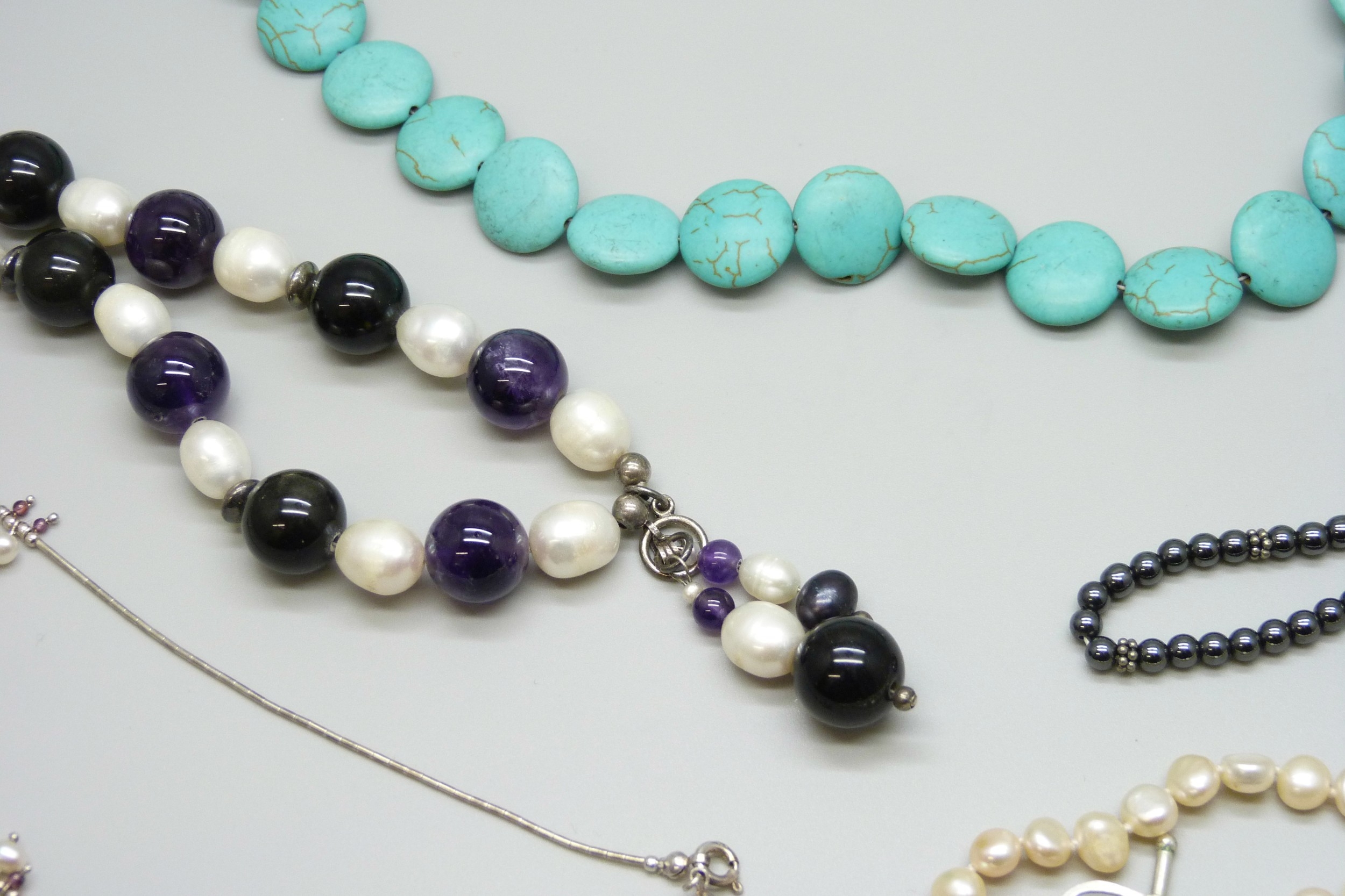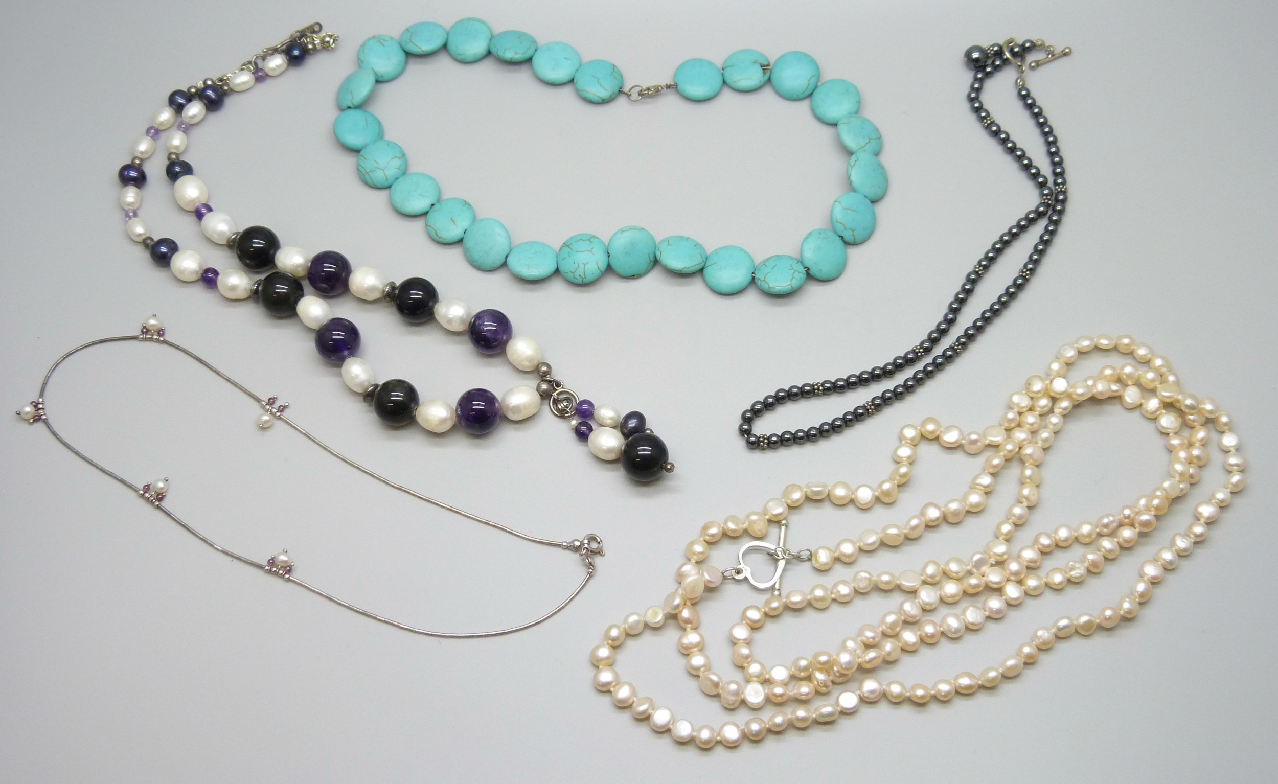 A large pearl and amethyst necklace, a hematite necklace with a white metal clasp, tests as silver, and a silver pearl and garnet necklace, another long pearl necklace, and a turquoise style necklace, 196g total