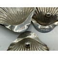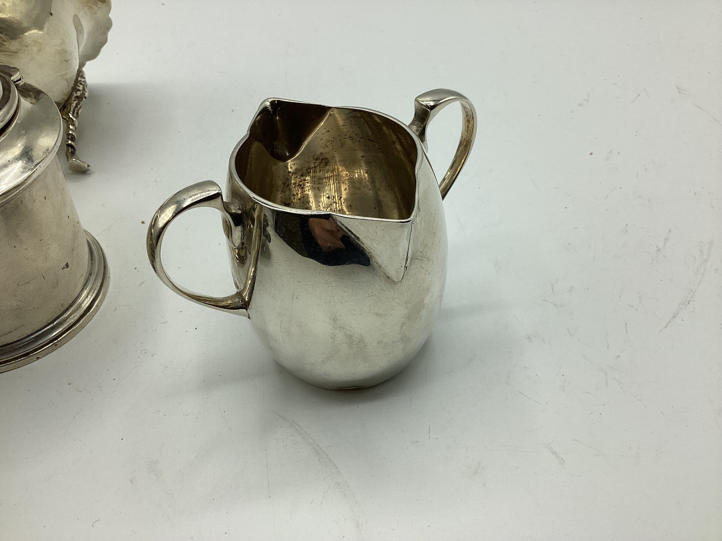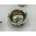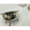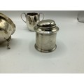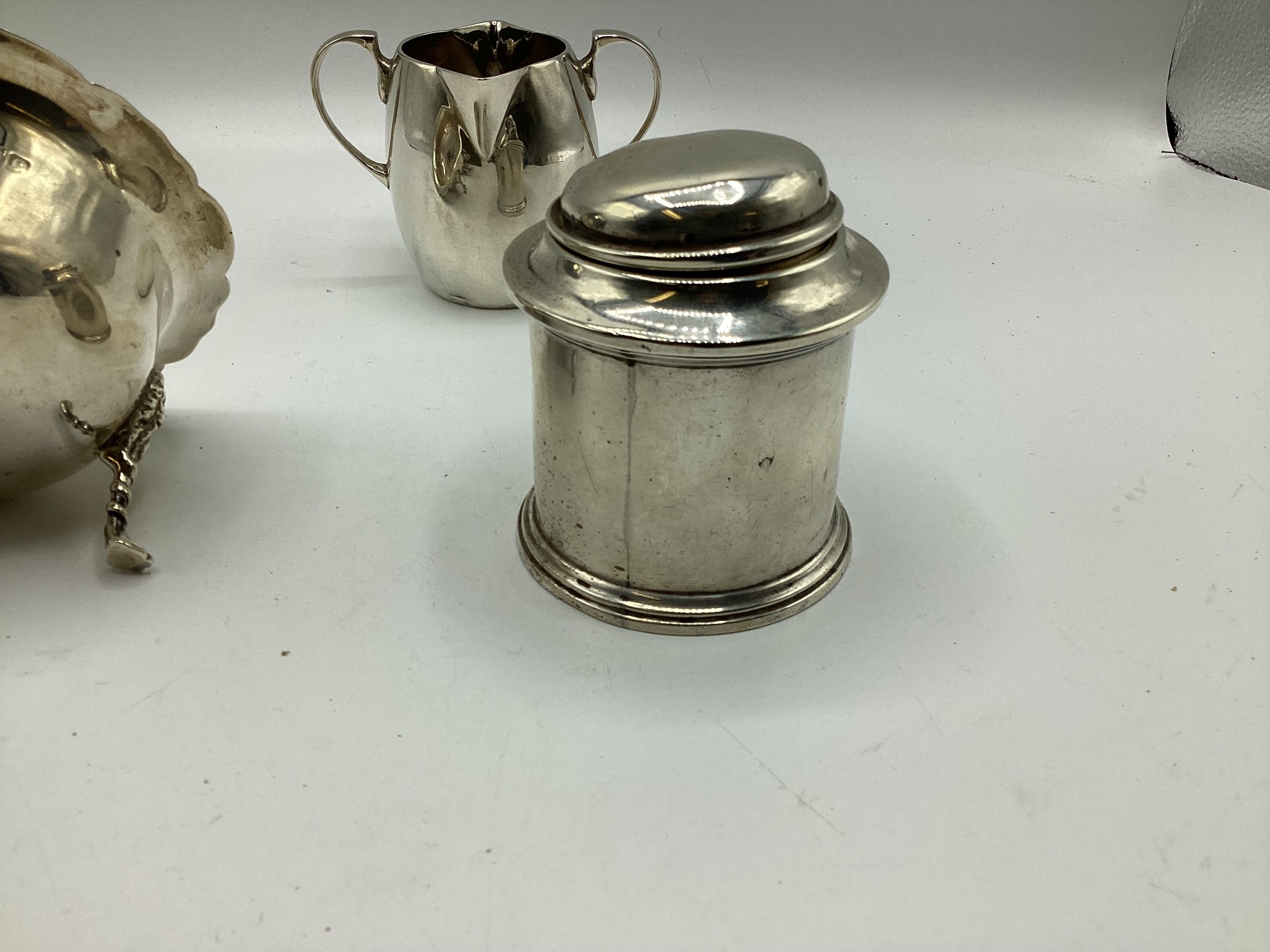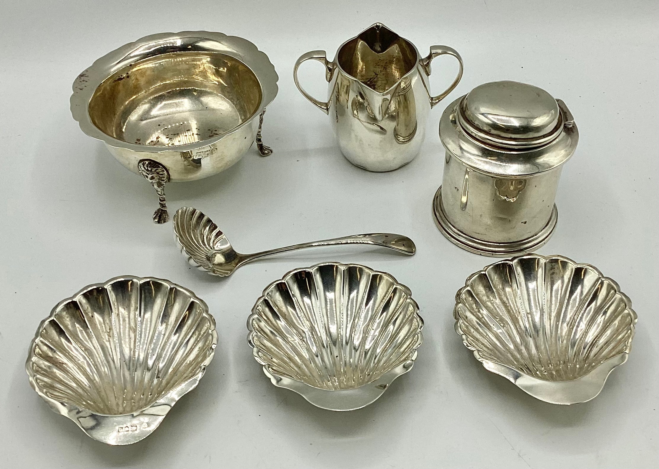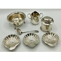 Collection of small sterling silver items, to include three scallop shaped dishes, cream jug, footed bowl and lidded put, various dates and makers. 495 g