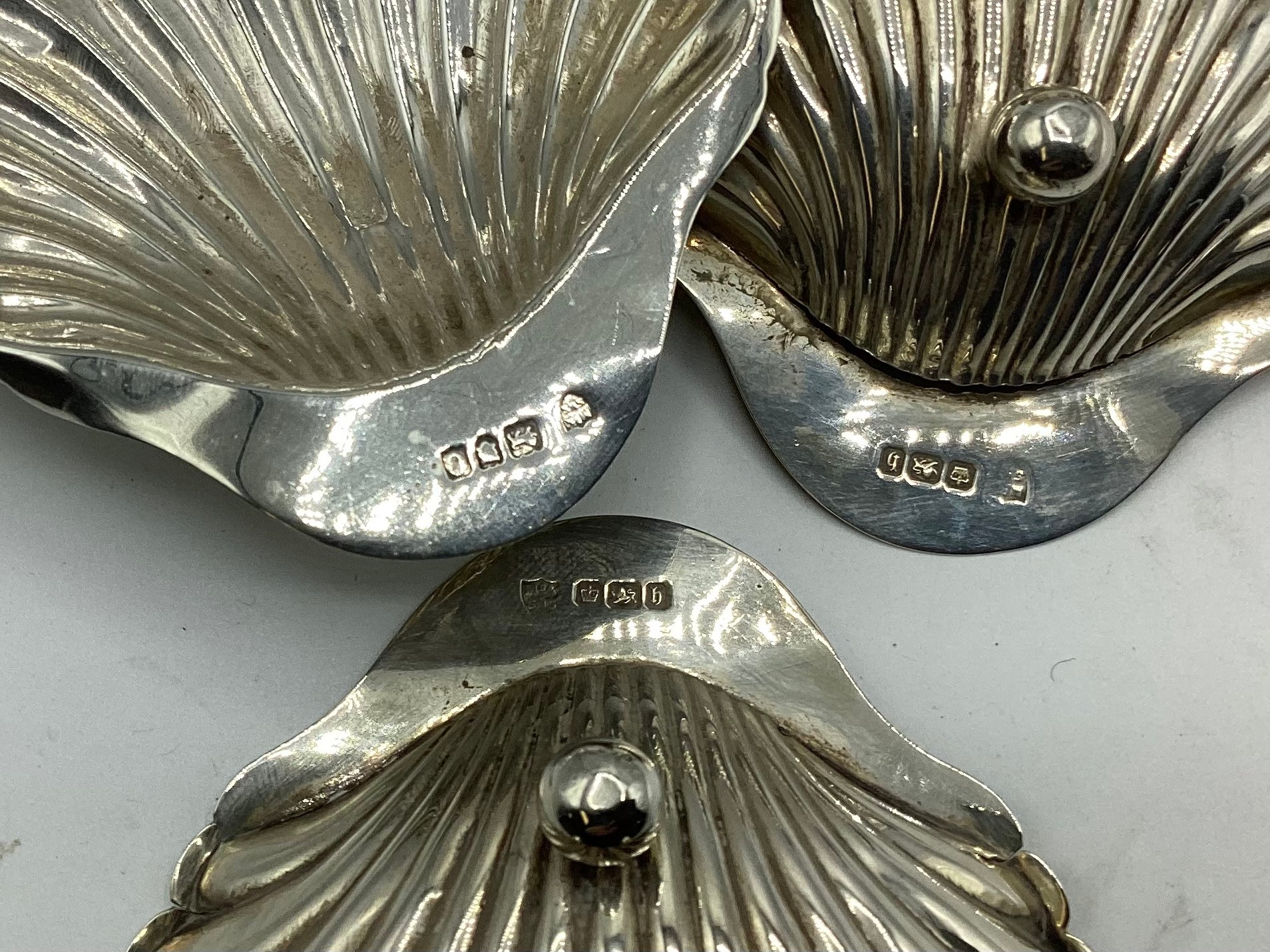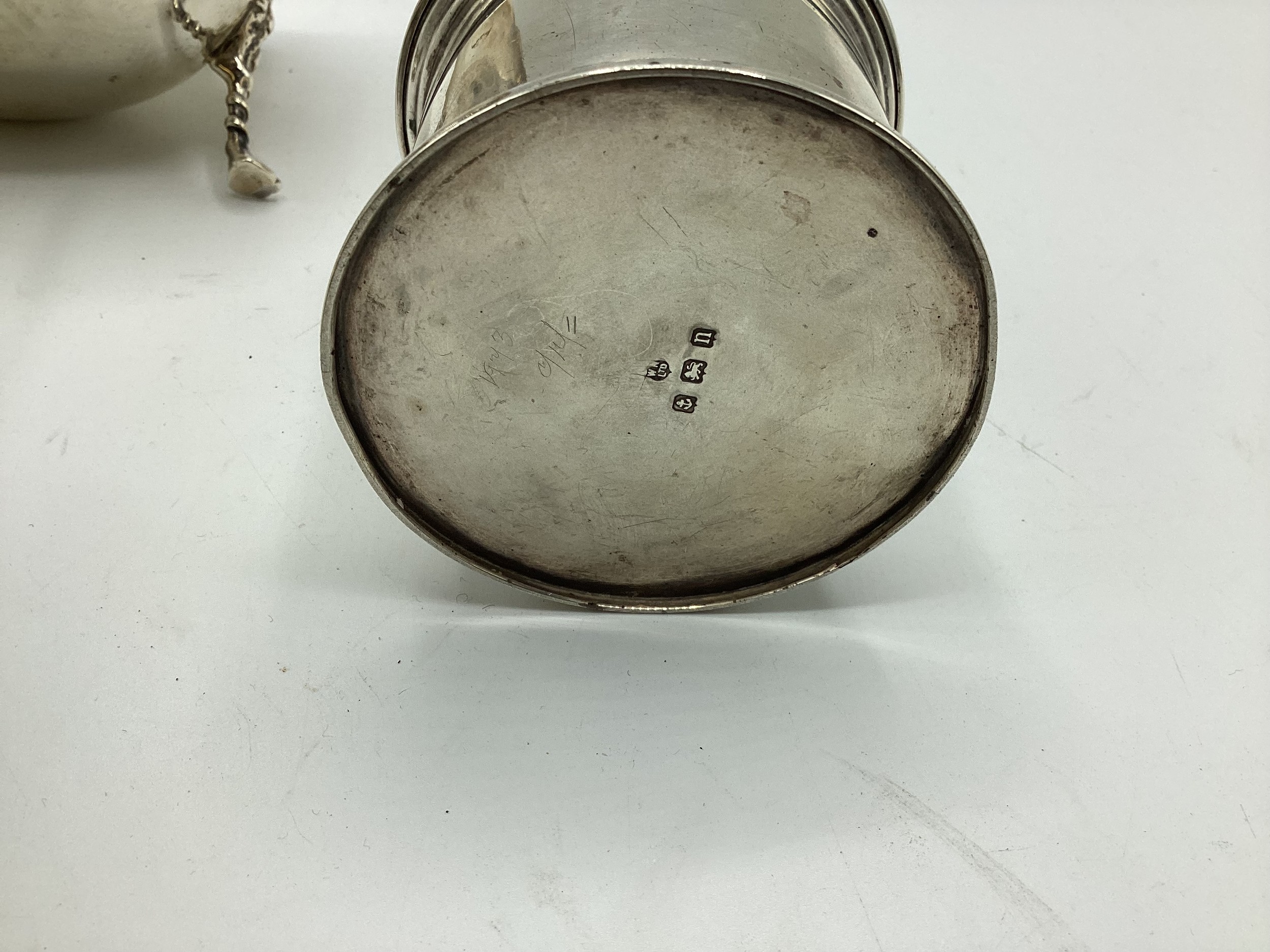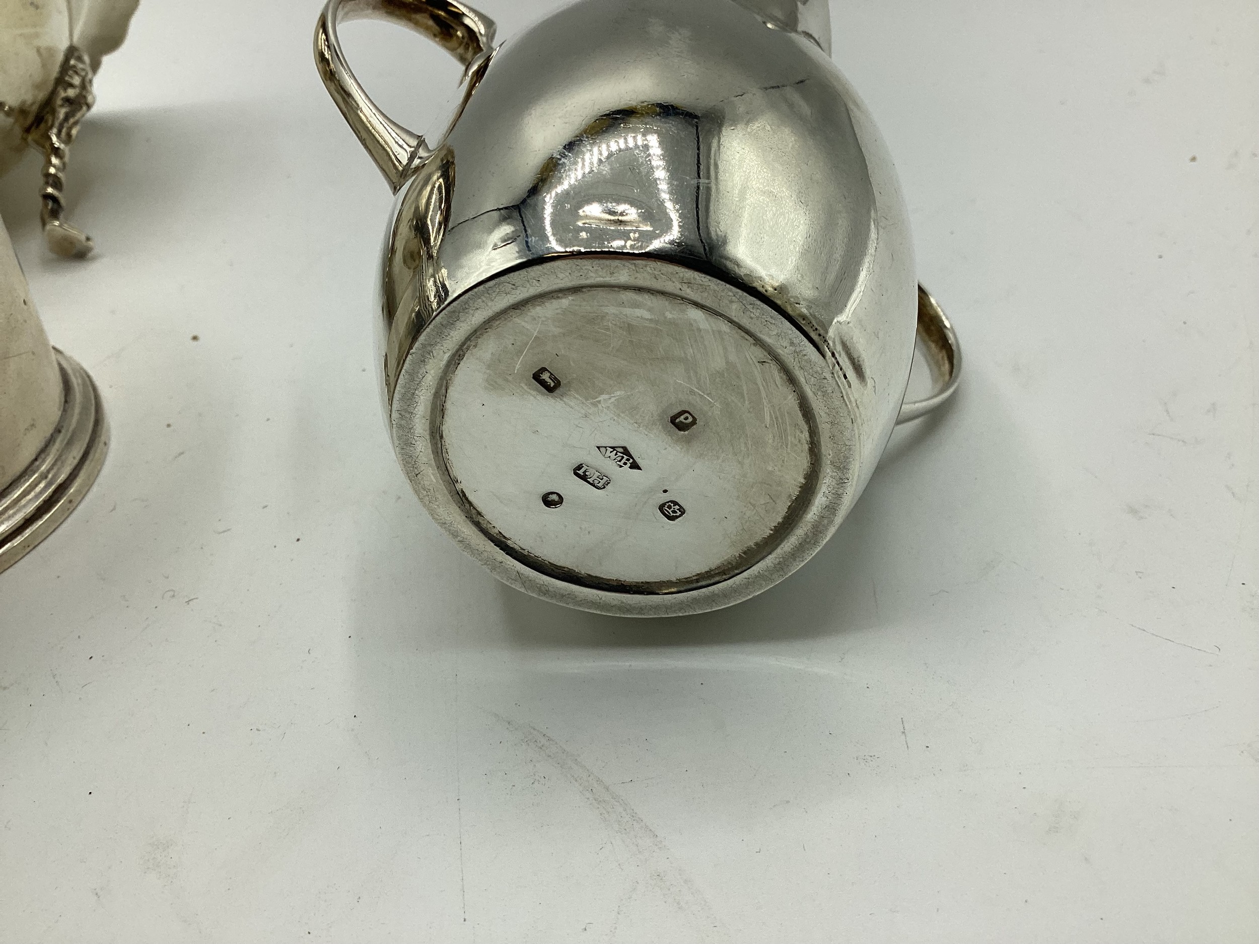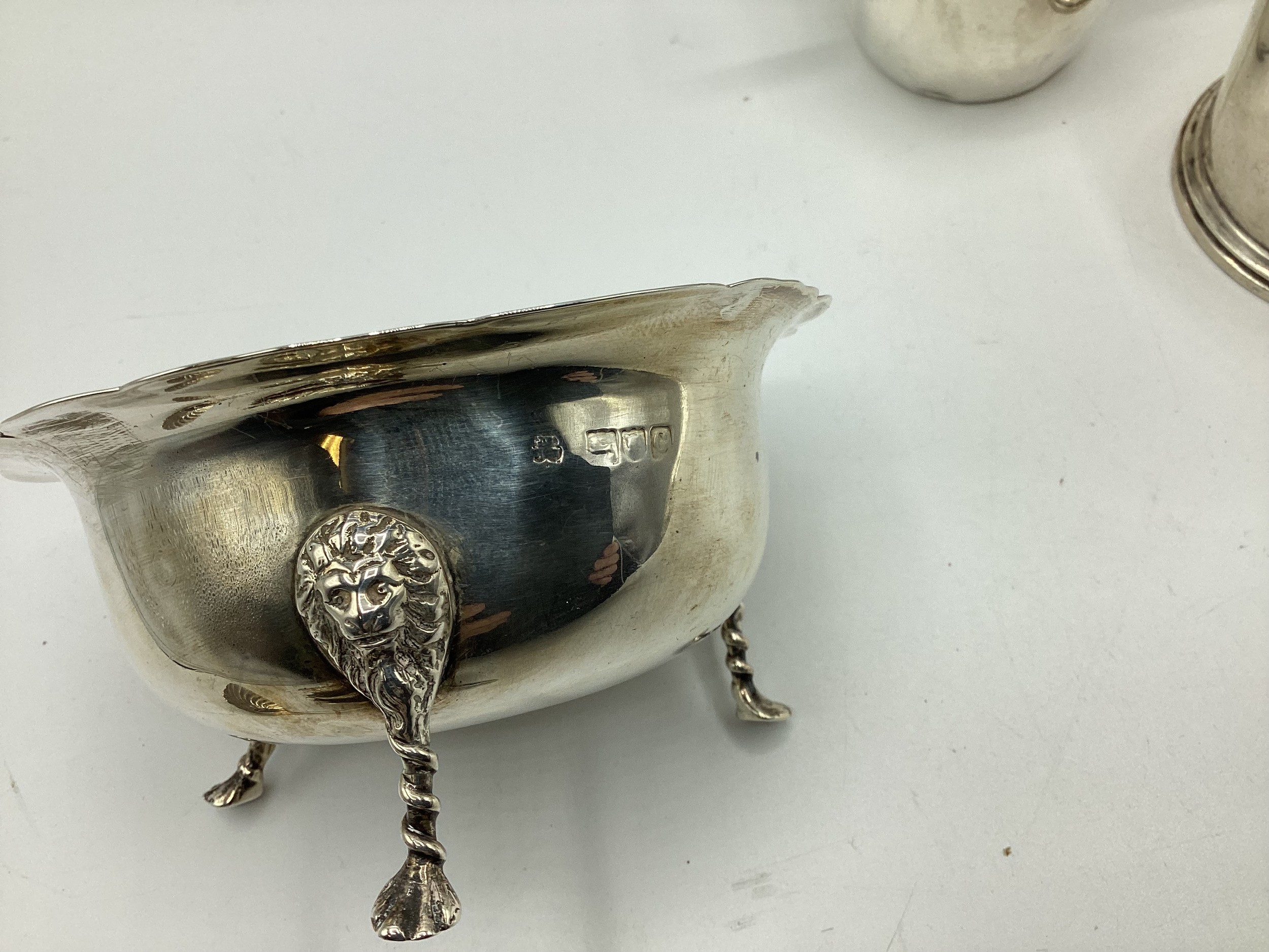 Collection of small sterling silver items, to include three scallop shaped dishes, cream jug, footed bowl and lidded put, various dates and makers. 495 g