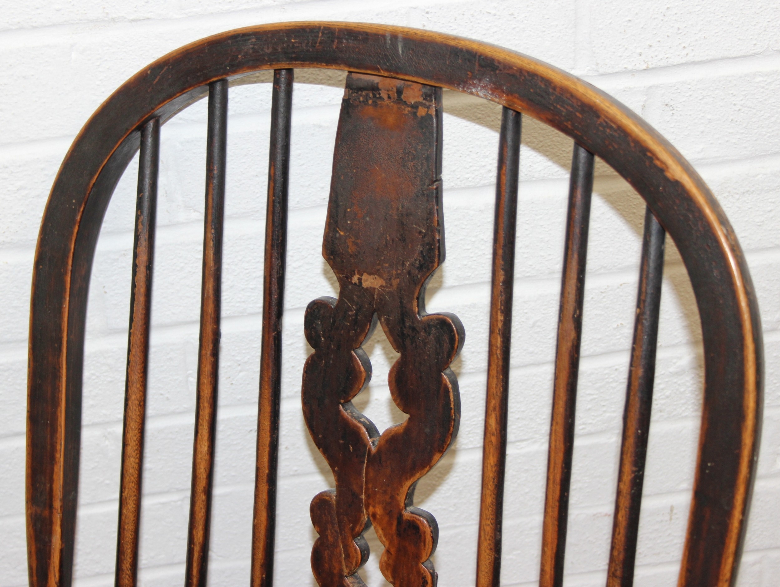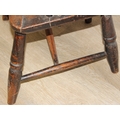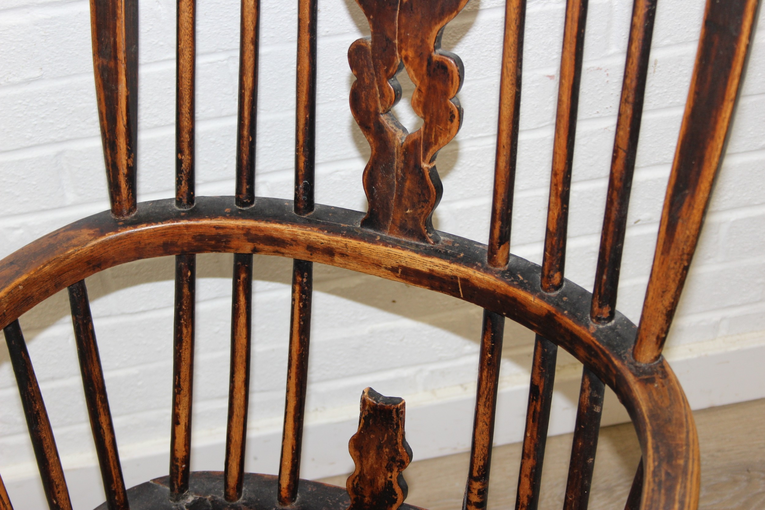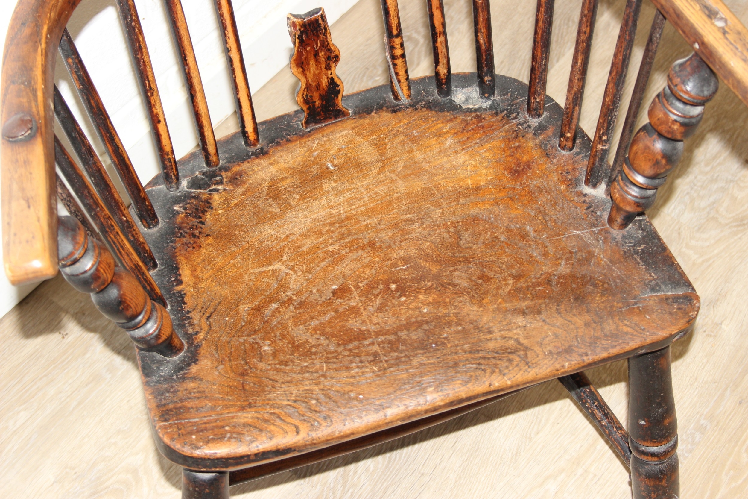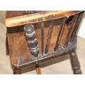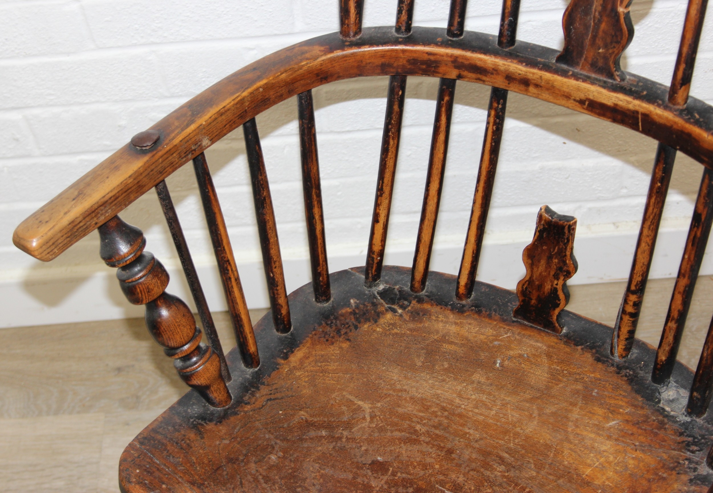 An antique farmhouse stick-back Windsor armchair with elm seat, 19th century, with some very rustic blacksmith made iron baton repairs, 58cm wide x 107cm tall