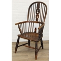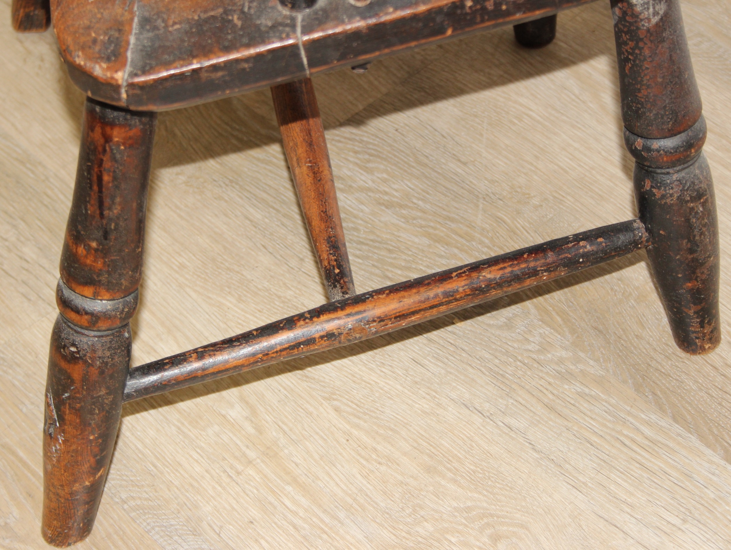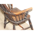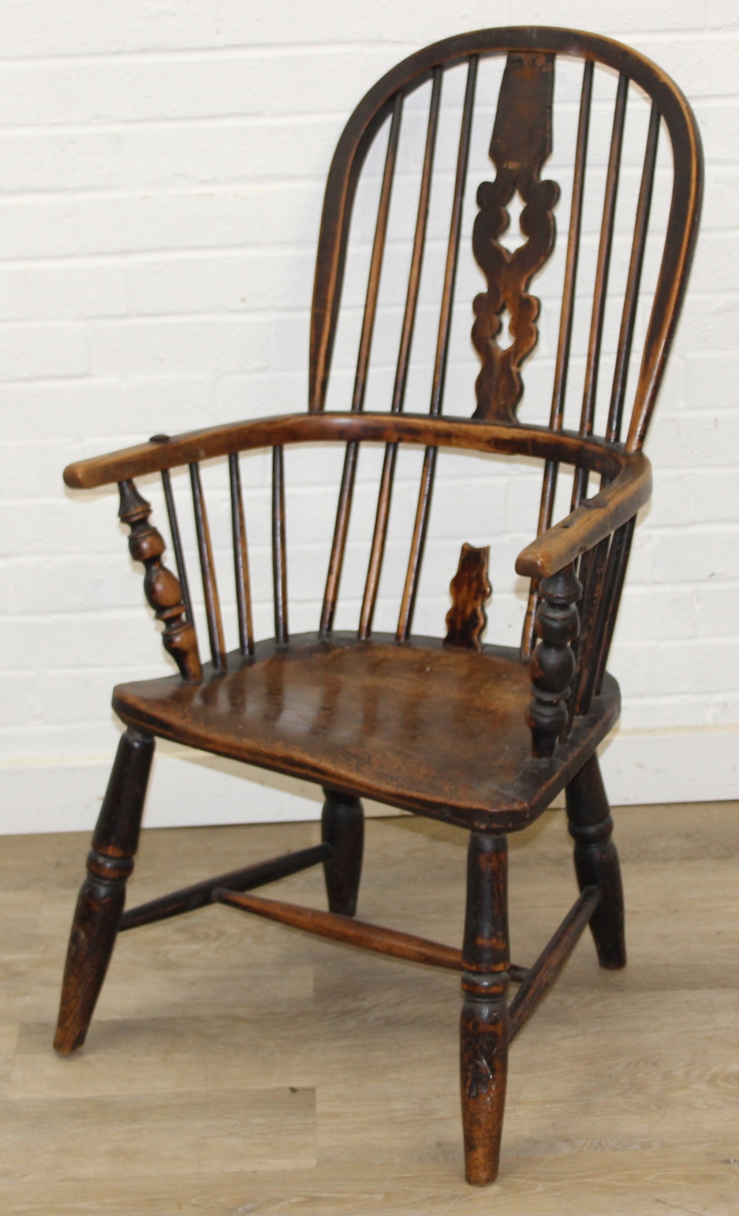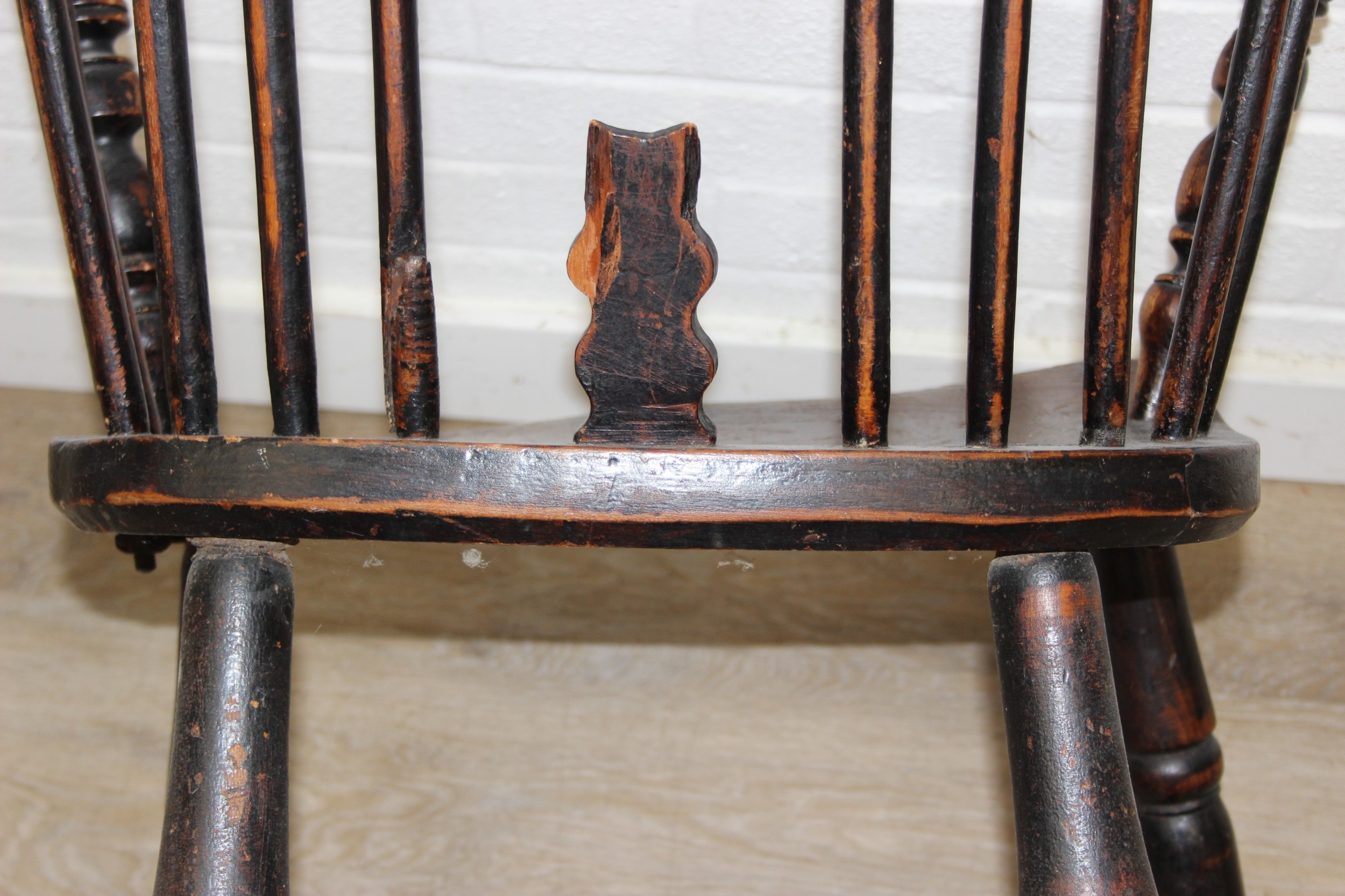 An antique farmhouse stick-back Windsor armchair with elm seat, 19th century, with some very rustic blacksmith made iron baton repairs, 58cm wide x 107cm tall