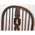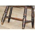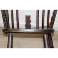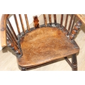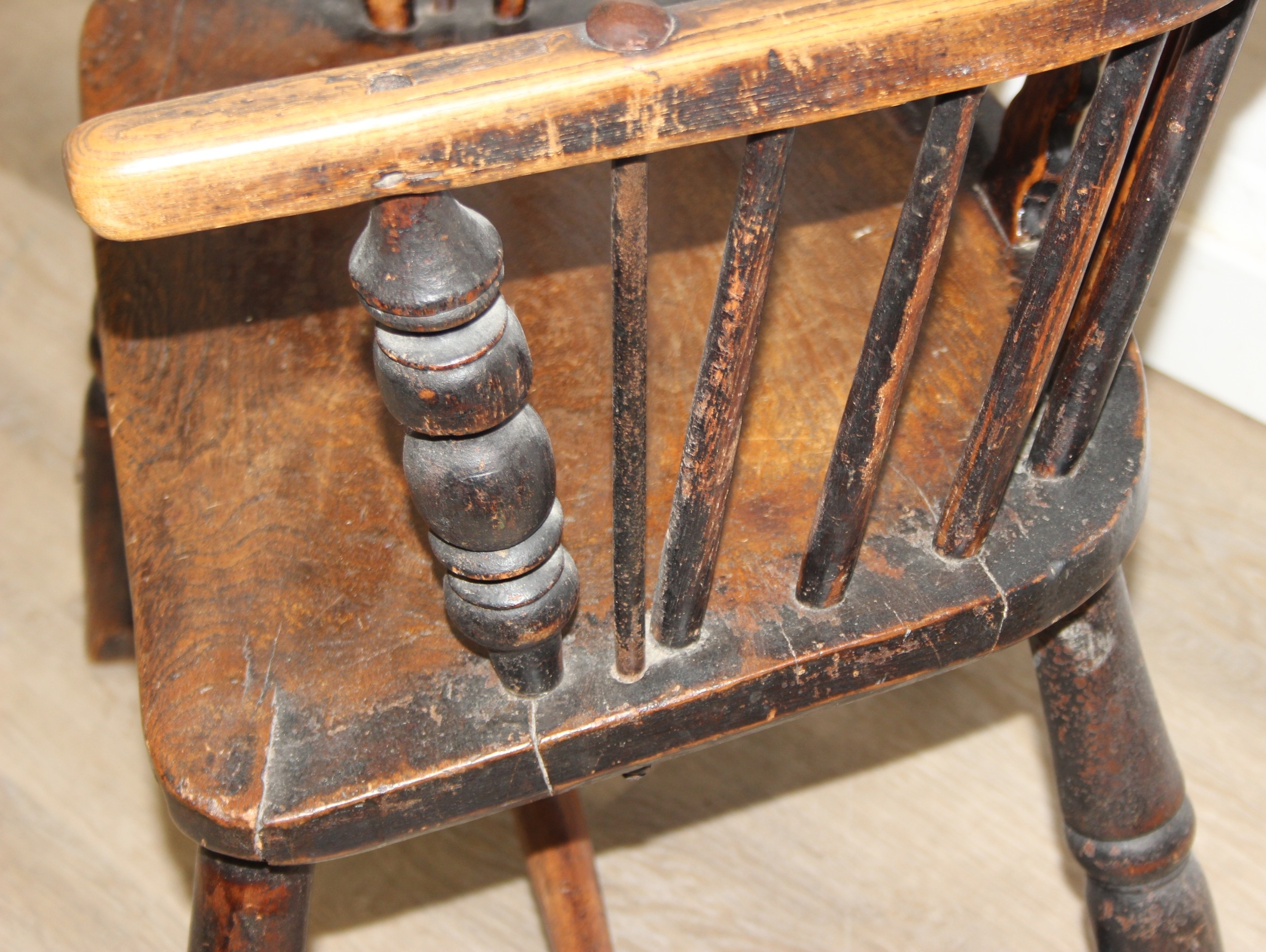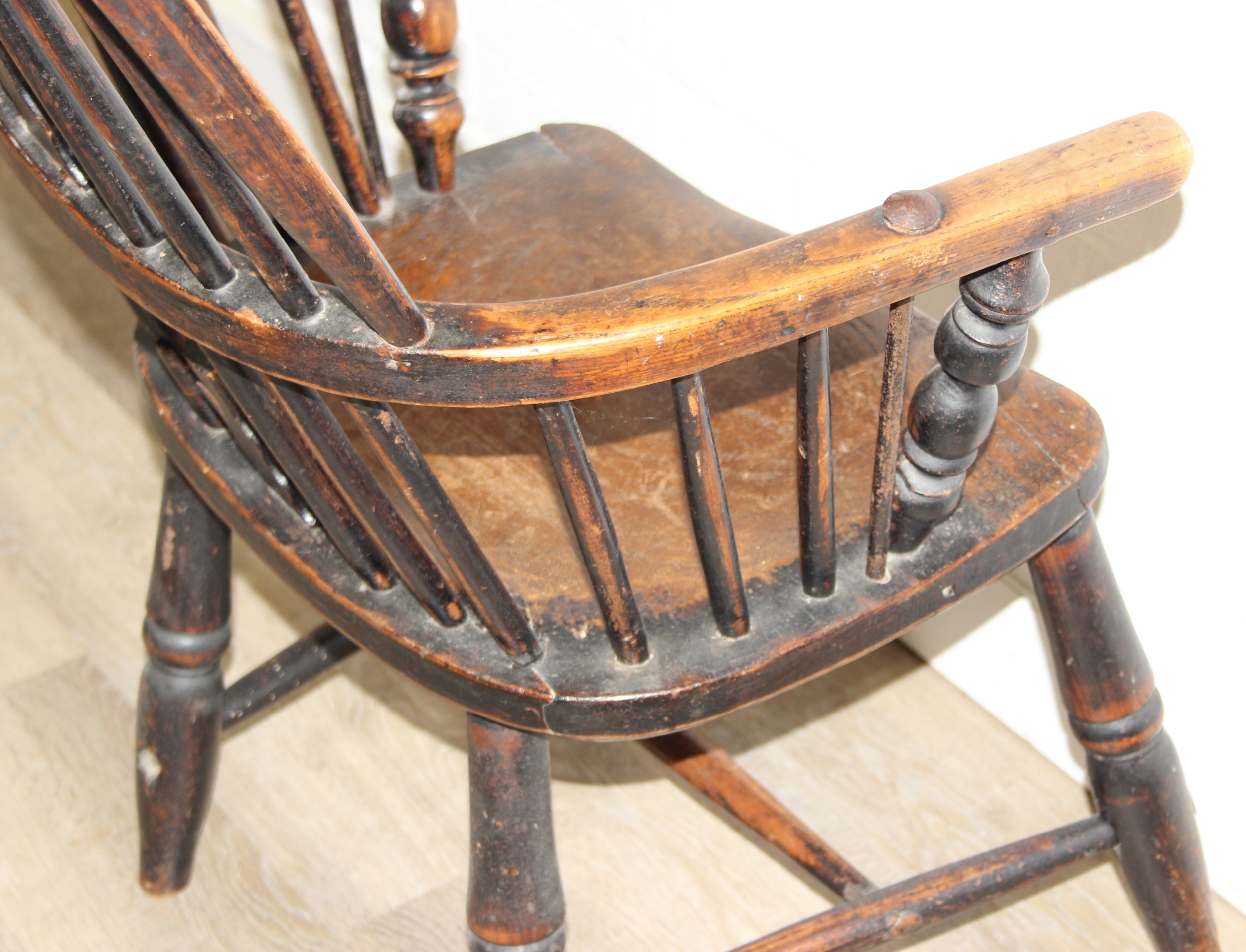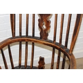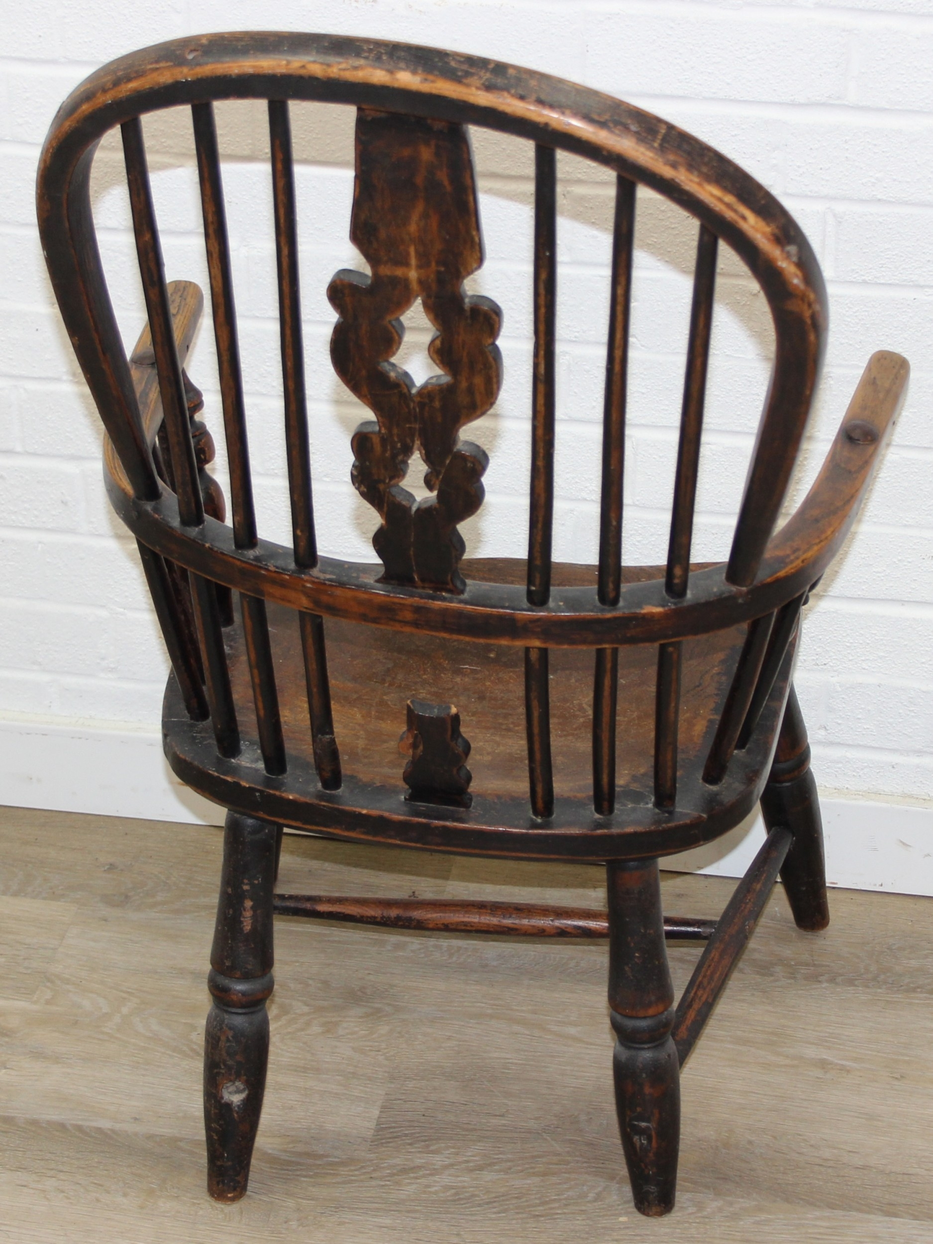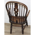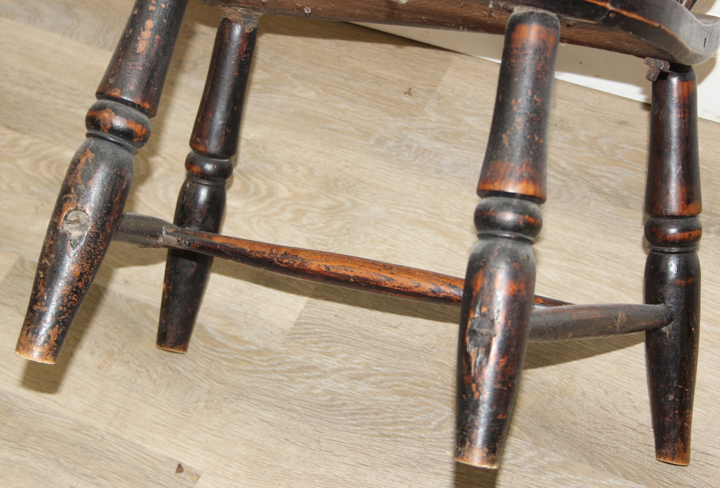 An antique farmhouse stick-back Windsor armchair with elm seat, 19th century, with some very rustic blacksmith made iron baton repairs, 58cm wide x 107cm tall